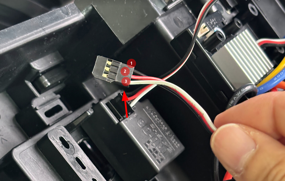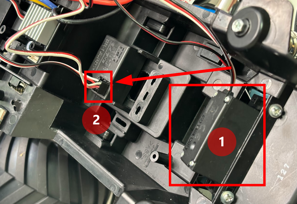 問題なく動いたらTAMIYA 1/12RC XB ランチボックスカーのサーボに繋いてみましょう。①のサーボの3ピンは②に接続されています。