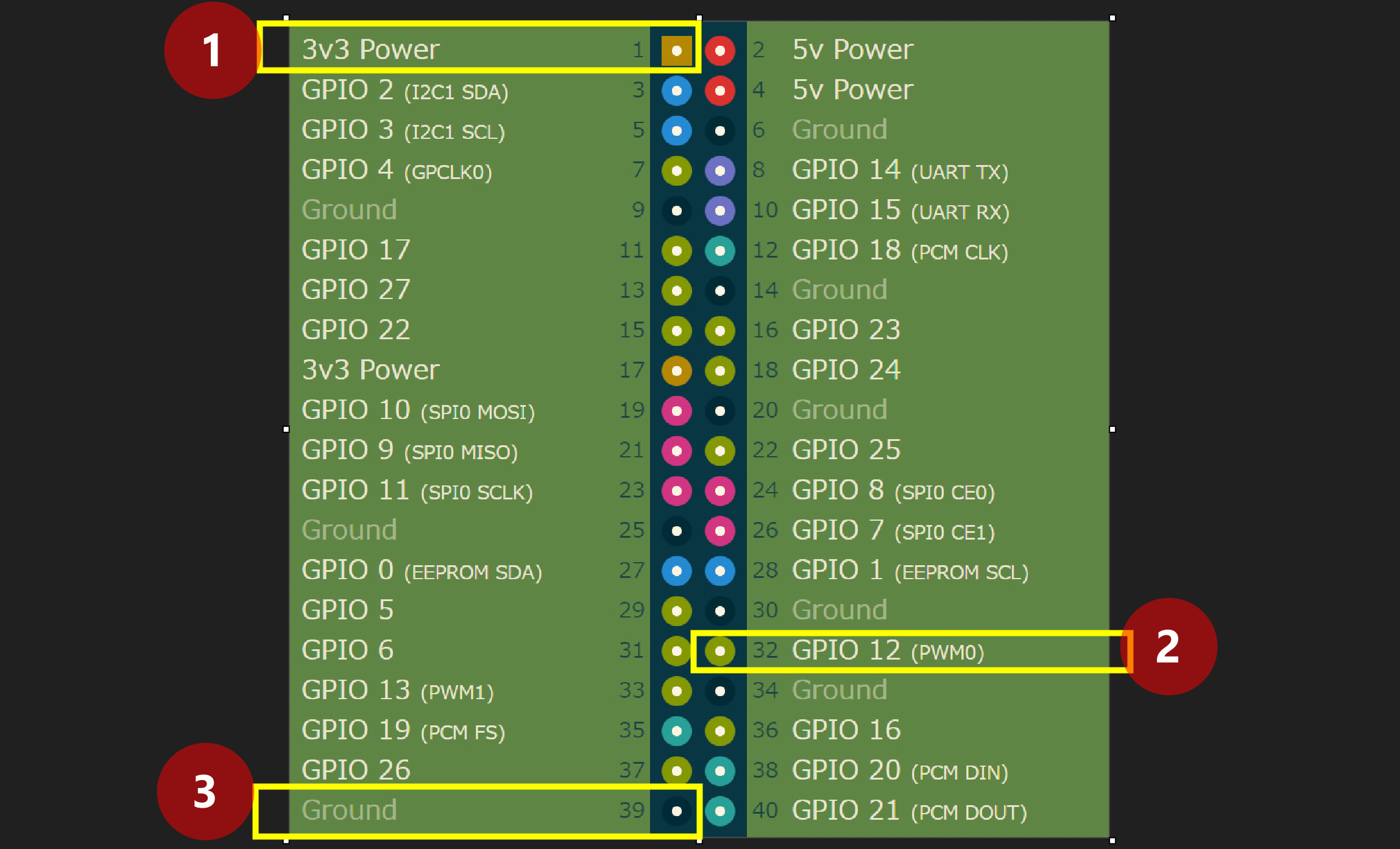 GPIOは以下を使います。縦ですが、実機と比べるときは左に回転して比較してください。①3.3V、②GPIO12、③GNDです。