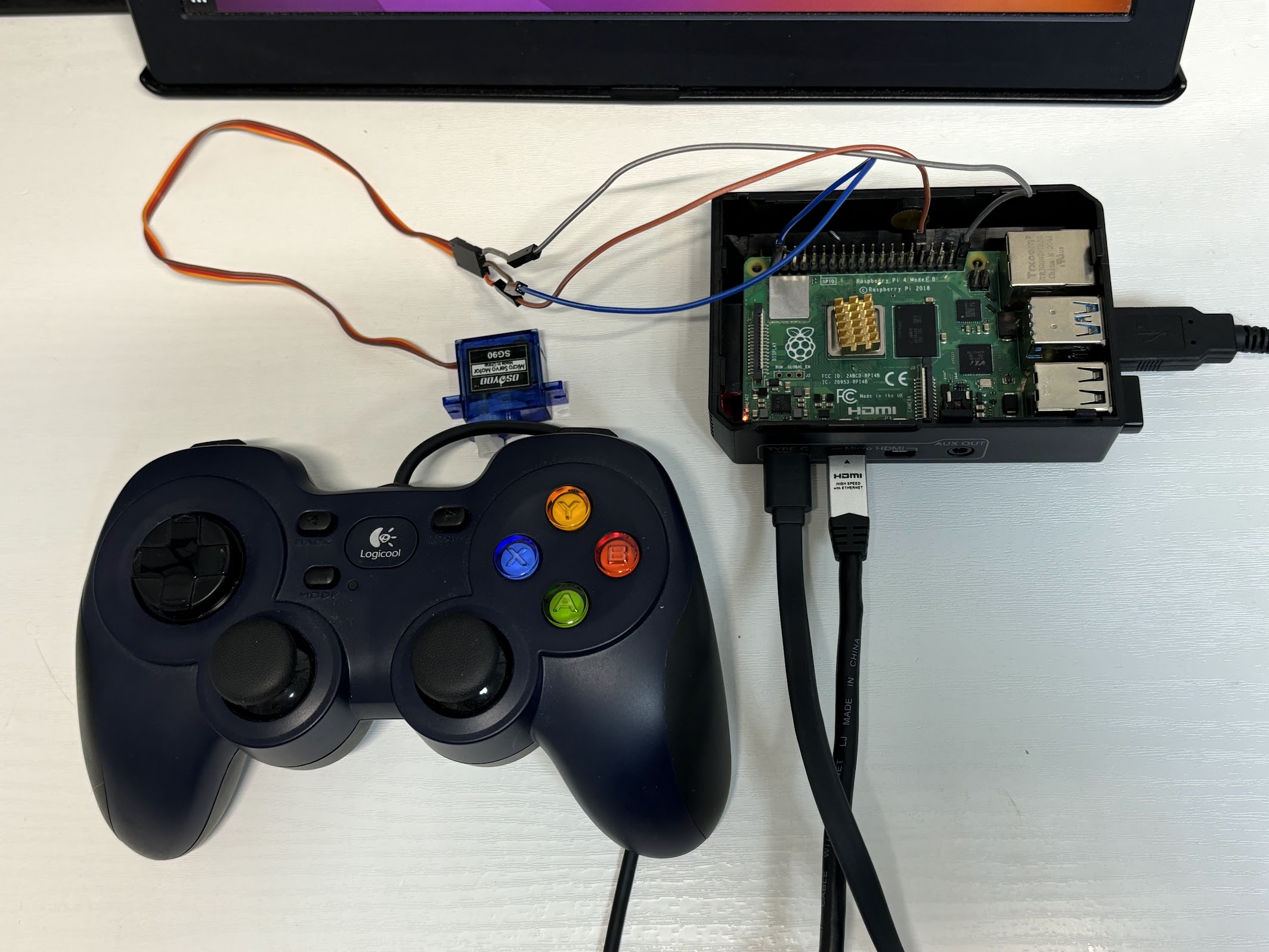 サーボモーターはSG90です。安価なサーボモーターです。USBゲームパット、Raspberry Pi 4、Python、サーボモーターを使うことで全体の検証ができます。
