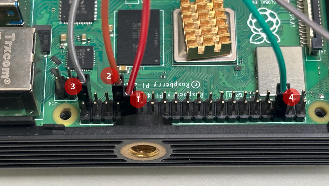 Groundは適当なピンから③④から取りました。GPIO12①をサーボに、GPIO13②をモータに接続します。サーボやモーターへの電源は、受信機 (TRU-08)から取り回します。 サーボ側の3ピン(黒、赤、白)も、黒はGround、赤は電源、白はPWMです。 ESC側(モーター)の3ピン(黒、赤、白)は、黒はGround、赤は電源、白はPWMです。