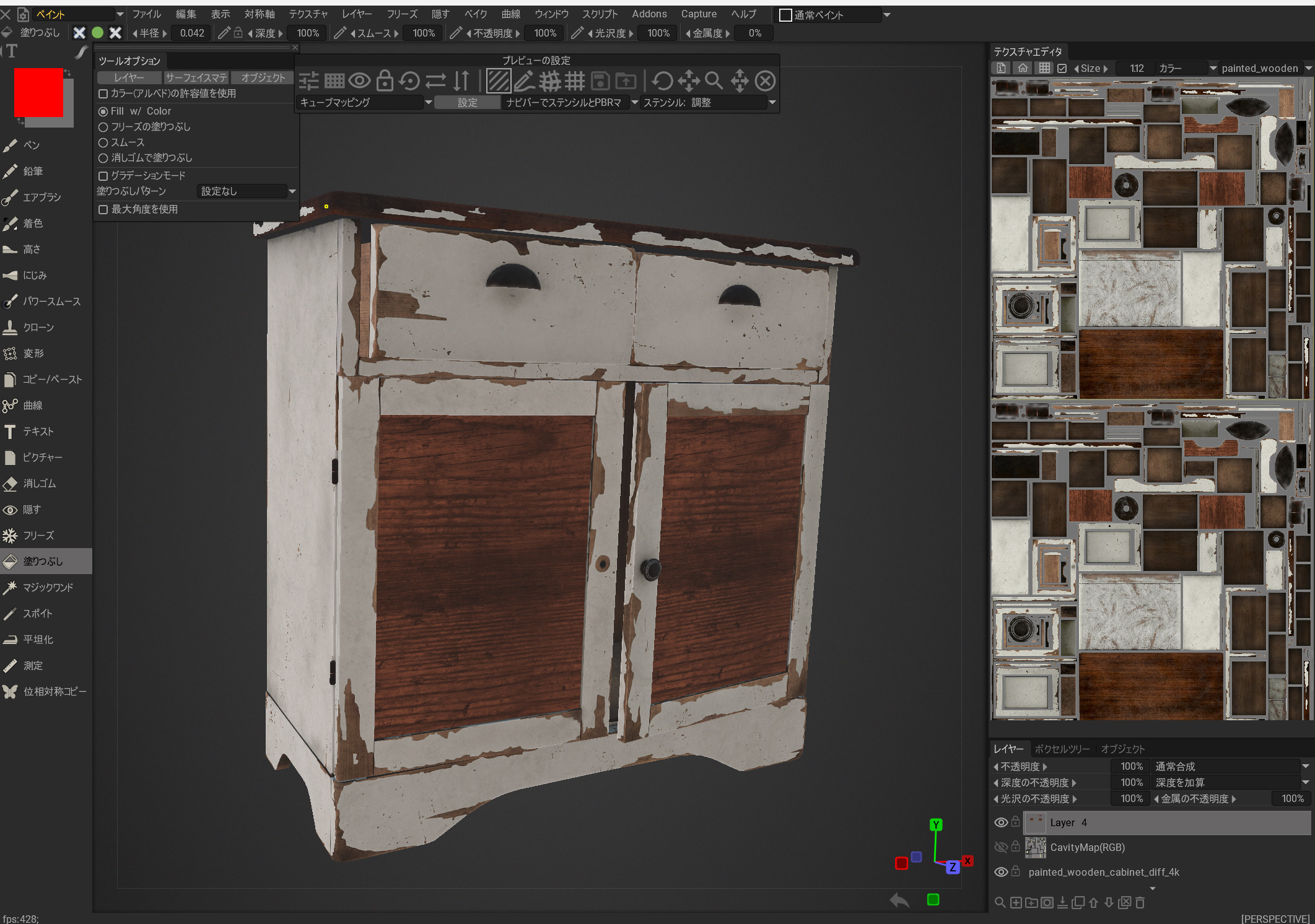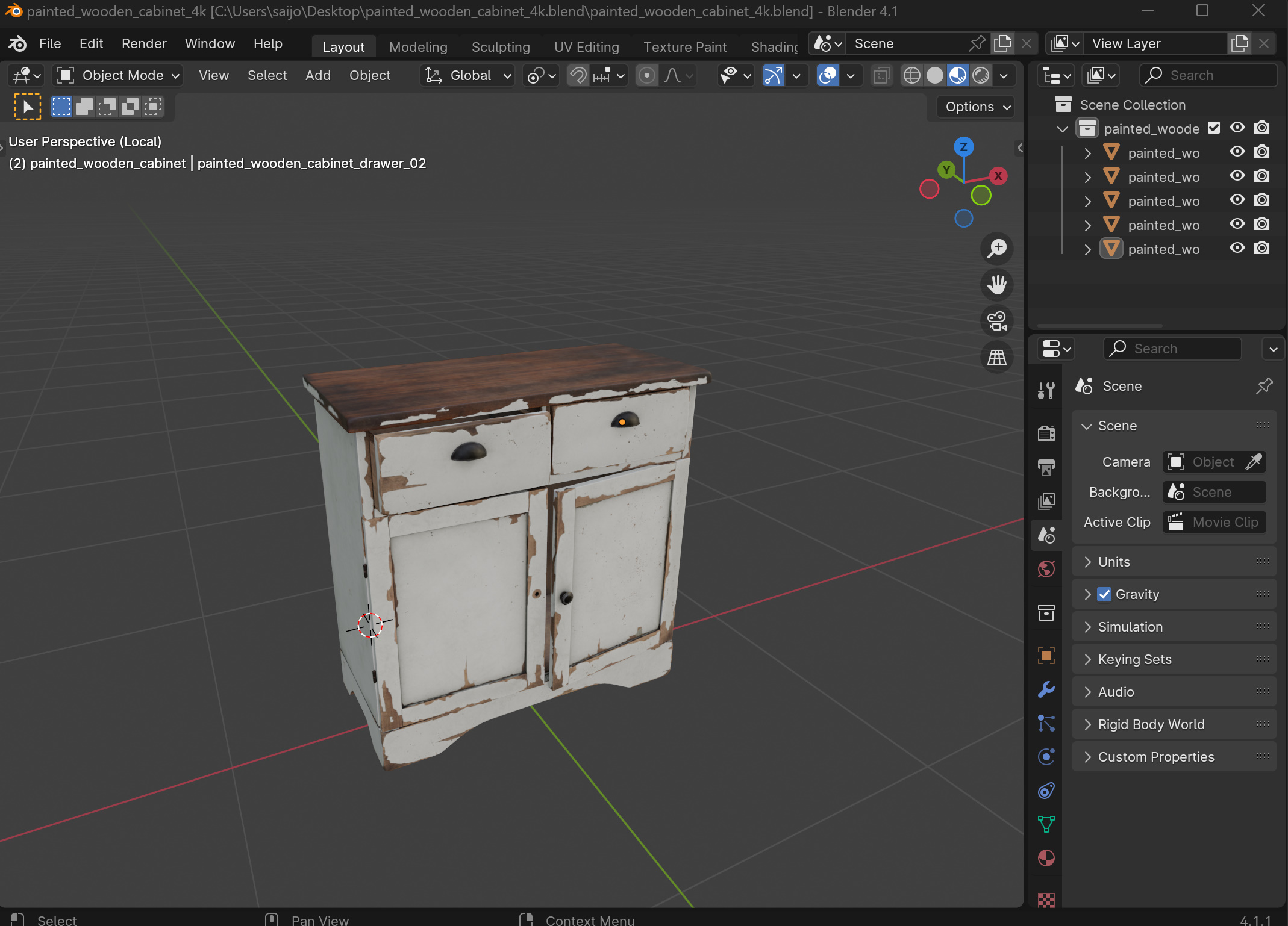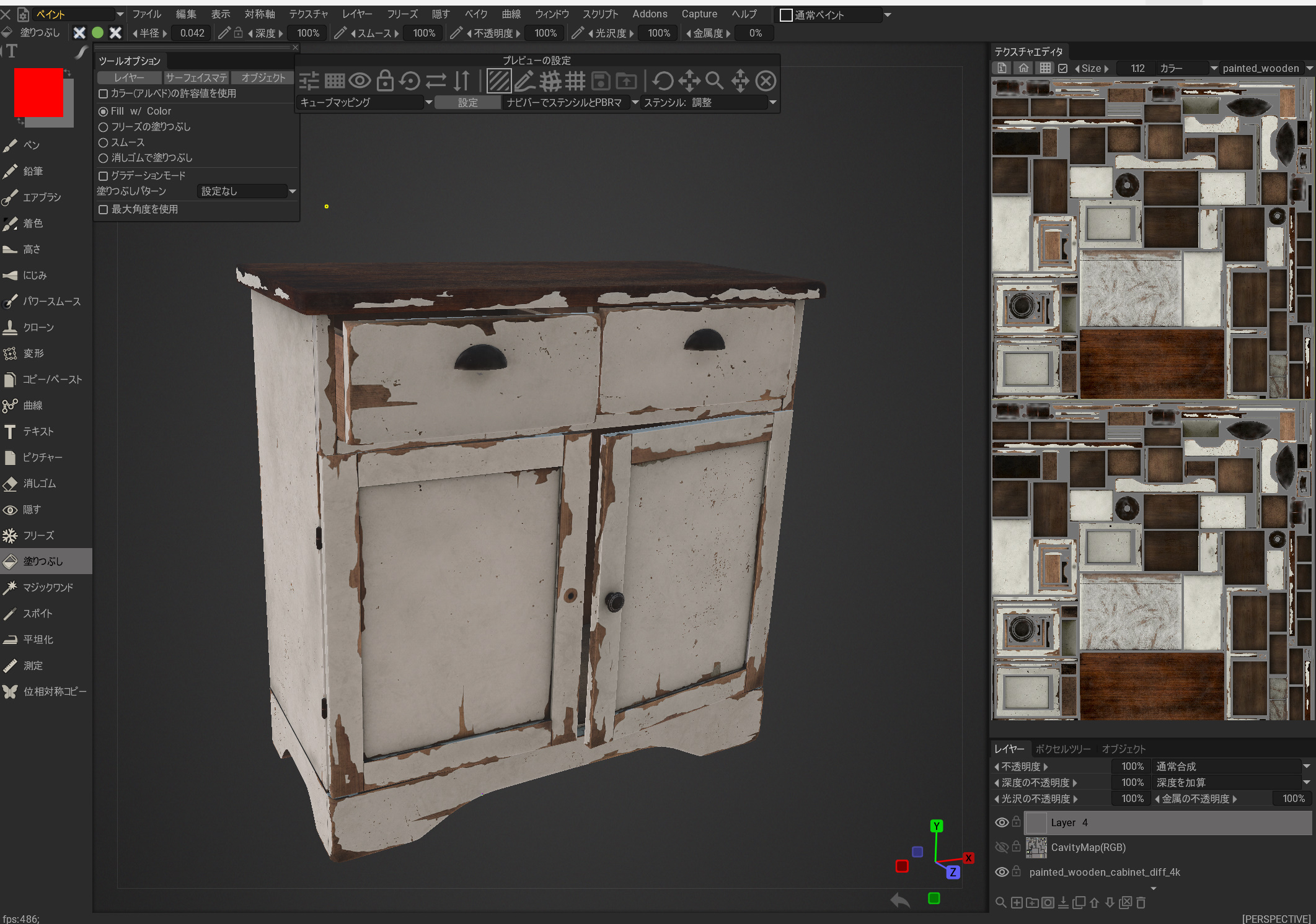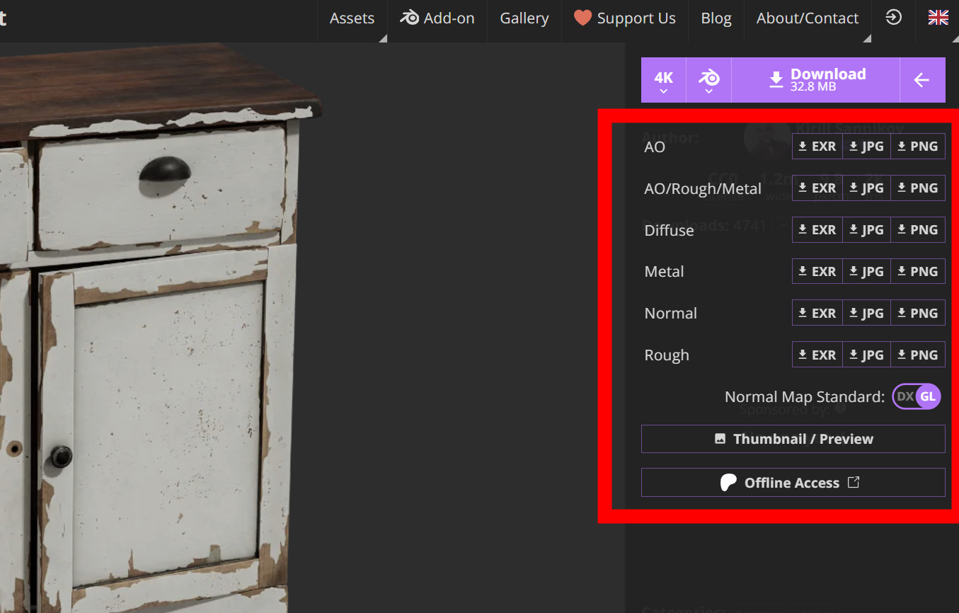 Poly Havenにアクセスして、3Dモデルをクリックします。 まだ3Dアセットの数は少なく347個あるようです。3Dモデルは岩や木、古めの家具などが多いです。低品質な寄せ集めの3Dアセットではなく、それぞれ完璧ともいえる3Dモデルです。いろいろな用途に活用できそうですね。 この3Dモデルをダウンロードしてみましょう。 テクスチャーサイズは4Kです。 ファイルは、Blender形式の中心に複数用意されています。 いろいろなマップもあります。 ダウンロードするとブレンダーのファイルとテクスチャーフォルダが表示されました。 マップは、Diffuseマップ、Normalマップ、Roughnessマップ、metalマップなど。 Blender上で表示してみました。 UE5に取り込むためFBXで書き出します。 FBXでドロップします。 いくつかエラーが出ていますが気にするほどではなさそう。 机のそれぞれのパーツが取り込まれました。このモデルは複数構成でできているようです。 テクスチャーでエラーが出ていました。 テクスチャーファイルを再び取り込み、それぞれのリンク先に接続しました。 UE5でこんな感じ。 位置をすべて0に合わせると、家具がセットの位置に収まりました。 すばらしい3Dモデルです。すばらしい! ちょっとテクスチャーを変更してみましょう。 扉の模様を変更したり。 大理石風に変更したりできます。これもUVマップなどの品質が素晴らしいので、変更も簡単にできそうです。 このような品質を持つ3Dモデルがすべて無制限で無料という素晴らしい結果でした。