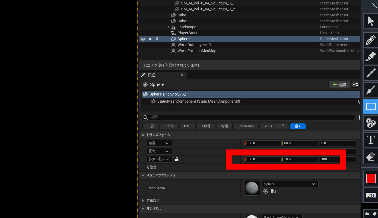 球のサイズを100に設定します。