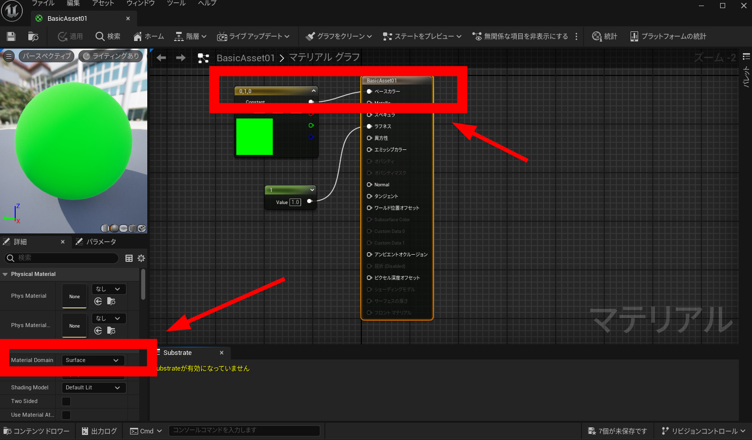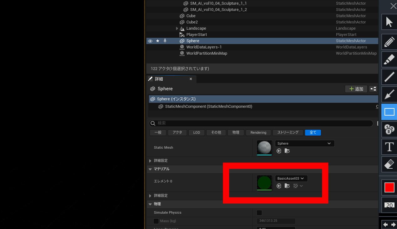 マテリアルのエレメントを適当な色を選択します。グリーンを適当に選びます。マテリアルをダブルクリックして、設定画面に入ります。