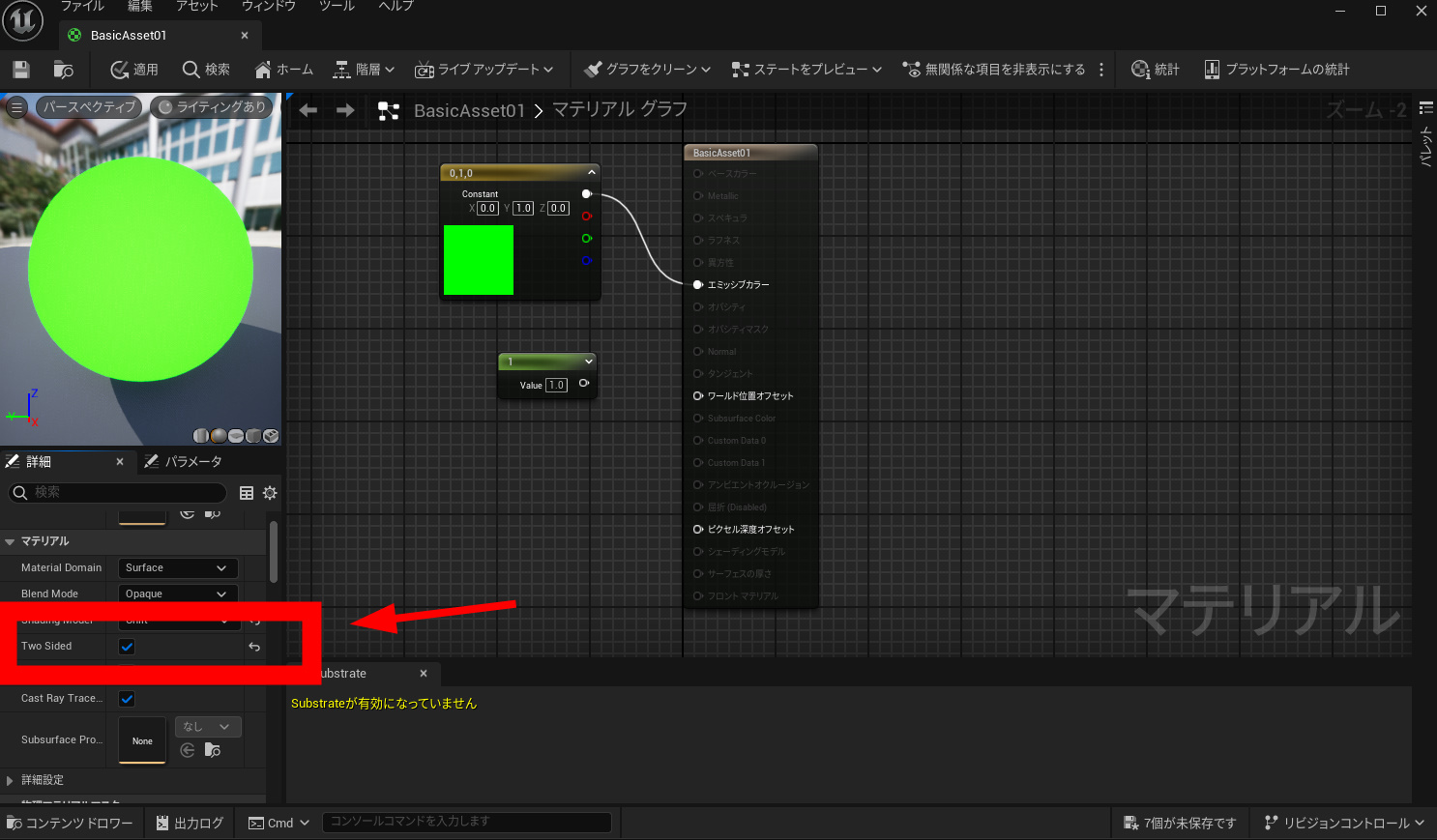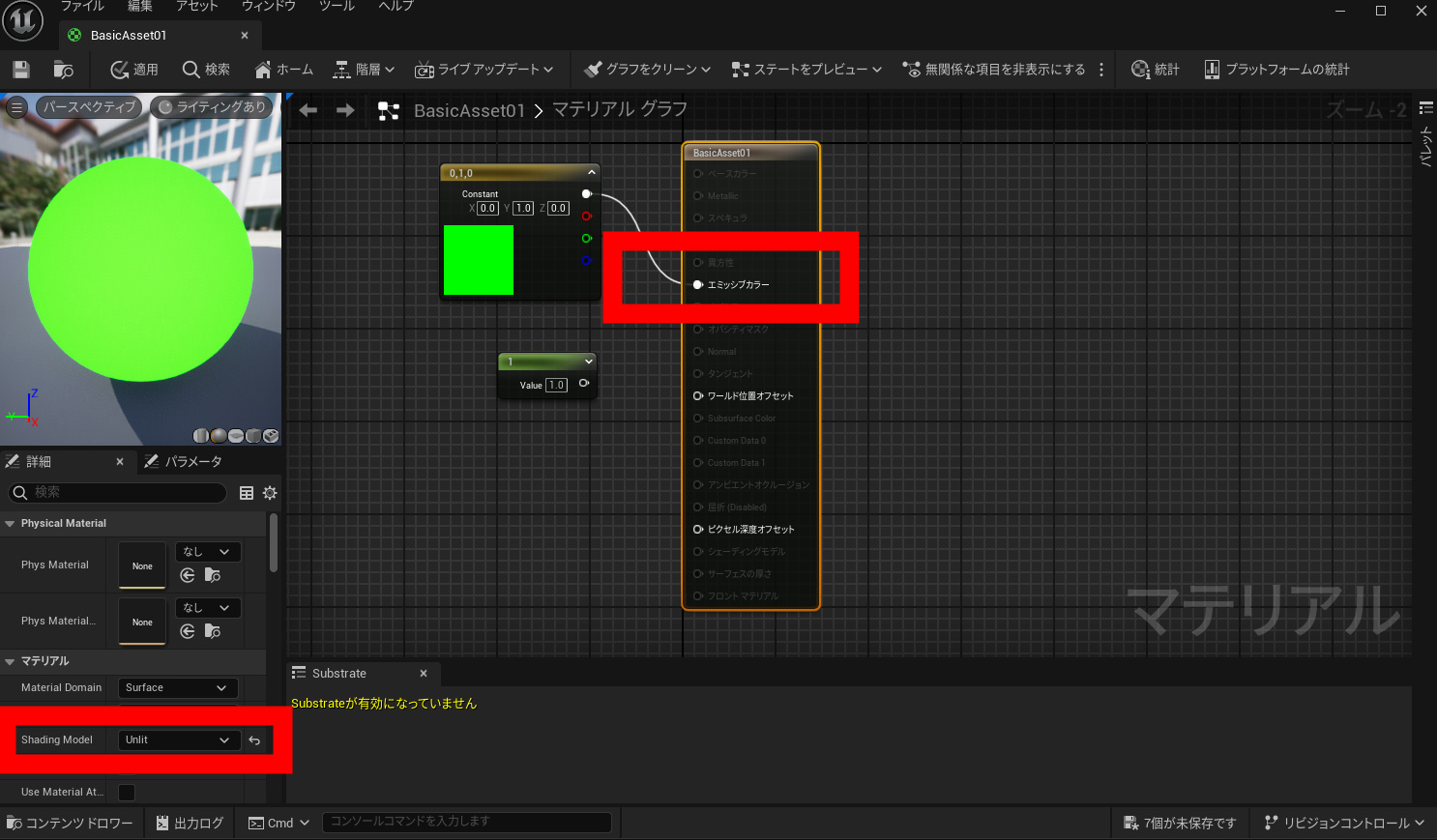 Unlitにしてエミッシブカラーにします。litからunlitにすることで、このグリーン自体に影が落ちることがなくなります。またアンリットは自己発光する素材となります。明るさなども一定になる感じです。
