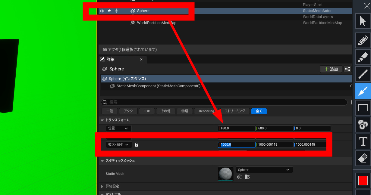 真緑になりました。球体の緑がオブジェクトに反射しているのです。なんてことでしょう。