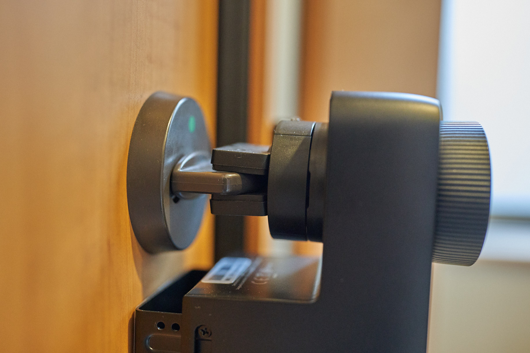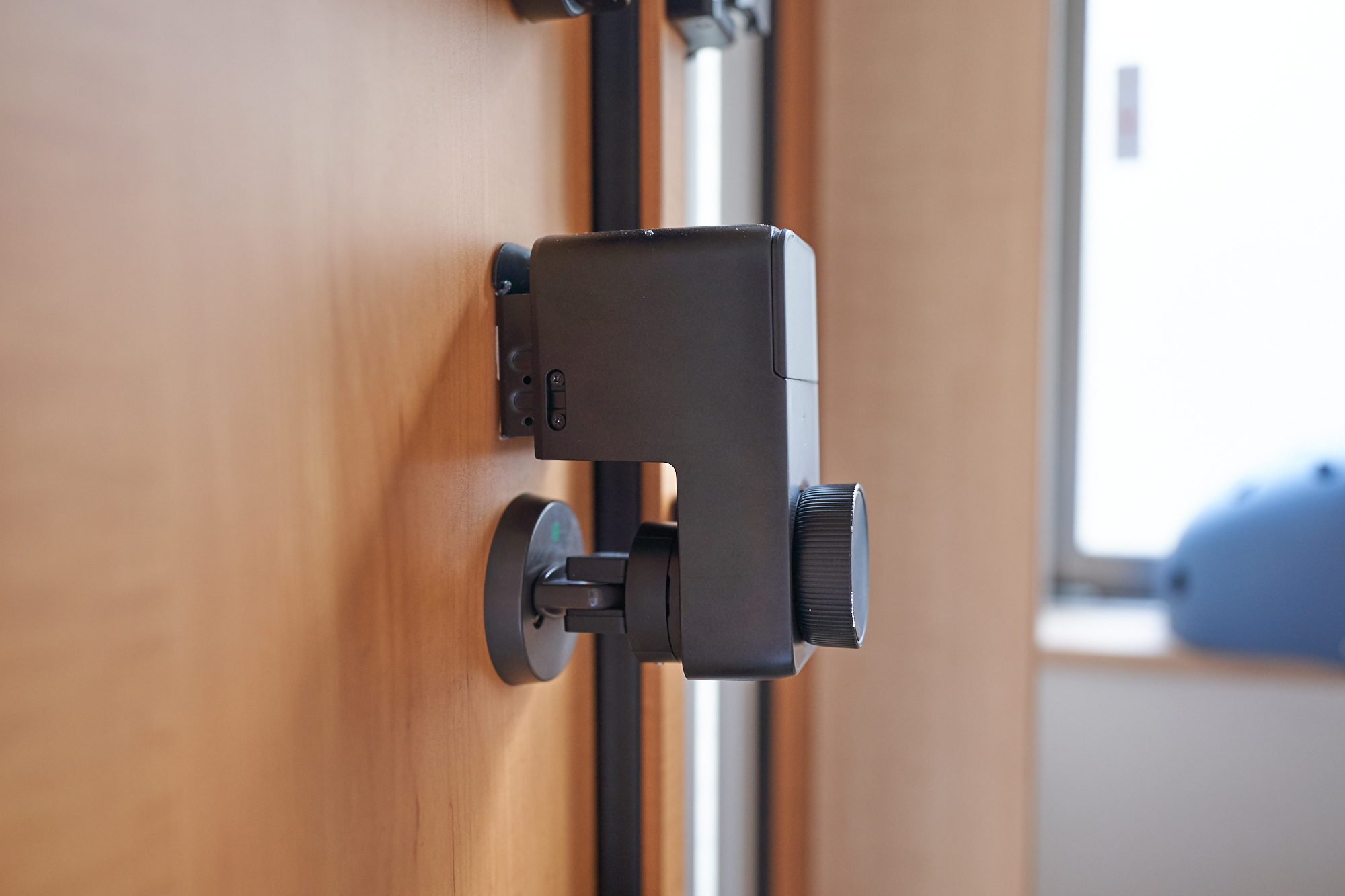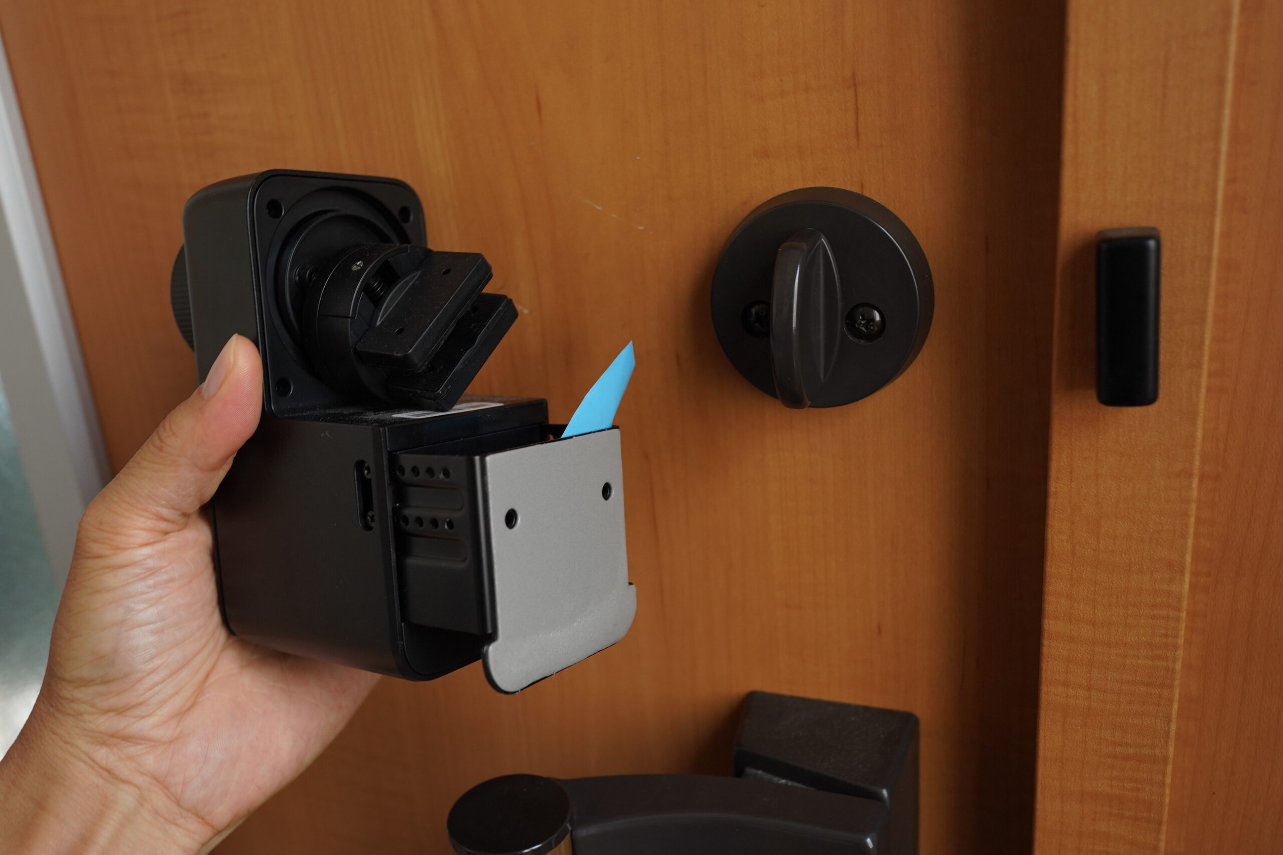 ドアの鍵部分を、はさむような機構になっています。マージンがしっかり設けてあるので、いろいろなタイプに設置できるでしょう。