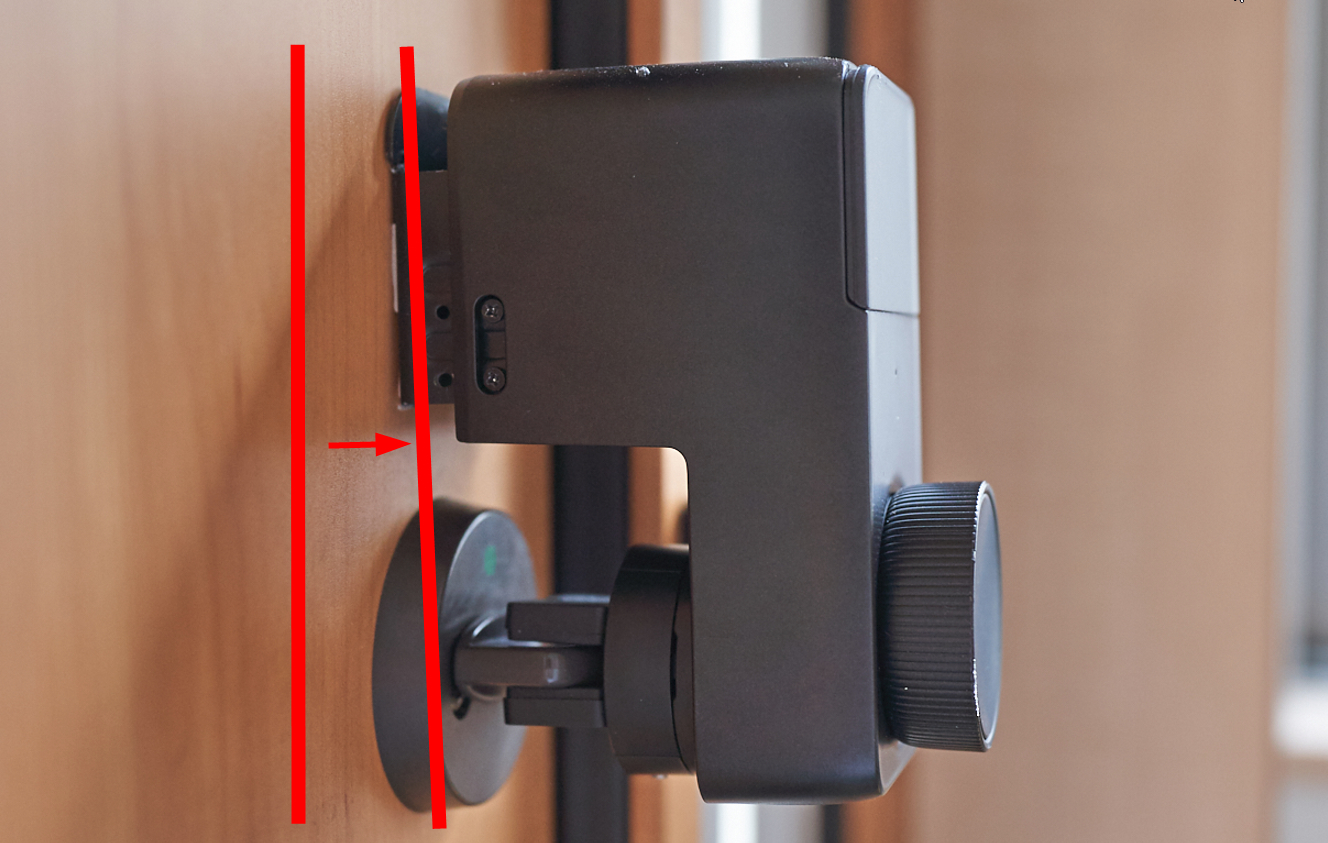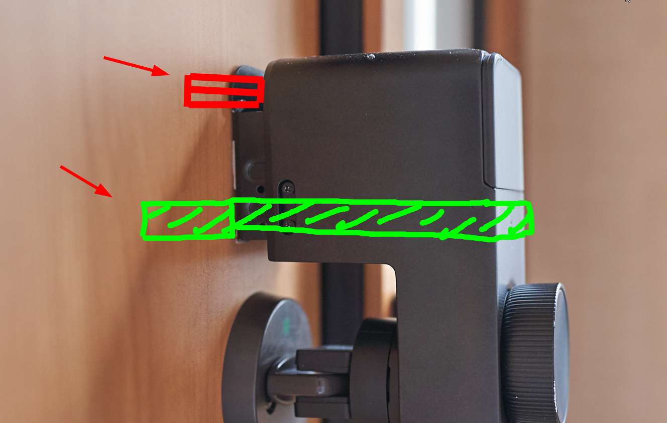 「バッテリーが急激に減る症状」の発生理由が徐々に判明。どうやら設置時点に、少し斜めに設置してしまったことで粘着部分が、徐々に剥がれてきた様子。脱落はしないもの斜め(本当に少し)になり、鍵が回転する部分に何かしら負荷が発生することで、「バッテリーが急激に減る症状」が出るようです。 もしくはドア素材のためか、最近の気温が高いためか、斜めを修正するために貼りなおしたため粘着力が低下したためか、子供達が出入りするときにぶつかっているためか、そもそも構造的に落ちてくるのか不明ですが、以下のように少しづつ「斜め」になり、「バッテリーが急激に減る症状」が出て、ロック機能が停止しました。