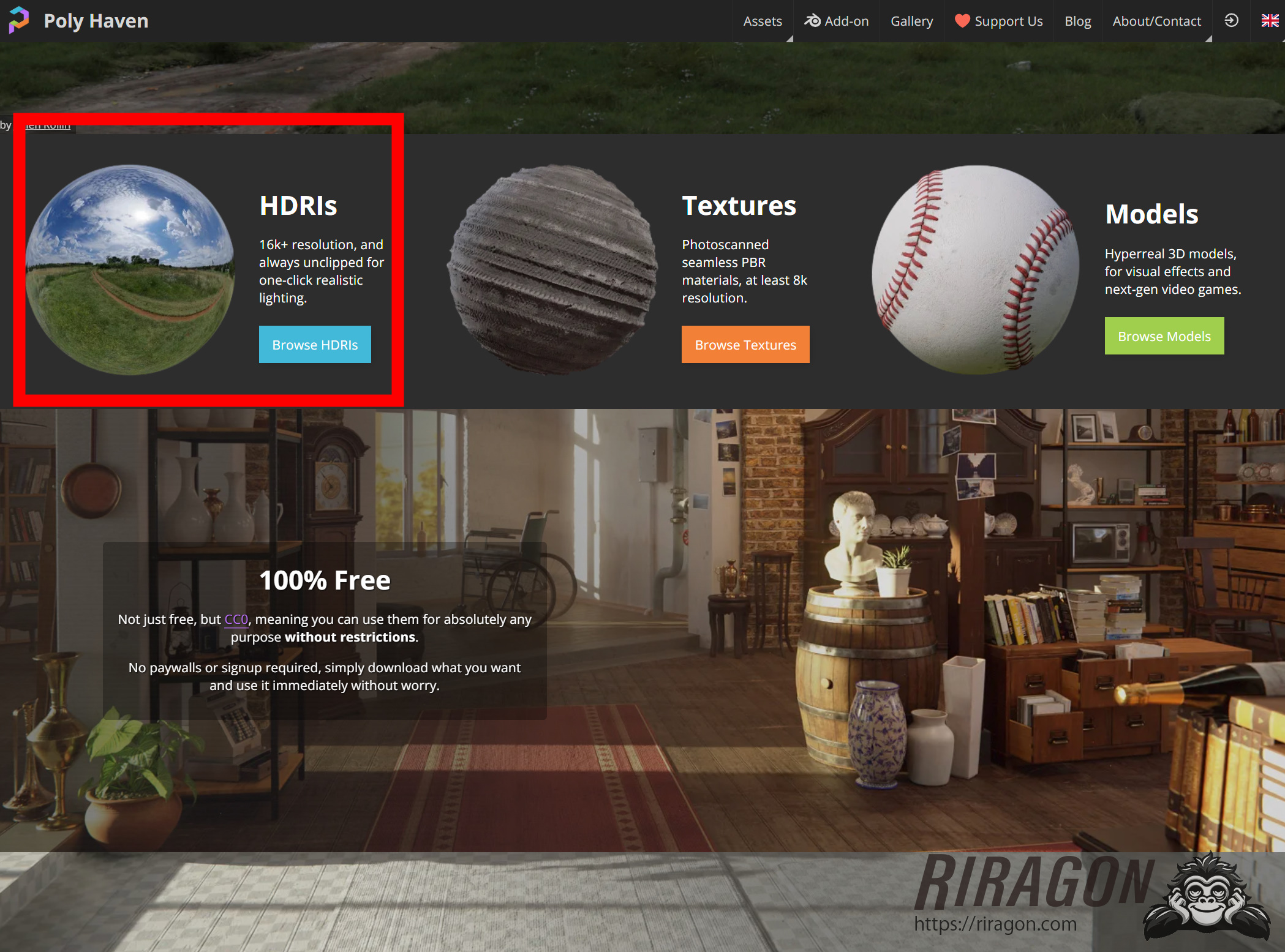 HDRI(High Dynamic Range Images)を無料で配布しているPoly HavenのHDRI素材を実際に使ってみます。Poly Havenですが無料で配布かつクオリティがとても高いのが特徴です。Poly Havenについて詳しく見てみましょう。 Poly Haven https://polyhaven.com/ おまけ:日本のHDRI素材配布サイトOpenreelもありました https://openreel.org/ Poly Havenの読み方は、ポリーヘブン(もしくはヘイブン)でしょうか。Poly Havenは非営利団体で高品質な3Dアセット、テクスチャ、HDRIを無料で提供し、アーティストや業界全体の発展に貢献するというコンセプトのようです。 **何よりも凄い点が、すべてクリエイティブ・コモンズのCC0ライセンスで素材が提供されていることです。