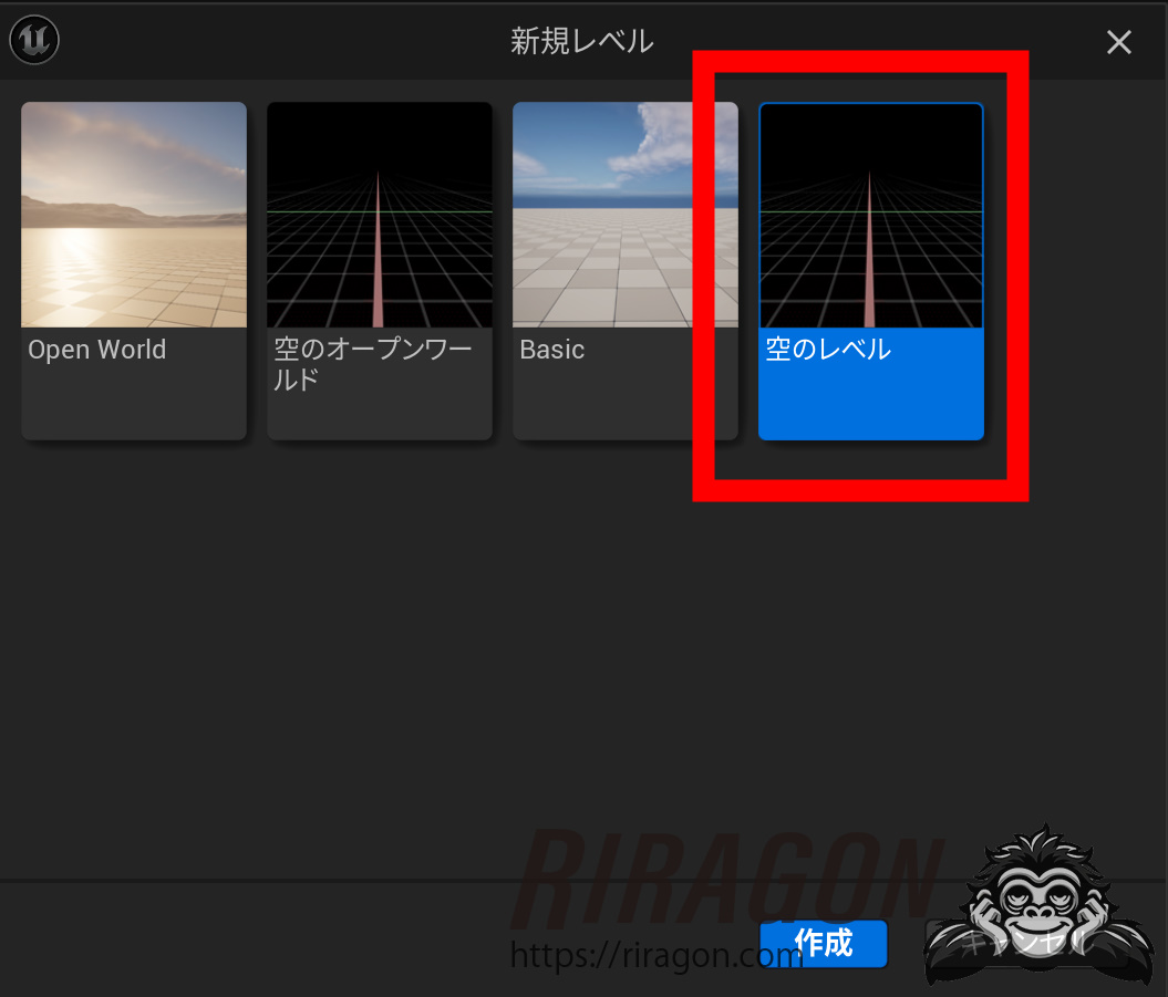 UE5を開いて新規レベルで、空のレベルを作ります。