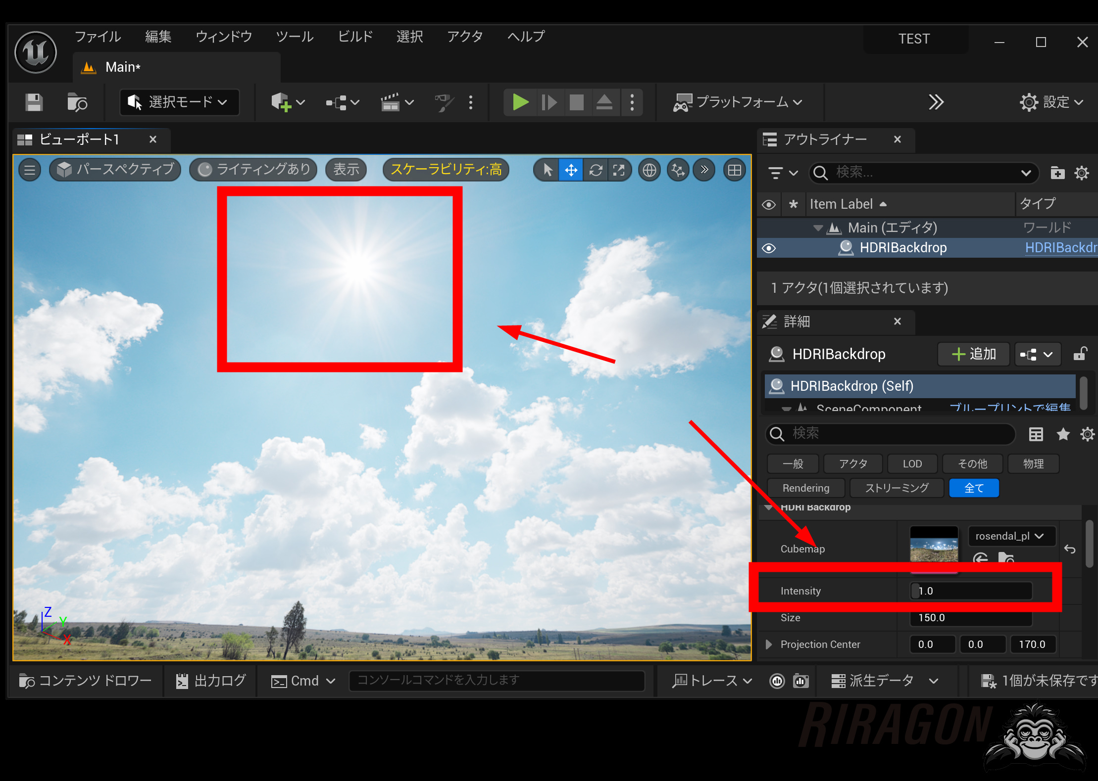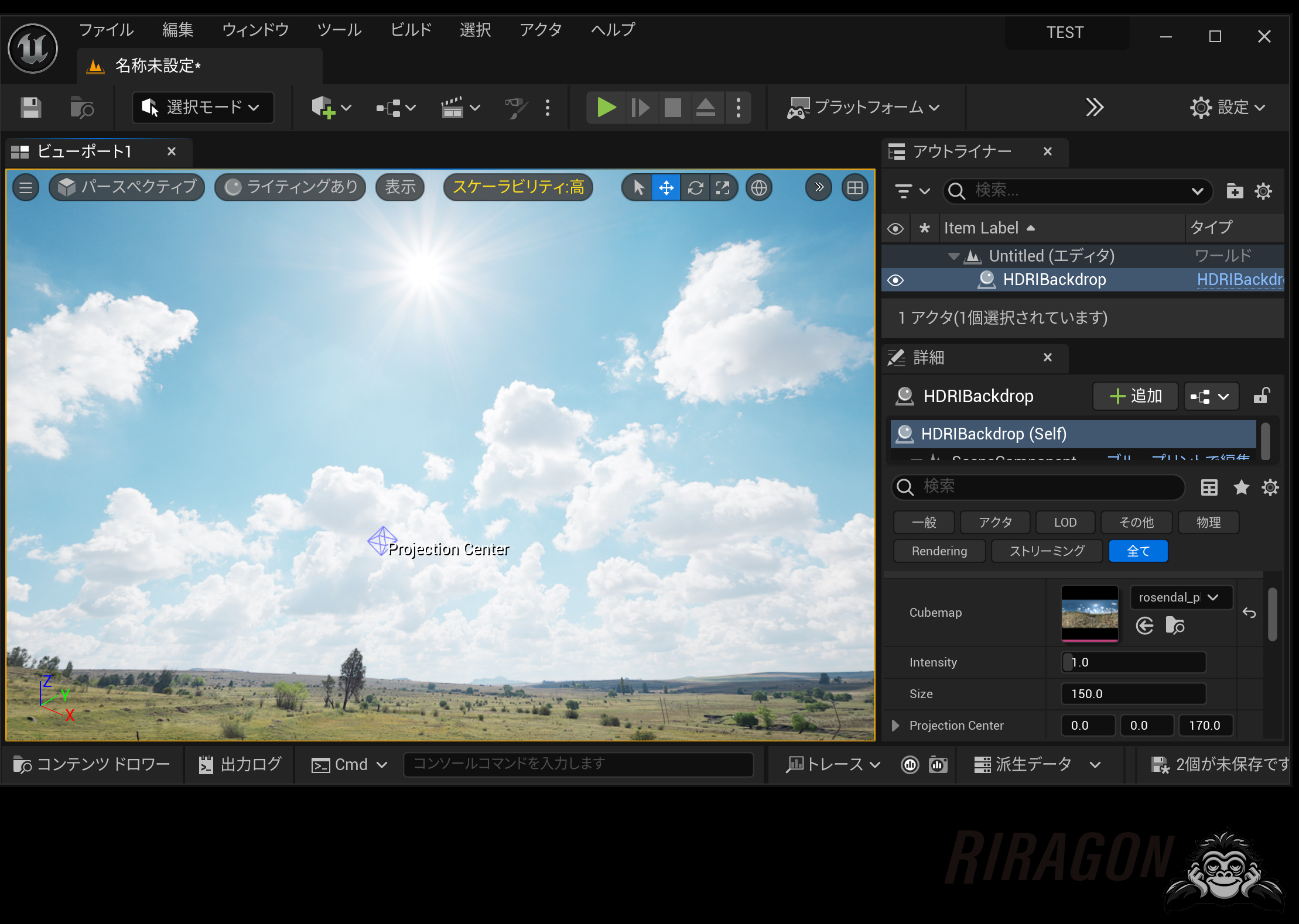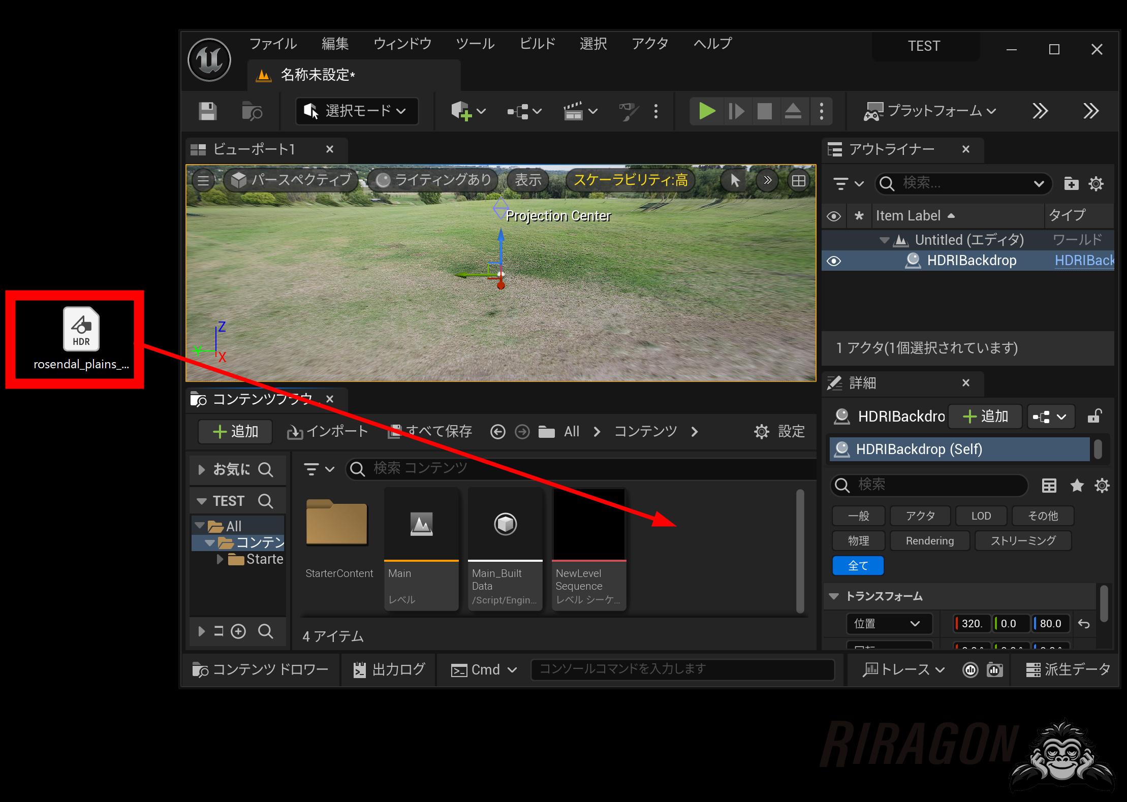DLしたHDRをコンテンツブラウザーに取り込みます。