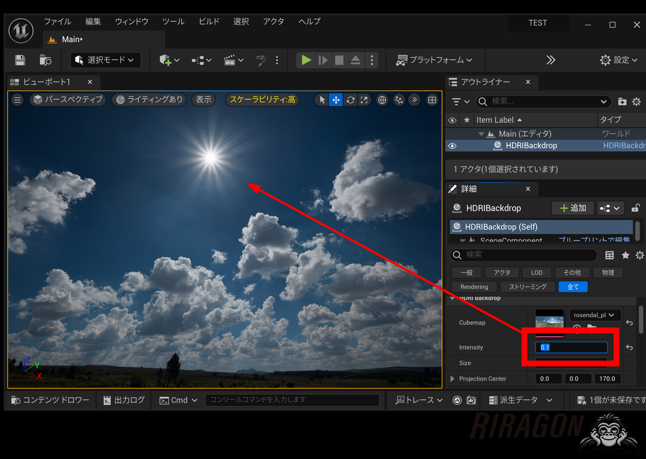 大抵のHDRIは、モニター表示できる明るさより、さらに広い範囲の明るさを持っています。Intensityを1.0から下げてみましょう。