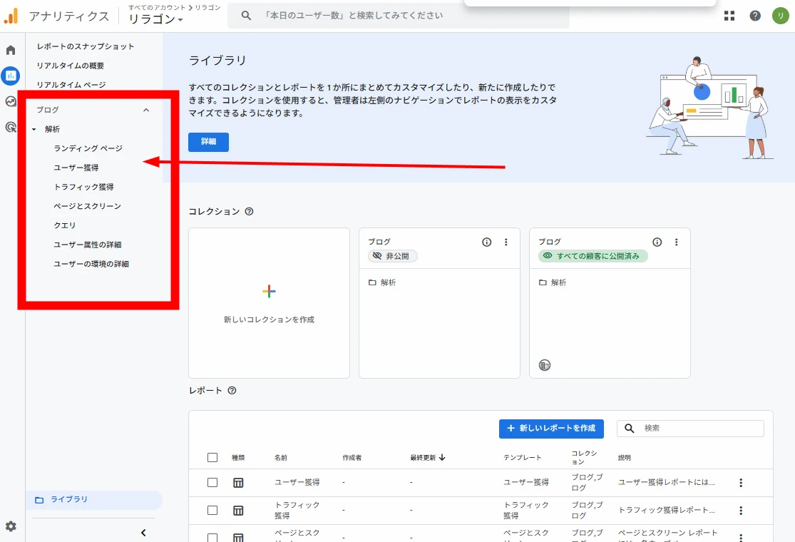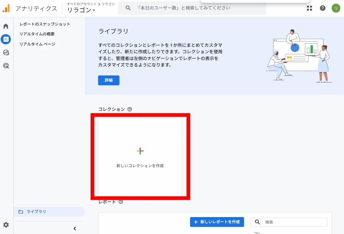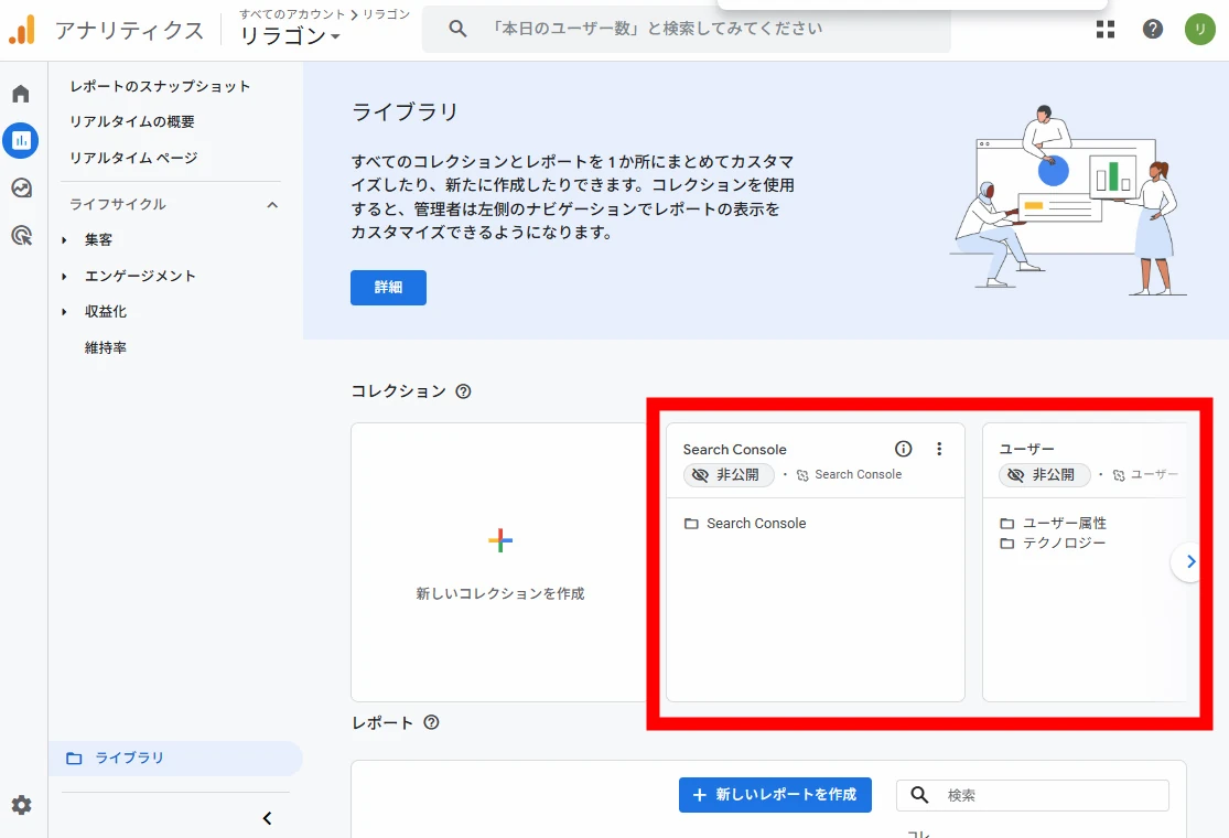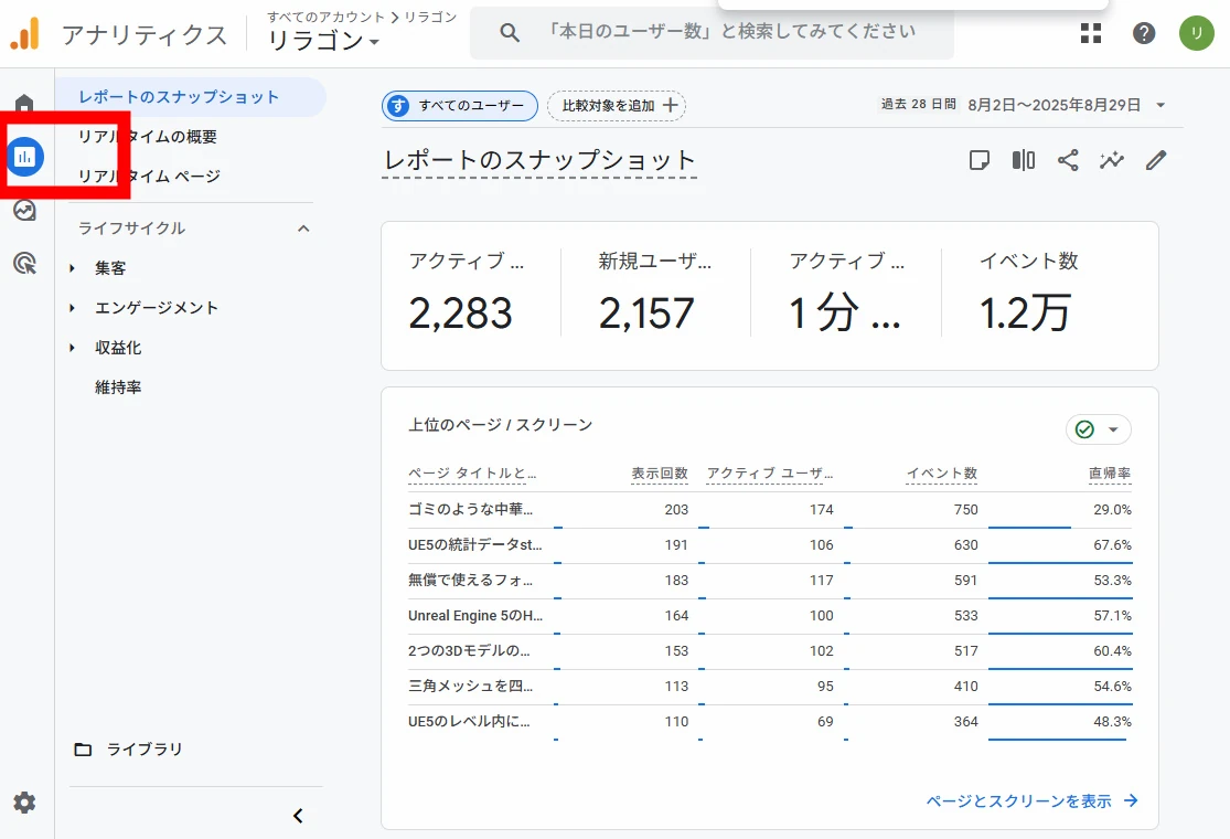 アナリティクスにログインします。「レポート」に入ります。以下リラゴンの実際のダッシュボードです。