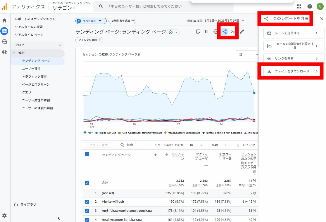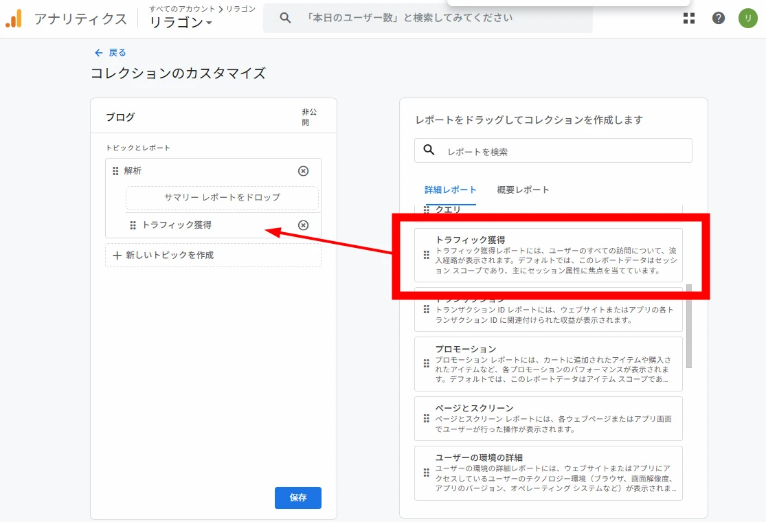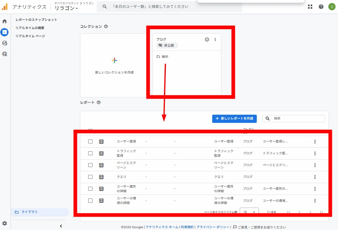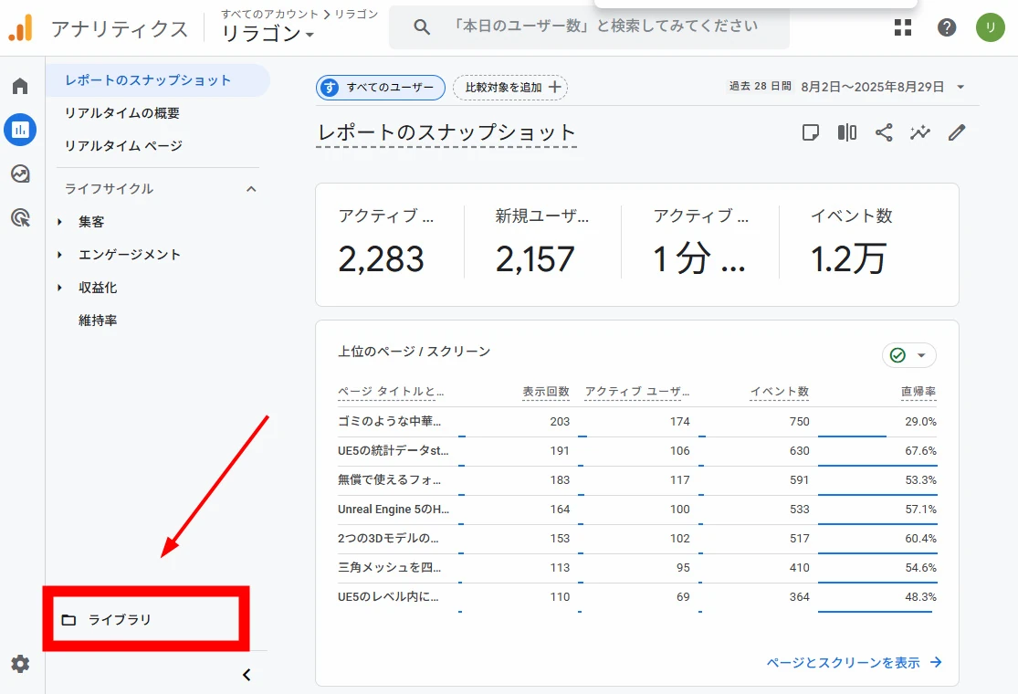 アナリティクスにログインします。「レポート」に入ります。以下リラゴンの実際のダッシュボードです。