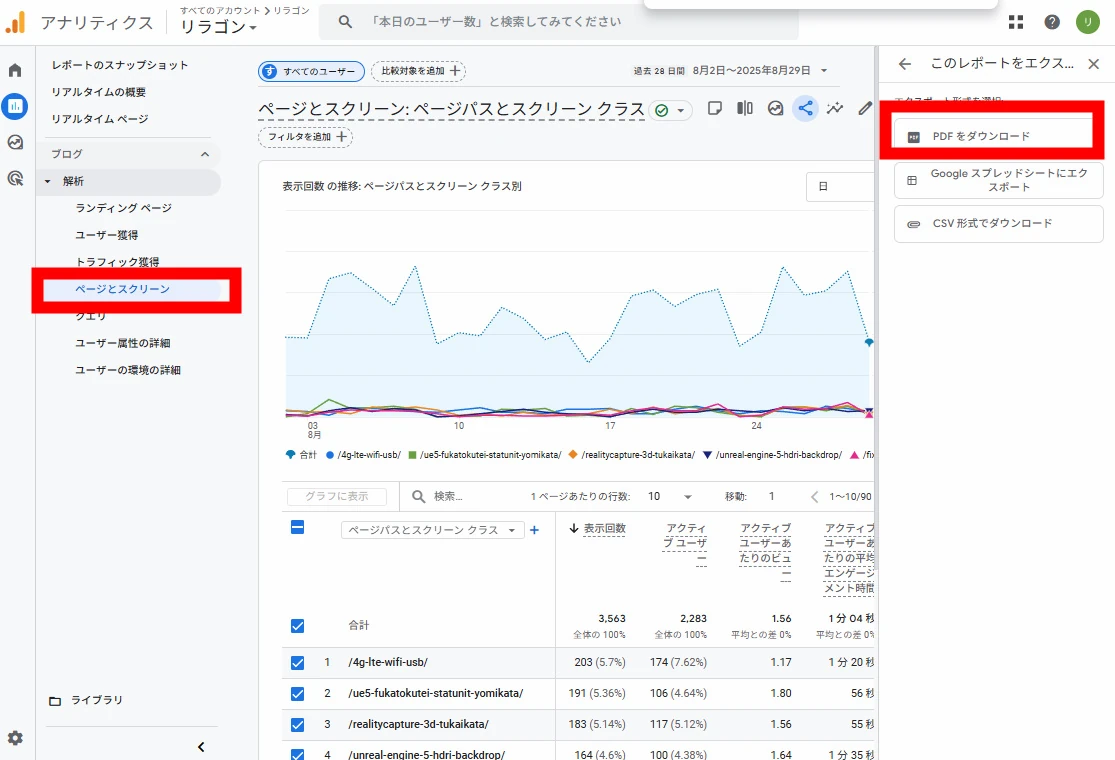 レポートのメニューに先ほどの項目が表示されるのでクリックします。分析したい日付を指定します。長期で分析したければ1年、初期設定は1か月です。