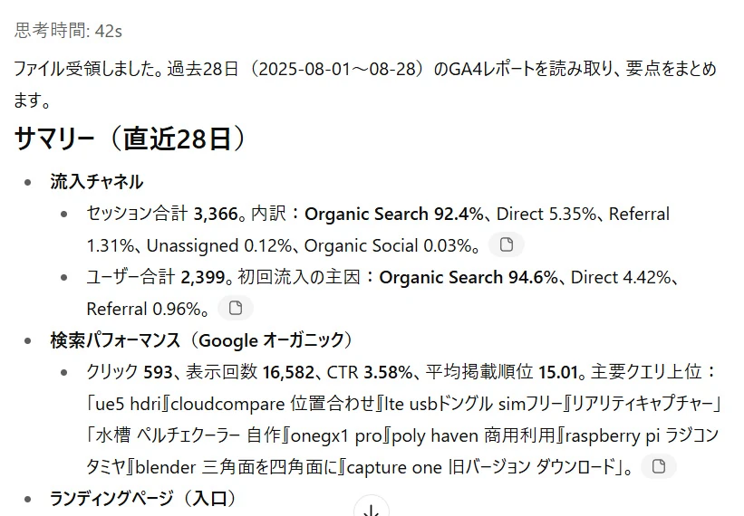 2025年Google Analytics 4(アナリティクス/GA4)に移行してから、本当に難しくなったと感じます。専門的にKPIを定めて設計してから使う前提になり、画面を見ても正直よく分かりません。困ったものです。 そして、メガネをくいっと上げて早口で「指標を定義してKPIツリーにブレークダウンし、データ品質とアトリビューションを整流し、探索レポートをダッシュボードへ最適化します。GA4×BigQueryでクイックウィンから継続的にグロースさせます。ふう…」みたいな勉強をしたくありません。 そこで、難解なGA4のデータをGPTに読み込ませて状況を解説してもらいました。