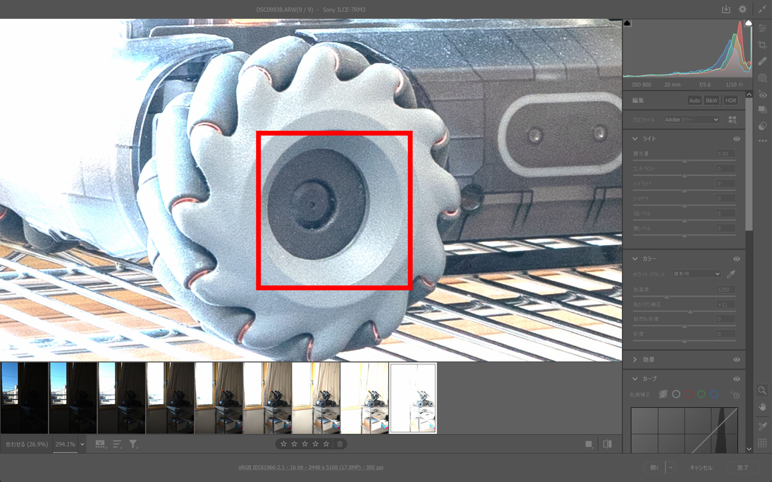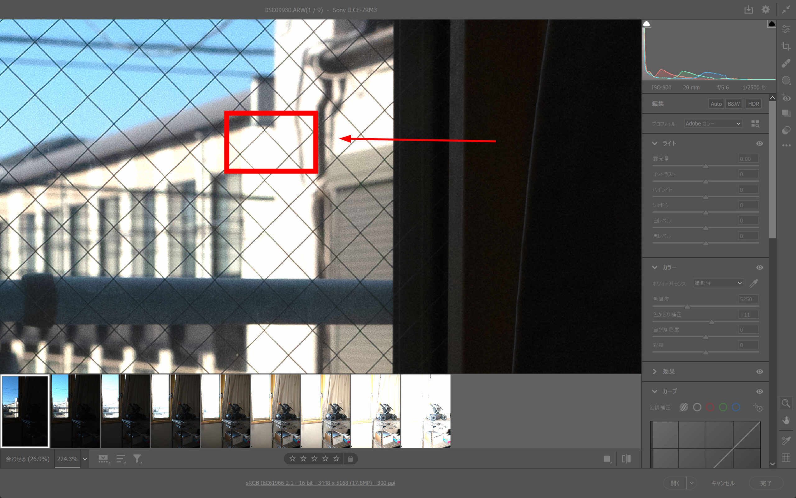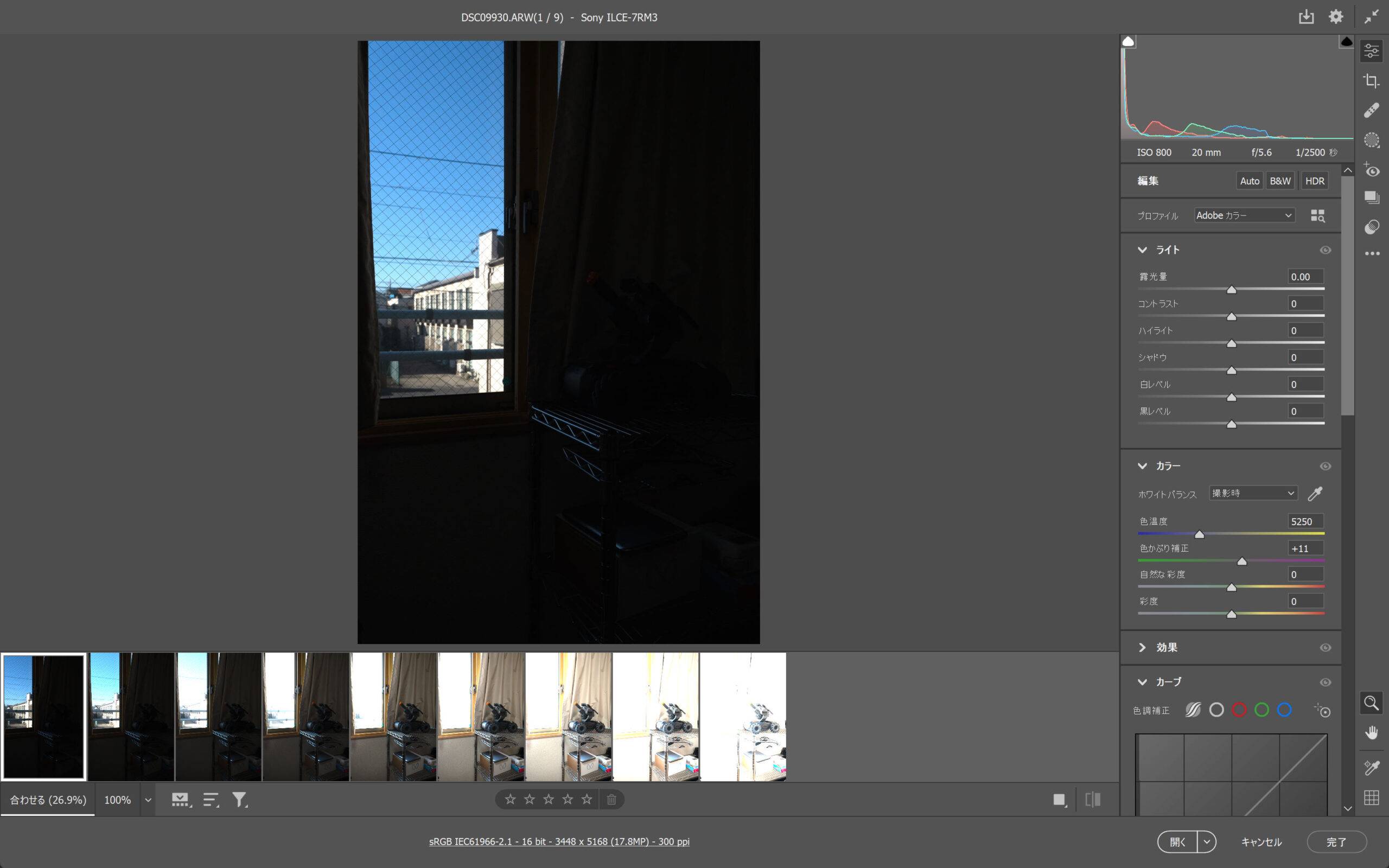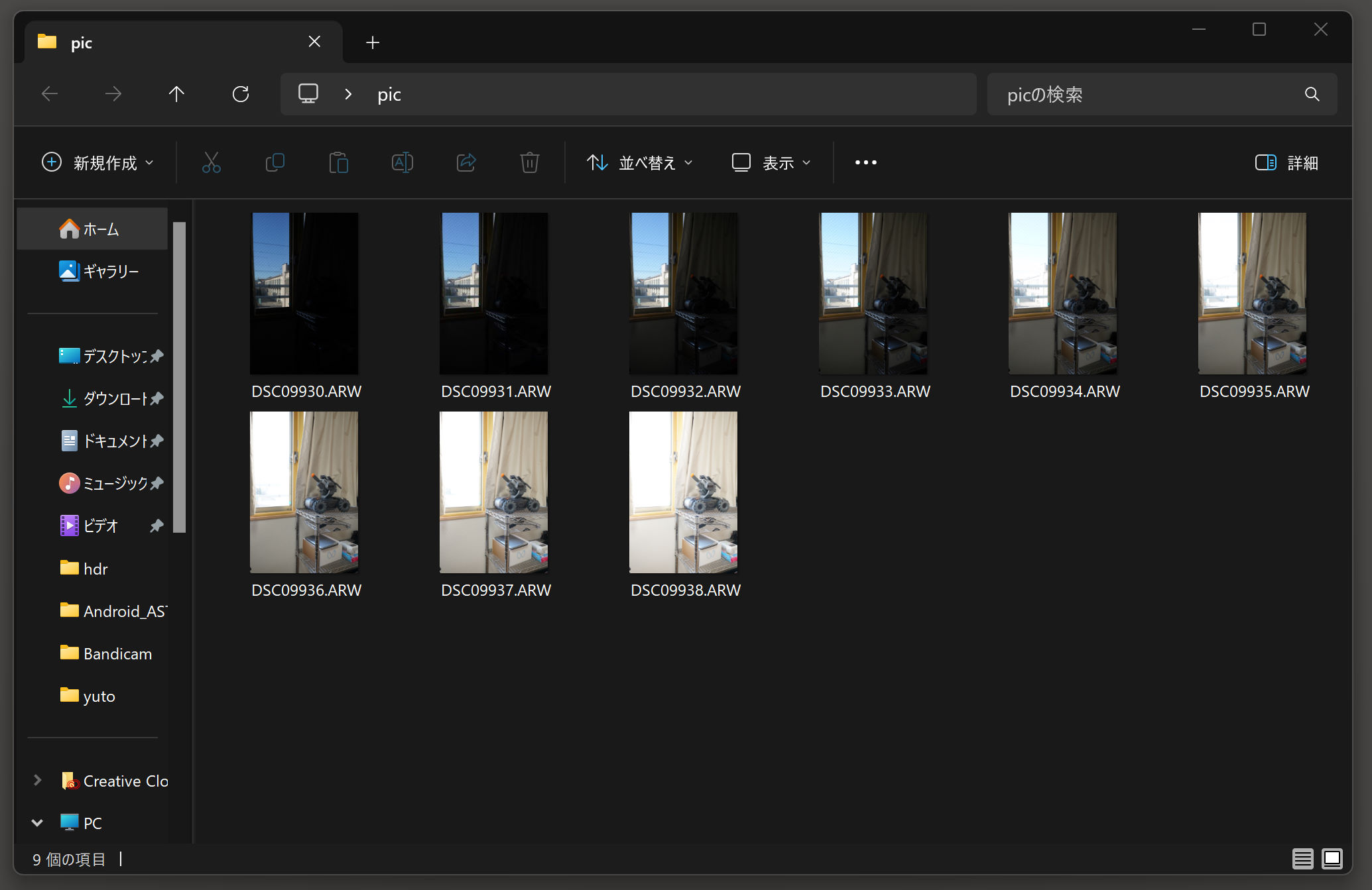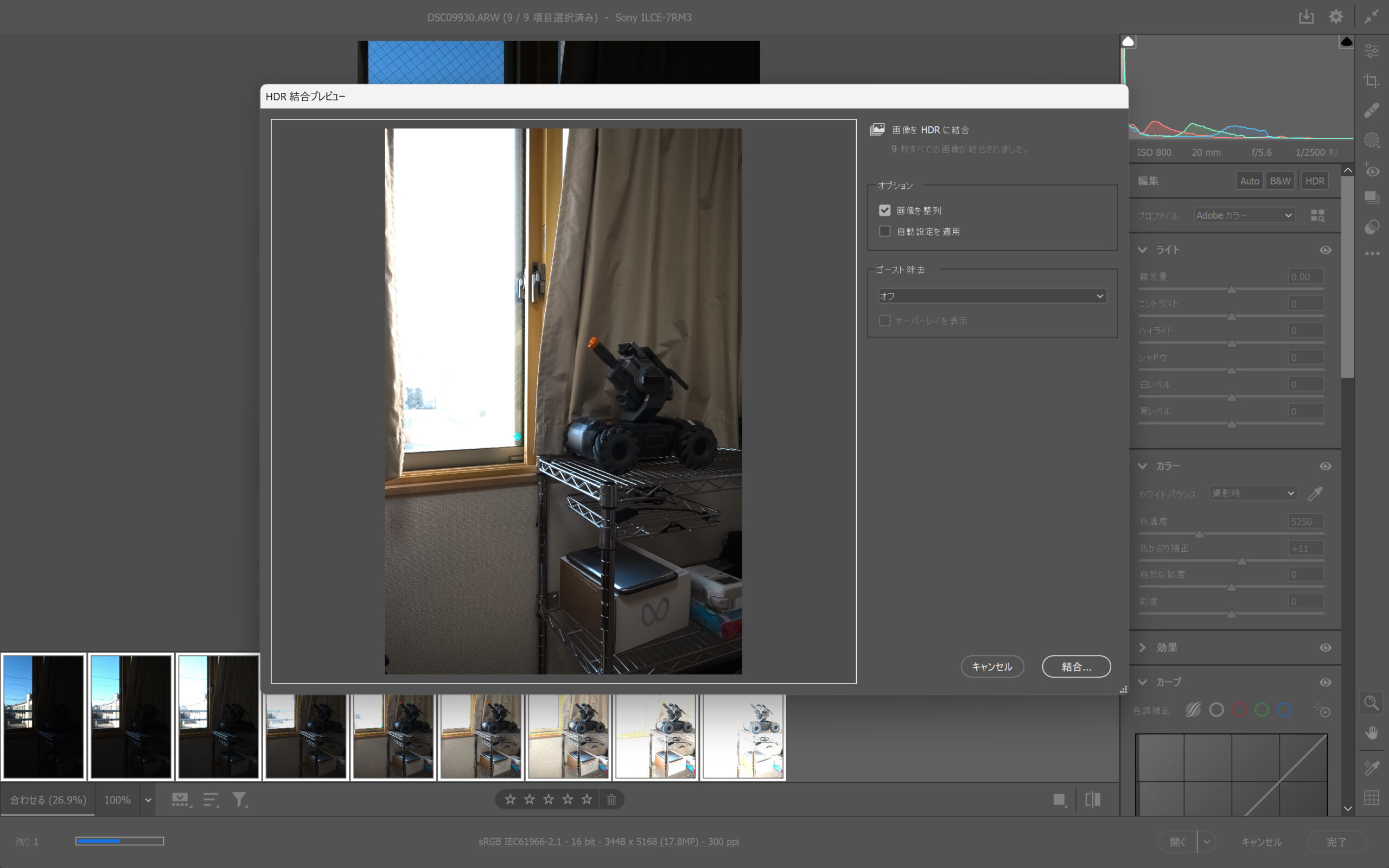 ブラケット撮影は、EVのステップ数と何枚撮影するかで構成されます。今回はEVのステップ数+1、9枚撮影にしました。この辺はカメラの設定を確認してください。室内から室外まで露出があった写真が撮れました。