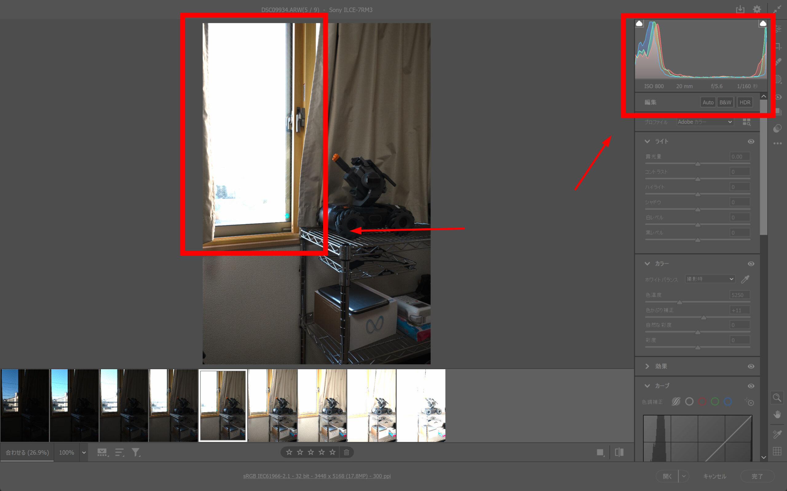HDRモードに拡張されました。ヒストグラムが右側に4段ふえています。