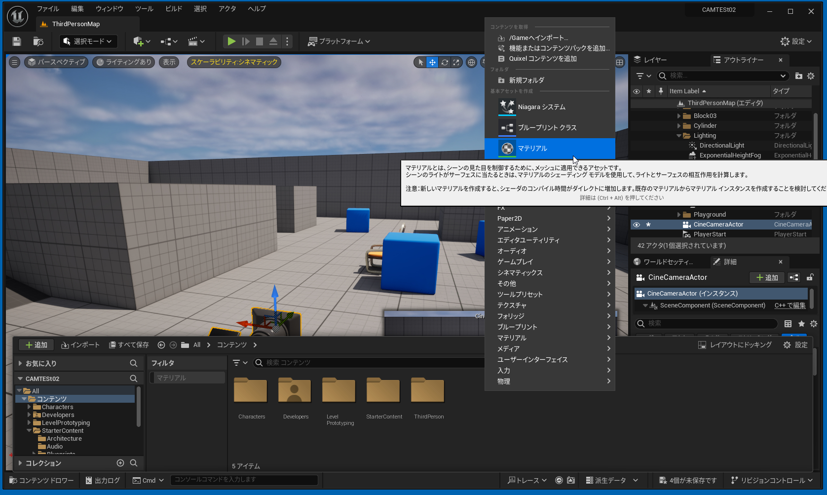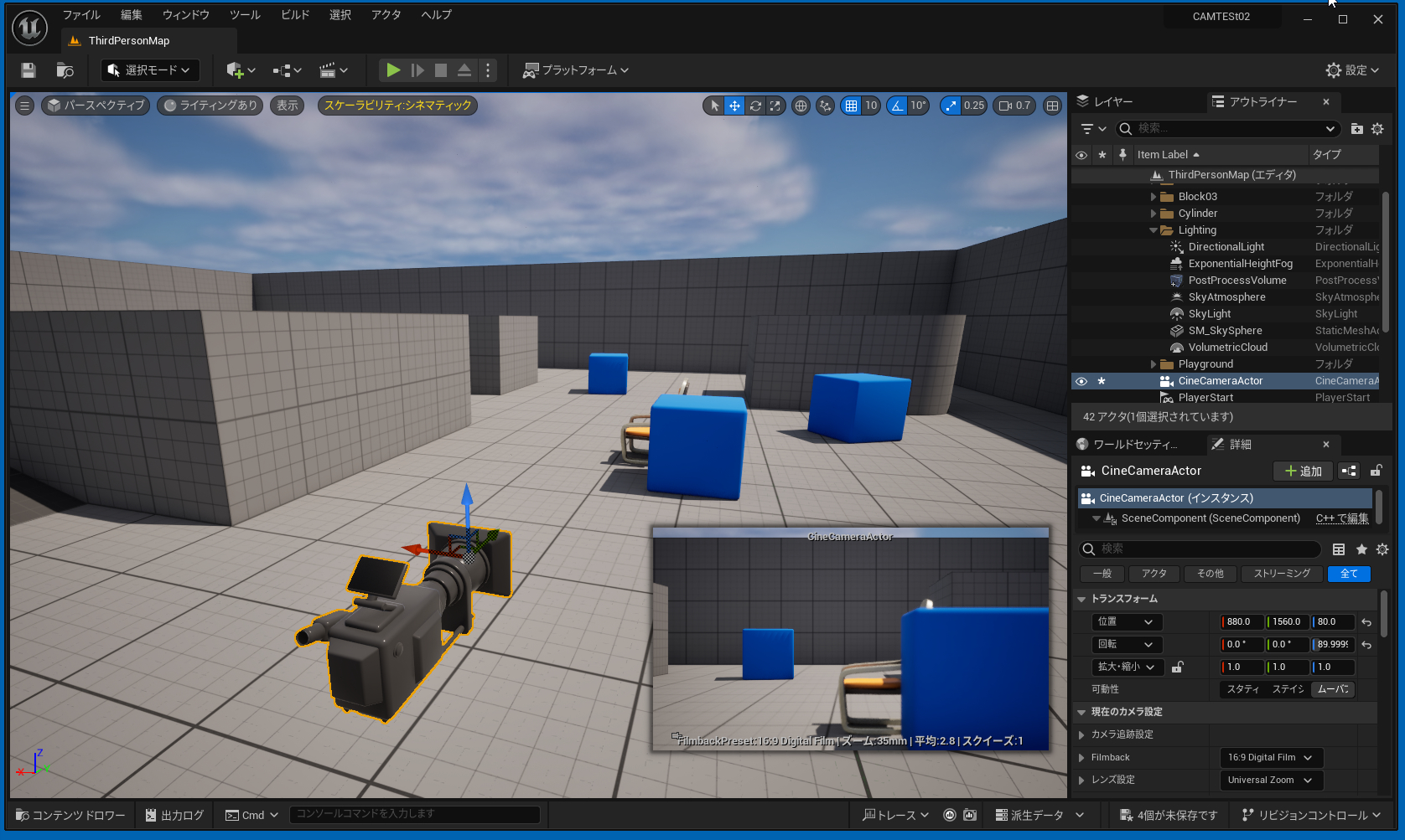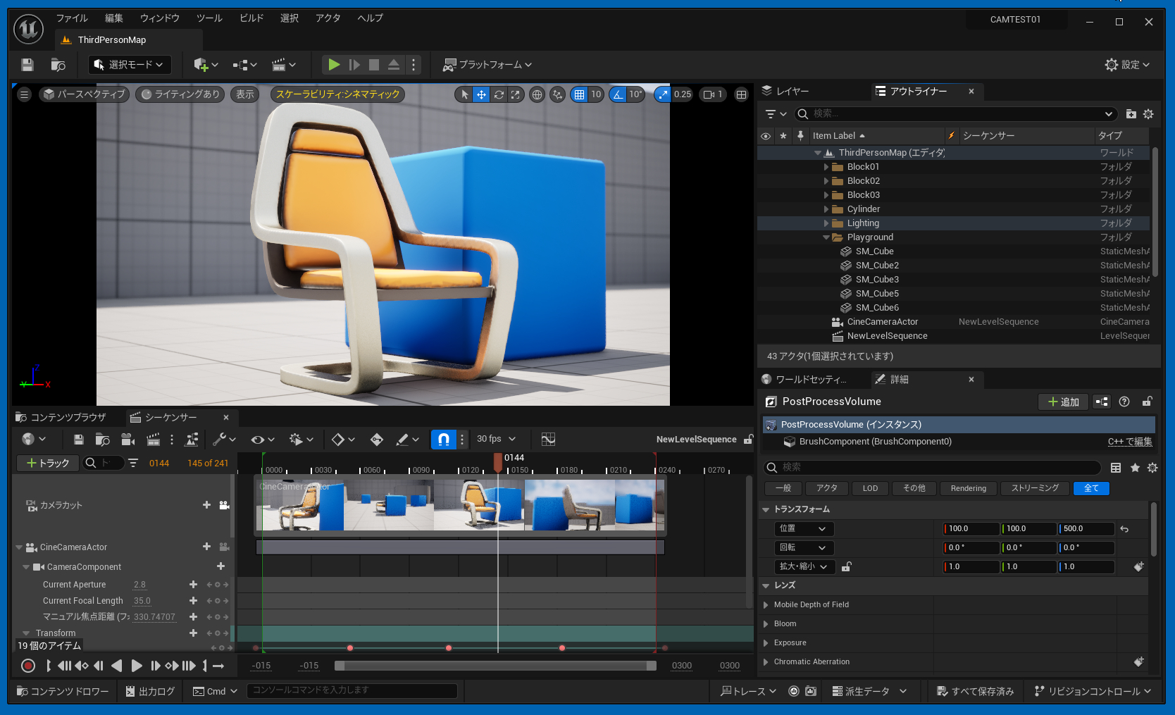 例えば3Dモデルやアセットを使用してシーンを構築し、シーケンサーからムービレンダーキューで、カメラの映像を高品質な動画素材として書き出すことができます。