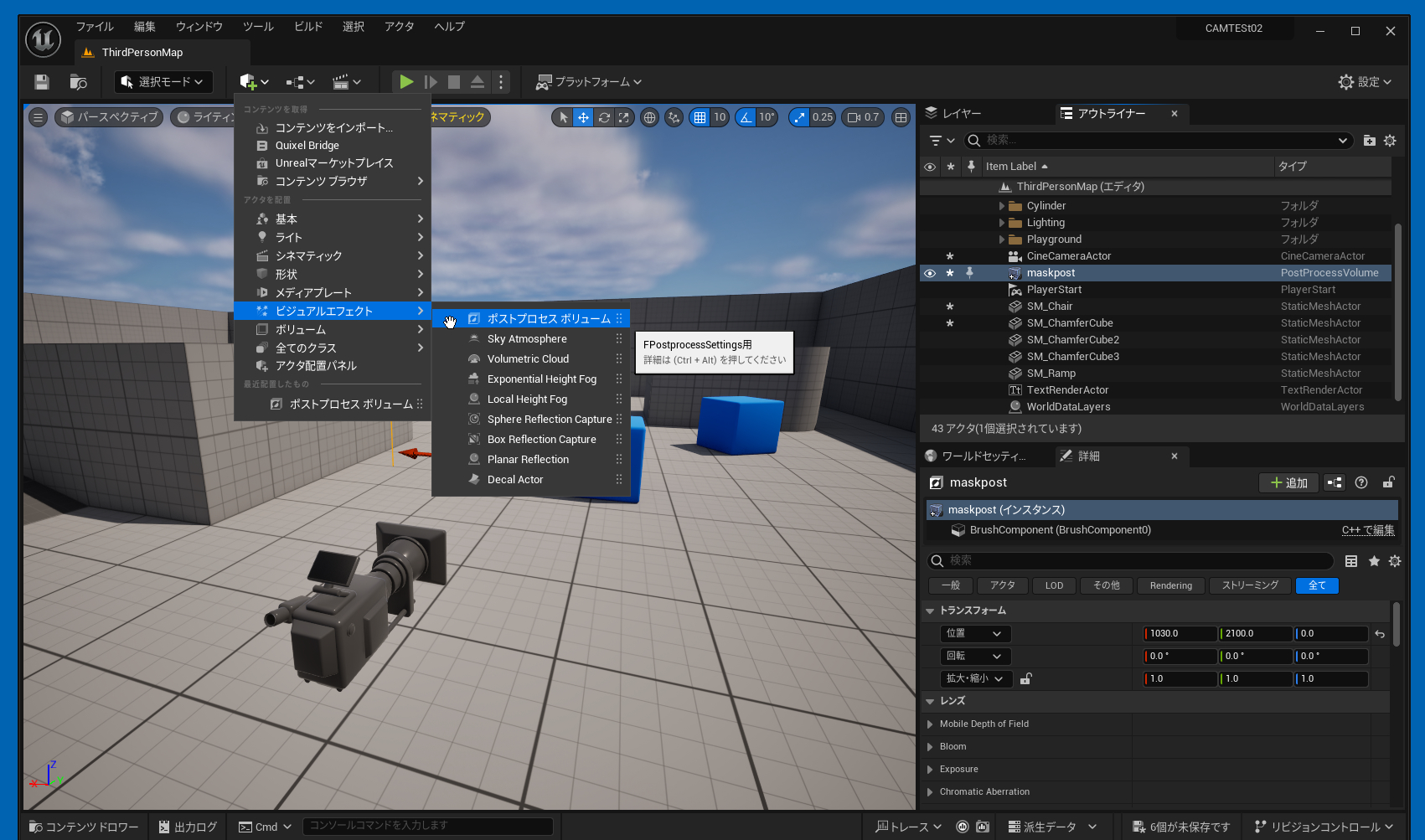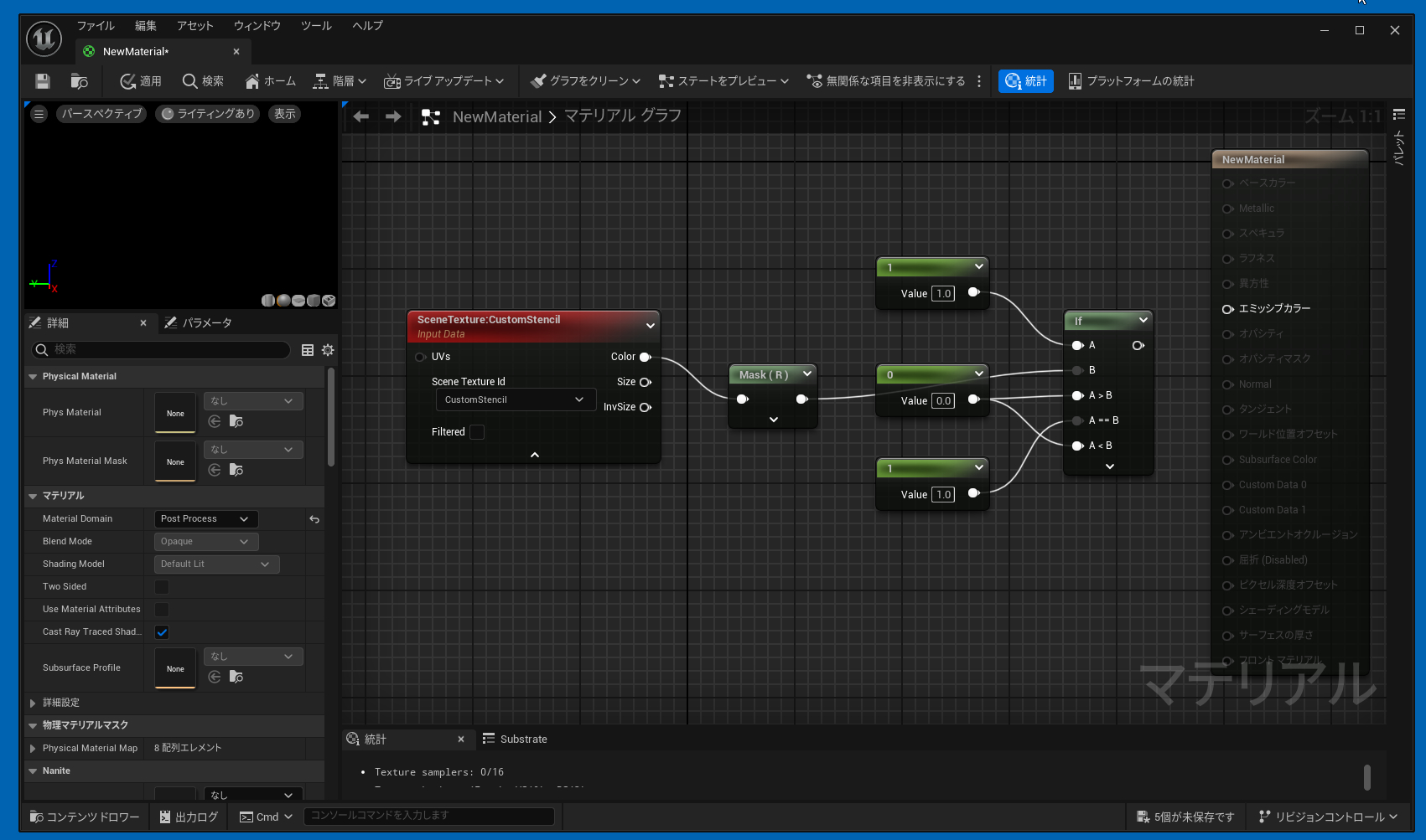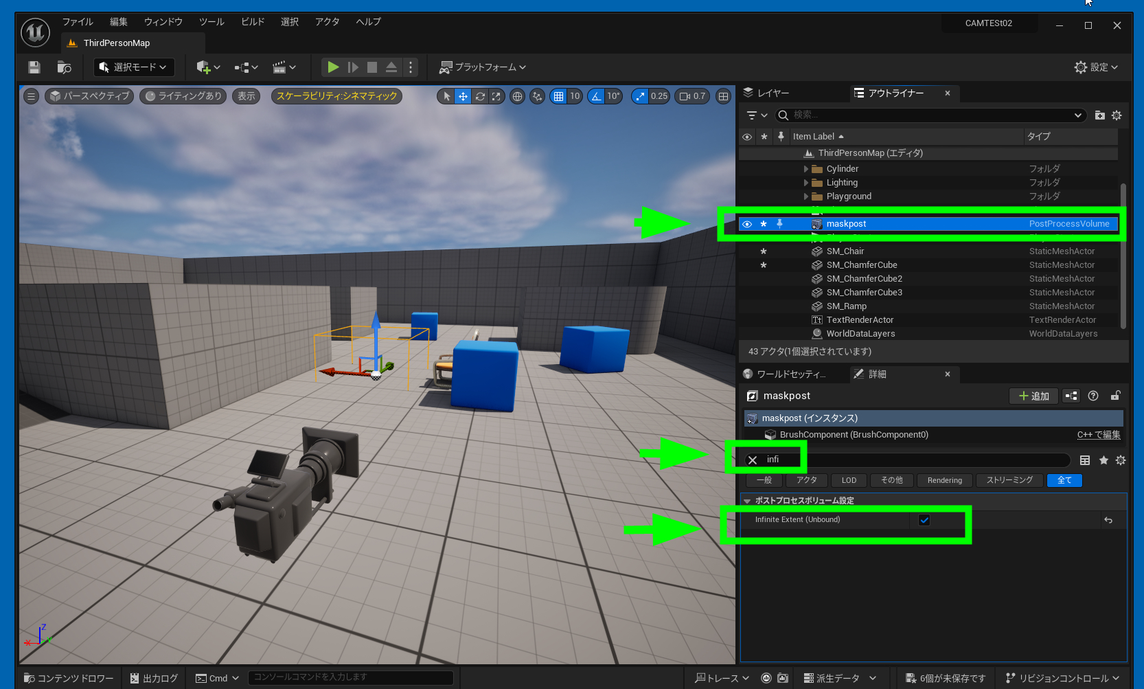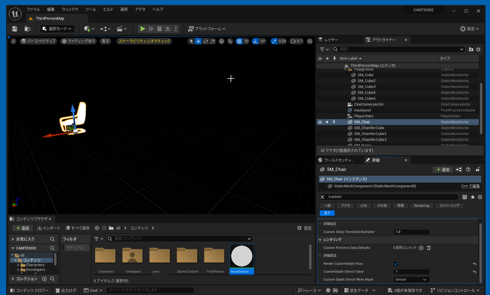 動画素材の書き出しで、動画背景を透過させることもできます。合成作業を行う際に非常に便利です。しかし背景の透過設定を有効にするとアンチエリアス機能が使用できなくなることがあります。いろいろ使えない機能も出てきます。アンチエリアスは画像や映像のエッジを滑らかにする技術であり、映像素材として使う場合には必須の機能です。 そこでマスキングです。マスキングは、特定のオブジェクトやキャラクターを独立させ、背景や他の要素から分離する技術です。特定のエフェクトを適用する際に他のシーン要素に影響を与えずに済みます。ほかにもいろいろ便利です。以下、椅子だけマスクをかけてみました。 UE5でのマスキングと合成の利用は、映像制作プロセスにおいて、特にポストプロダクションの段階でその真価を発揮します。例えば、レンダリングされたシーンに後から特定のエフェクトを加えたり、実写映像を組み合わせる場合などが考えられます。使えるとスゲー便利という訳です。 そこで素晴らしい記事がこちらです。以下にUE5のマスキング方法が説明されています。実際にやってみましょう。マスクを作って、そのあとアフターエフェクトでマスクをかける方法まで紹介します。 [UE5]ポストプロセスを使ったマスク作成 https://note.com/logic_magic/n/n37bd20b829e3 適当なシーンを作りイスを設定しました。手前にブロックも用意です。 コンテンツにマテリアルを作ります。 BlendModeをポストプロセスにします。 そして以下コードをマテリアルグラフに貼り付けます。図を見て自分で作ってもOKですが、文字列をペースするだけでも貼り付けできるの知ってましたか?よくブループリントを作ってくださいと図が掲載あれますが、文字列で掲載してくれると便利です。最後のif出力をのエミッシブカラーに接続してください。 https://docs.google.com/document/d/1X9iklewIujinUY2ucjaAHAXjpq3fK7VR2qVmxWlHKQo/edit?usp=sharing ポストプロセスボリュームを作ります。分かりやすい適当な名前をつけます。 範囲を全体に設定します。 ポストプロセスボリュームのポストプロセスマテリアルのアレイに、先ほど作ったマテリアルを設定します。この辺が分からない場合は、先のマスク記事を参考にしてください。あちらの方が分かりやすいです。 設定が反映されて真暗です。 ライティングなしに設定します。 プロジェクト設定(エンジンレンダリング)にある「カスタム深度ステンシルパス」のプルダウンを開きます。 Enabled with Stencllにします。 マスクしたいイスを選択します。customで以下のように設定します。 ライティングありに戻すと、椅子だけ白くマスクされます。 手前のキューブに対してマスクを外したい場合は、手前の物体を選択して値を0にします。以下写真はチェックを外していますが、チェックを入れたまま、値を0が正しいかもです。 ムービーレンダーキューで書き出します。ムービーレンダーキューの使い方は説明しません。分からない場合は検索してください。マスクをかけた動画と、マスクなしの動画を書き出します。 マスクありと、マスクなしを書き出したました。連番のexrで書き出しています。 After Effectsで静止画連番を取り込みます。この取り込み方法についても説明しません。分からない場合は、検索してください。 マスク有とマスク無をタイムラインに並べます。右クリックで、列を表示でモードとスイッチを表示します。 トラックマットで選択して、ルミナンスマットを選択するとマスクがかかり、背景が透過します。どっちを上にして、どっちをどうするか忘れてしまいました。分からない場合はぐぐってください。 という感じで、白黒のマスクで椅子だけくり抜けました。それでこんな風に動画を合成したりできます。