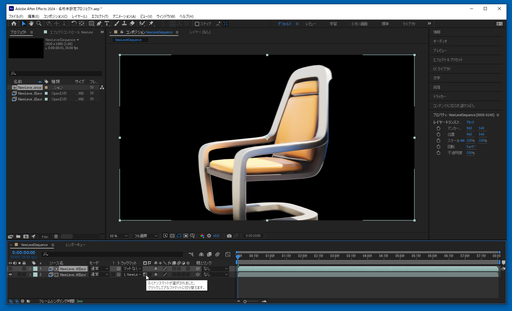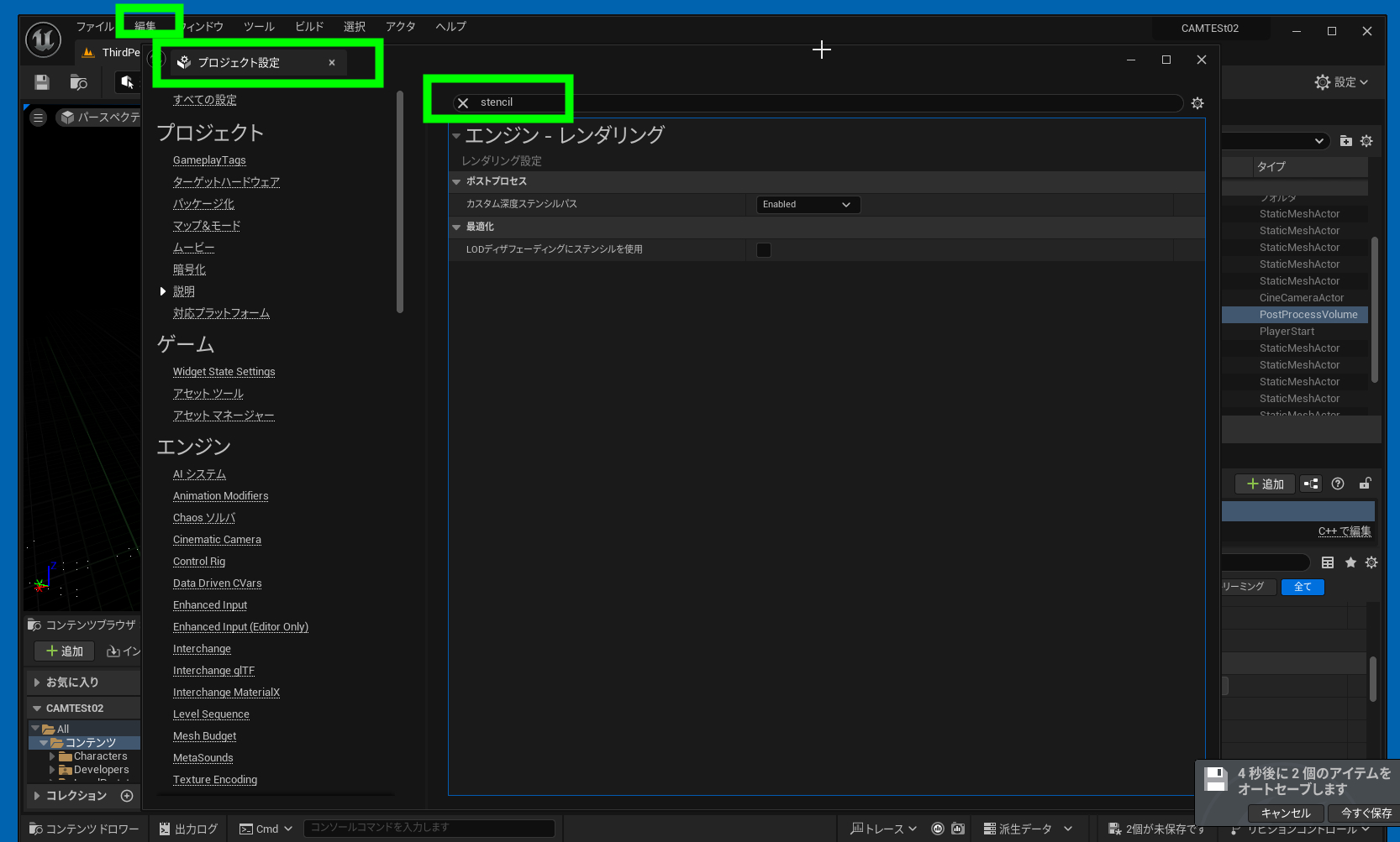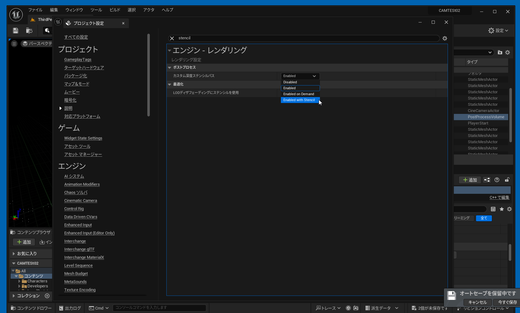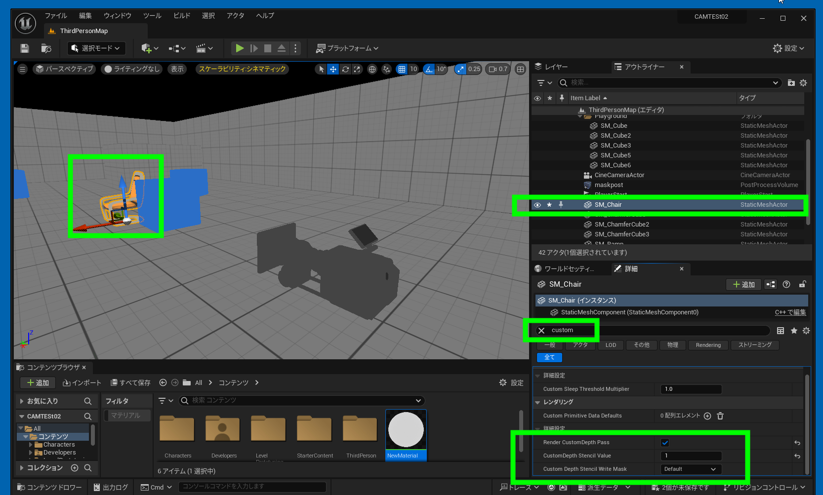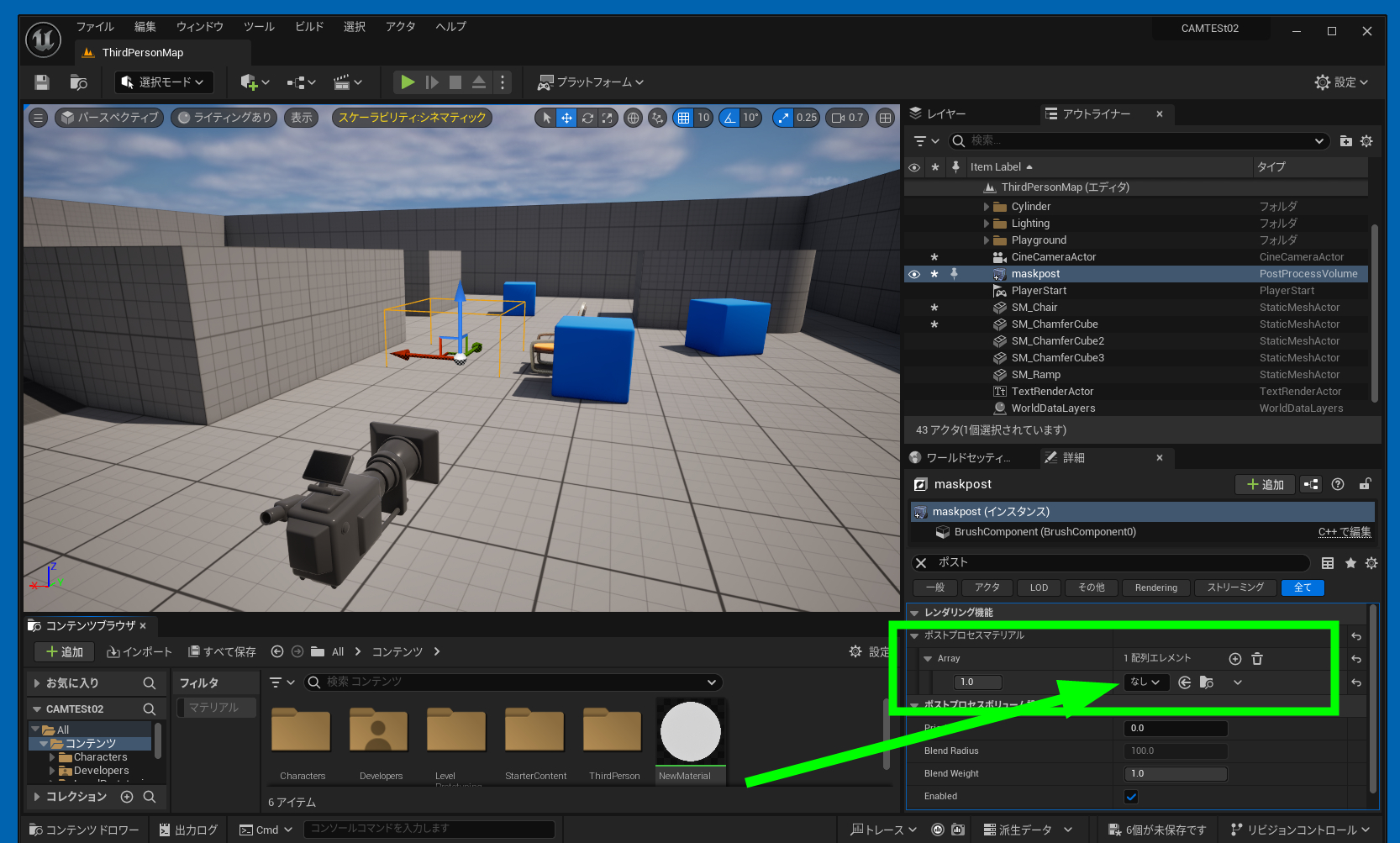 動画素材の書き出しで、動画背景を透過させることもできます。合成作業を行う際に非常に便利です。しかし背景の透過設定を有効にするとアンチエリアス機能が使用できなくなることがあります。いろいろ使えない機能も出てきます。アンチエリアスは画像や映像のエッジを滑らかにする技術であり、映像素材として使う場合には必須の機能です。 そこでマスキングです。マスキングは、特定のオブジェクトやキャラクターを独立させ、背景や他の要素から分離する技術です。特定のエフェクトを適用する際に他のシーン要素に影響を与えずに済みます。ほかにもいろいろ便利です。以下、椅子だけマスクをかけてみました。 UE5でのマスキングと合成の利用は、映像制作プロセスにおいて、特にポストプロダクションの段階でその真価を発揮します。例えば、レンダリングされたシーンに後から特定のエフェクトを加えたり、実写映像を組み合わせる場合などが考えられます。使えるとスゲー便利という訳です。 そこで素晴らしい記事がこちらです。以下にUE5のマスキング方法が説明されています。実際にやってみましょう。マスクを作って、そのあとアフターエフェクトでマスクをかける方法まで紹介します。 [UE5]ポストプロセスを使ったマスク作成 https://note.com/logic_magic/n/n37bd20b829e3 適当なシーンを作りイスを設定しました。手前にブロックも用意です。 コンテンツにマテリアルを作ります。 BlendModeをポストプロセスにします。 そして以下コードをマテリアルグラフに貼り付けます。図を見て自分で作ってもOKですが、文字列をペースするだけでも貼り付けできるの知ってましたか?よくブループリントを作ってくださいと図が掲載あれますが、文字列で掲載してくれると便利です。最後のif出力をのエミッシブカラーに接続してください。 https://docs.google.com/document/d/1X9iklewIujinUY2ucjaAHAXjpq3fK7VR2qVmxWlHKQo/edit?usp=sharing ポストプロセスボリュームを作ります。分かりやすい適当な名前をつけます。 範囲を全体に設定します。 ポストプロセスボリュームのポストプロセスマテリアルのアレイに、先ほど作ったマテリアルを設定します。この辺が分からない場合は、先のマスク記事を参考にしてください。あちらの方が分かりやすいです。 設定が反映されて真暗です。 ライティングなしに設定します。 プロジェクト設定(エンジンレンダリング)にある「カスタム深度ステンシルパス」のプルダウンを開きます。 Enabled with Stencllにします。 マスクしたいイスを選択します。customで以下のように設定します。 ライティングありに戻すと、椅子だけ白くマスクされます。 手前のキューブに対してマスクを外したい場合は、手前の物体を選択して値を0にします。以下写真はチェックを外していますが、チェックを入れたまま、値を0が正しいかもです。 ムービーレンダーキューで書き出します。ムービーレンダーキューの使い方は説明しません。分からない場合は検索してください。マスクをかけた動画と、マスクなしの動画を書き出します。 マスクありと、マスクなしを書き出したました。連番のexrで書き出しています。 After Effectsで静止画連番を取り込みます。この取り込み方法についても説明しません。分からない場合は、検索してください。 マスク有とマスク無をタイムラインに並べます。右クリックで、列を表示でモードとスイッチを表示します。 トラックマットで選択して、ルミナンスマットを選択するとマスクがかかり、背景が透過します。どっちを上にして、どっちをどうするか忘れてしまいました。分からない場合はぐぐってください。 という感じで、白黒のマスクで椅子だけくり抜けました。それでこんな風に動画を合成したりできます。