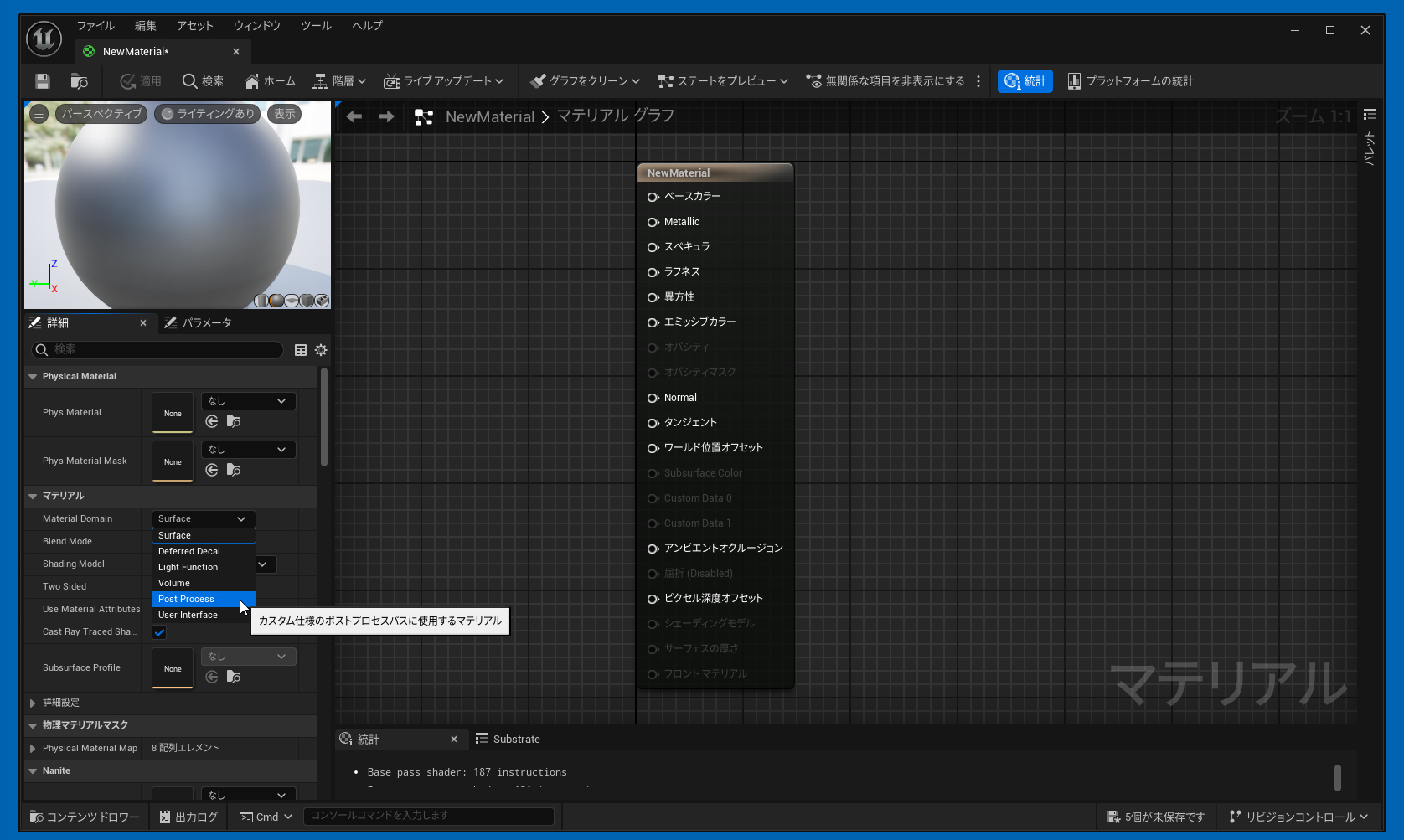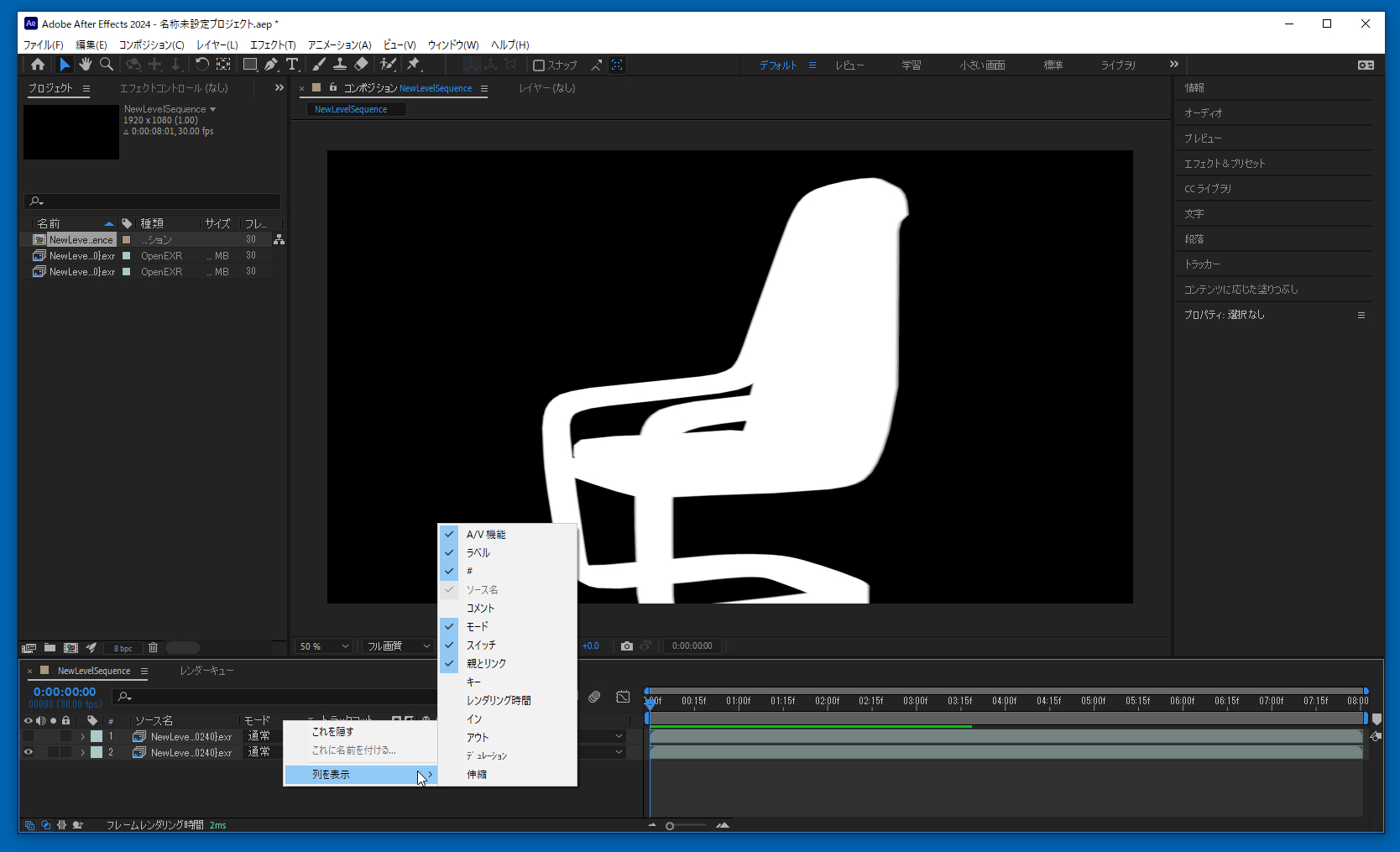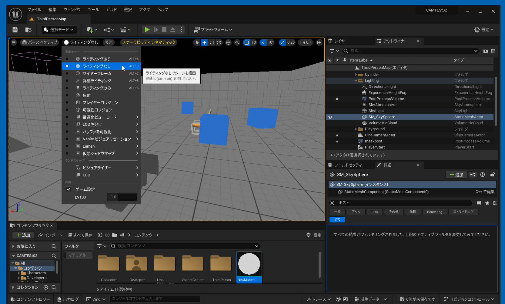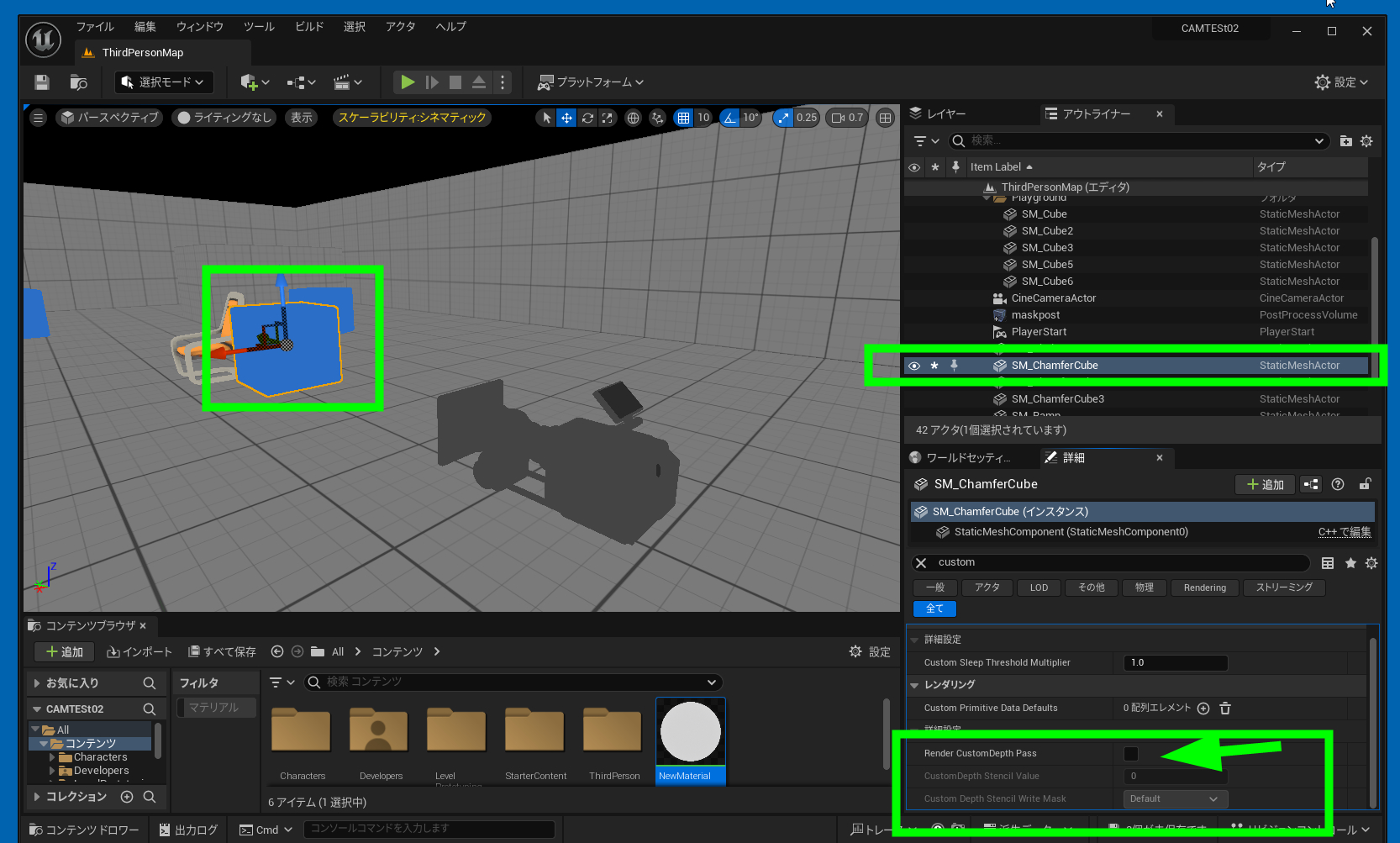 動画素材の書き出しで、動画背景を透過させることもできます。合成作業を行う際に非常に便利です。しかし背景の透過設定を有効にするとアンチエリアス機能が使用できなくなることがあります。いろいろ使えない機能も出てきます。アンチエリアスは画像や映像のエッジを滑らかにする技術であり、映像素材として使う場合には必須の機能です。 そこでマスキングです。マスキングは、特定のオブジェクトやキャラクターを独立させ、背景や他の要素から分離する技術です。特定のエフェクトを適用する際に他のシーン要素に影響を与えずに済みます。ほかにもいろいろ便利です。以下、椅子だけマスクをかけてみました。 UE5でのマスキングと合成の利用は、映像制作プロセスにおいて、特にポストプロダクションの段階でその真価を発揮します。例えば、レンダリングされたシーンに後から特定のエフェクトを加えたり、実写映像を組み合わせる場合などが考えられます。使えるとスゲー便利という訳です。 そこで素晴らしい記事がこちらです。以下にUE5のマスキング方法が説明されています。実際にやってみましょう。マスクを作って、そのあとアフターエフェクトでマスクをかける方法まで紹介します。 [UE5]ポストプロセスを使ったマスク作成 https://note.com/logic_magic/n/n37bd20b829e3 適当なシーンを作りイスを設定しました。手前にブロックも用意です。 コンテンツにマテリアルを作ります。 BlendModeをポストプロセスにします。 そして以下コードをマテリアルグラフに貼り付けます。図を見て自分で作ってもOKですが、文字列をペースするだけでも貼り付けできるの知ってましたか?よくブループリントを作ってくださいと図が掲載あれますが、文字列で掲載してくれると便利です。最後のif出力をのエミッシブカラーに接続してください。 https://docs.google.com/document/d/1X9iklewIujinUY2ucjaAHAXjpq3fK7VR2qVmxWlHKQo/edit?usp=sharing ポストプロセスボリュームを作ります。分かりやすい適当な名前をつけます。 範囲を全体に設定します。 ポストプロセスボリュームのポストプロセスマテリアルのアレイに、先ほど作ったマテリアルを設定します。この辺が分からない場合は、先のマスク記事を参考にしてください。あちらの方が分かりやすいです。 設定が反映されて真暗です。 ライティングなしに設定します。 プロジェクト設定(エンジンレンダリング)にある「カスタム深度ステンシルパス」のプルダウンを開きます。 Enabled with Stencllにします。 マスクしたいイスを選択します。customで以下のように設定します。 ライティングありに戻すと、椅子だけ白くマスクされます。 手前のキューブに対してマスクを外したい場合は、手前の物体を選択して値を0にします。以下写真はチェックを外していますが、チェックを入れたまま、値を0が正しいかもです。 ムービーレンダーキューで書き出します。ムービーレンダーキューの使い方は説明しません。分からない場合は検索してください。マスクをかけた動画と、マスクなしの動画を書き出します。 マスクありと、マスクなしを書き出したました。連番のexrで書き出しています。 After Effectsで静止画連番を取り込みます。この取り込み方法についても説明しません。分からない場合は、検索してください。 マスク有とマスク無をタイムラインに並べます。右クリックで、列を表示でモードとスイッチを表示します。 トラックマットで選択して、ルミナンスマットを選択するとマスクがかかり、背景が透過します。どっちを上にして、どっちをどうするか忘れてしまいました。分からない場合はぐぐってください。 という感じで、白黒のマスクで椅子だけくり抜けました。それでこんな風に動画を合成したりできます。
