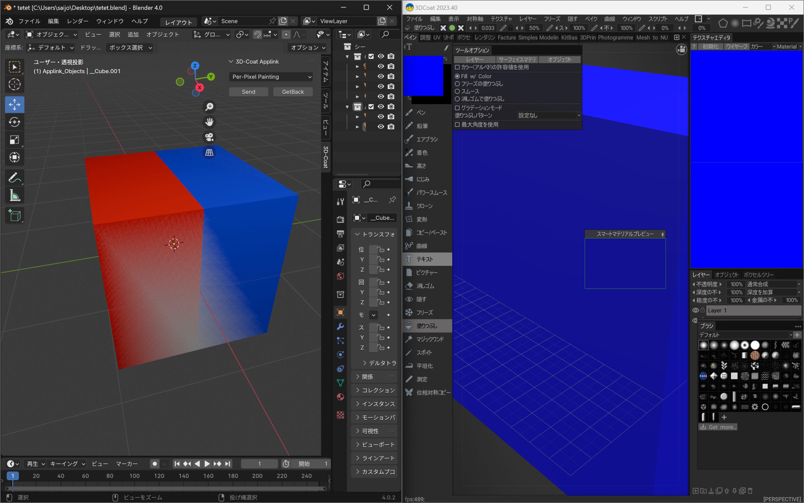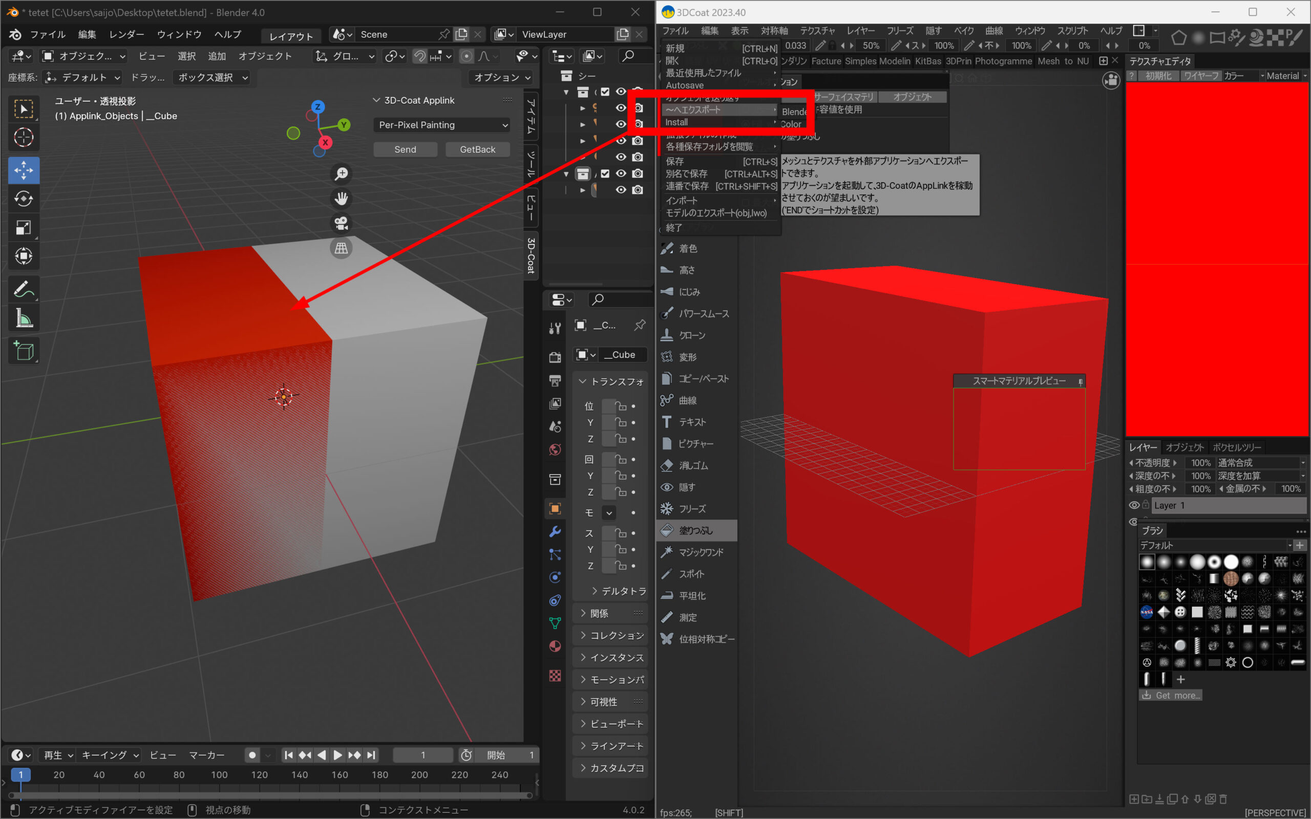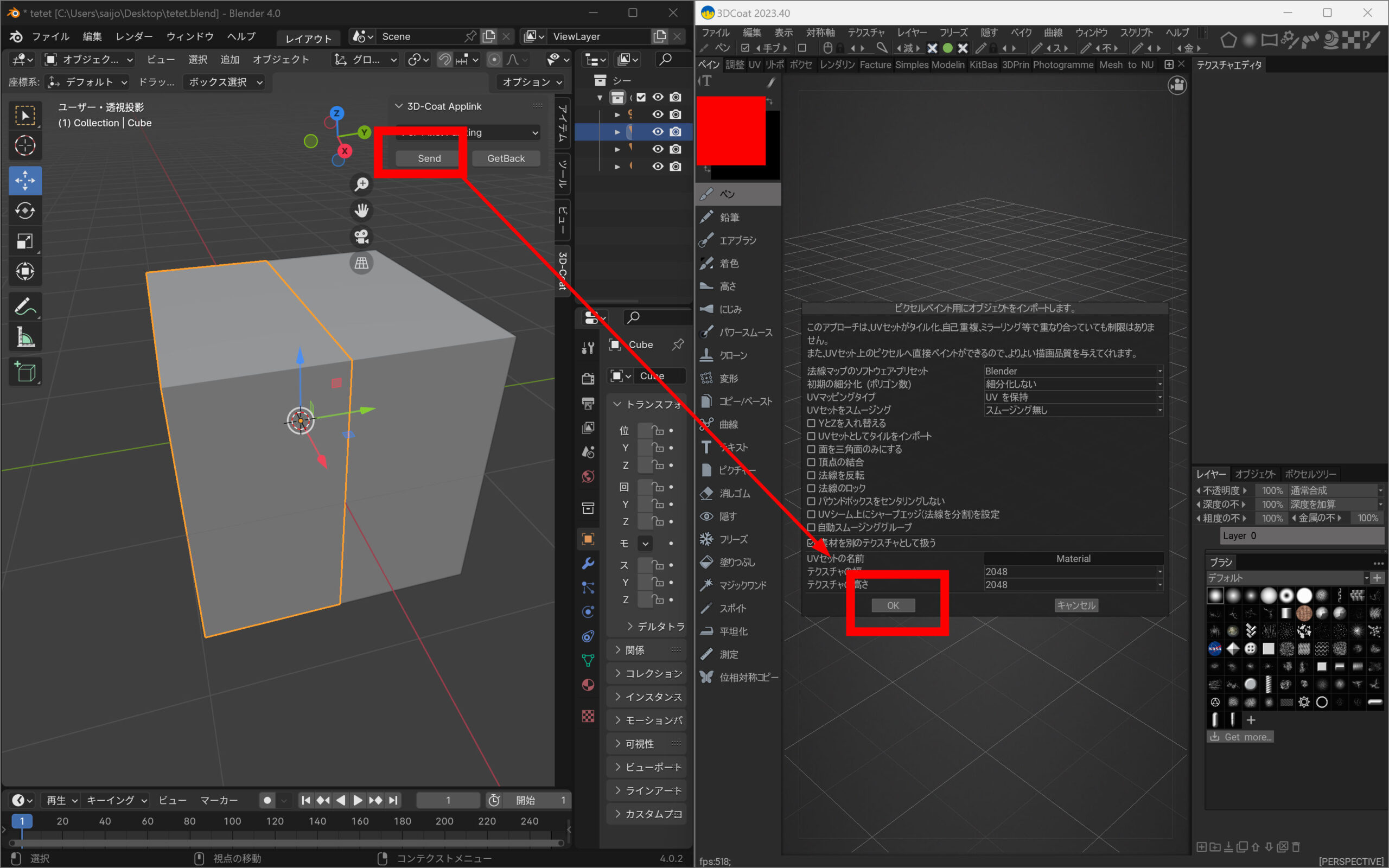 3Dcoatにオブジェクトを送ります。2つ同時に送るとテクスチャーがよくわからないことになるので、片側づつ3Dcoatに送信しましょう。