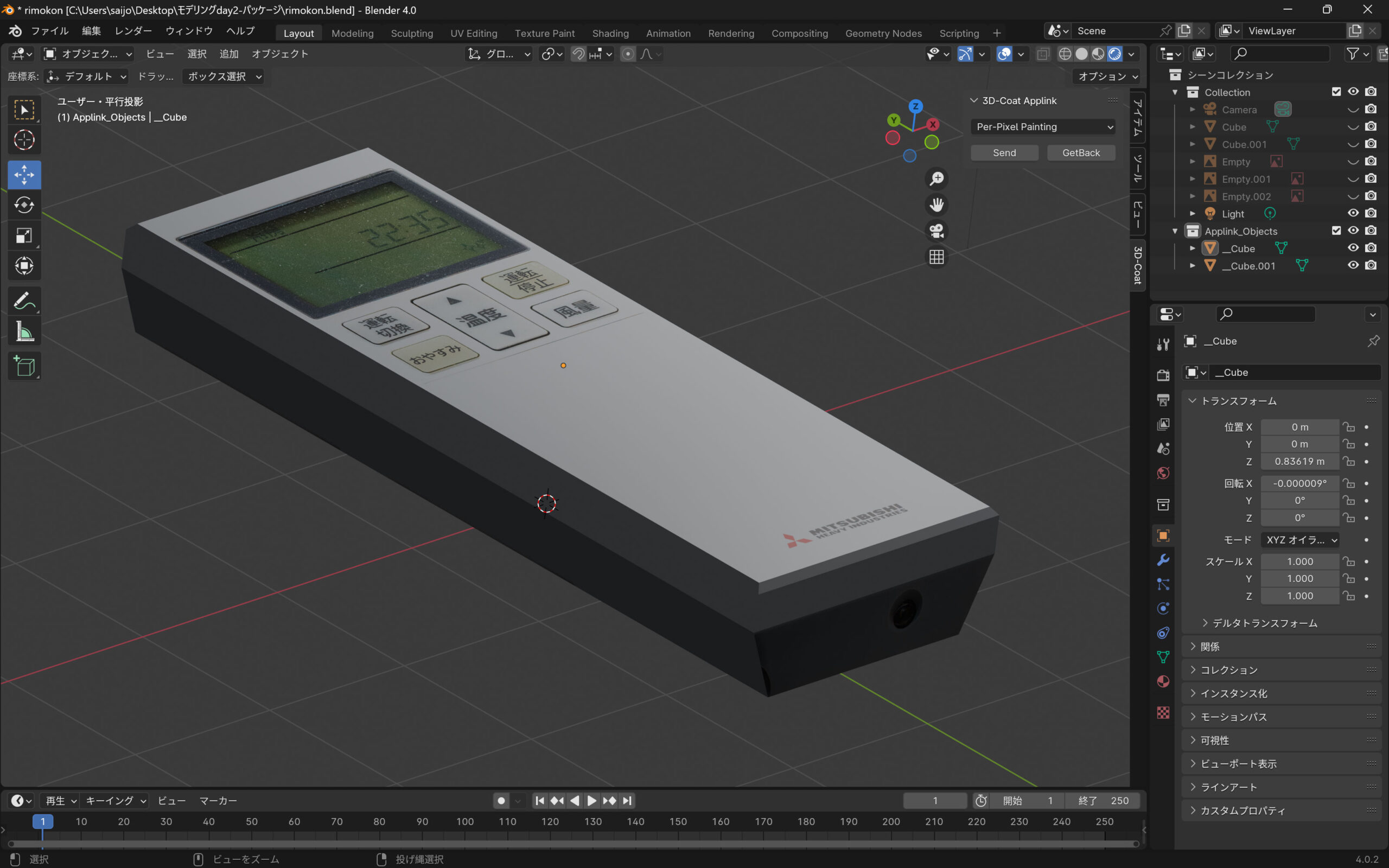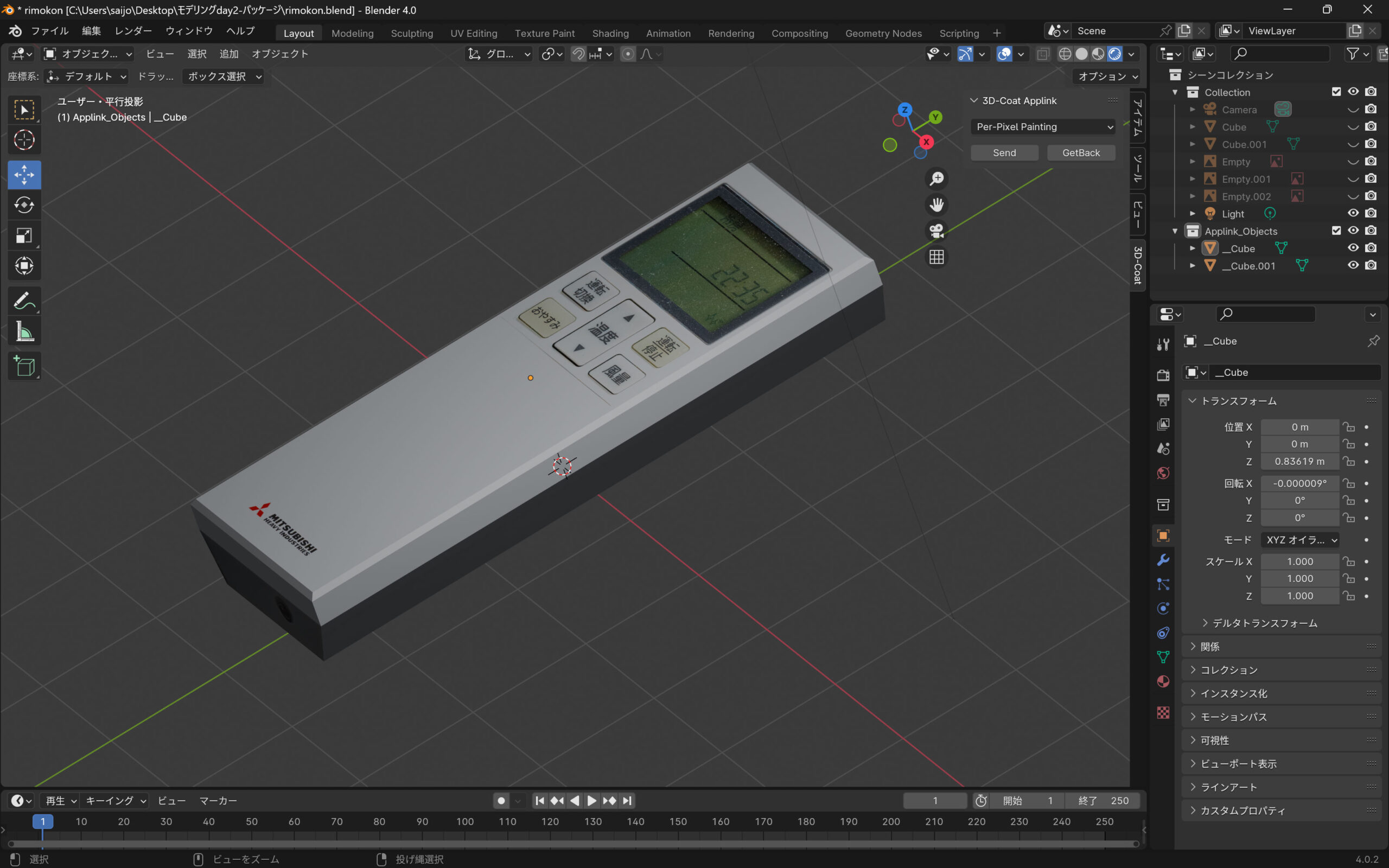 3D-Coat https://3dcoat.com/ オブジェクトをBlenderで2分割して、切れてしまったメッシュを埋めて、二つのオブジェクトにする方法を説明します。二つのオブジェクトにする方法を利用してリモコンをモデリングして3Dcoatでテクスチャリングしてみます。