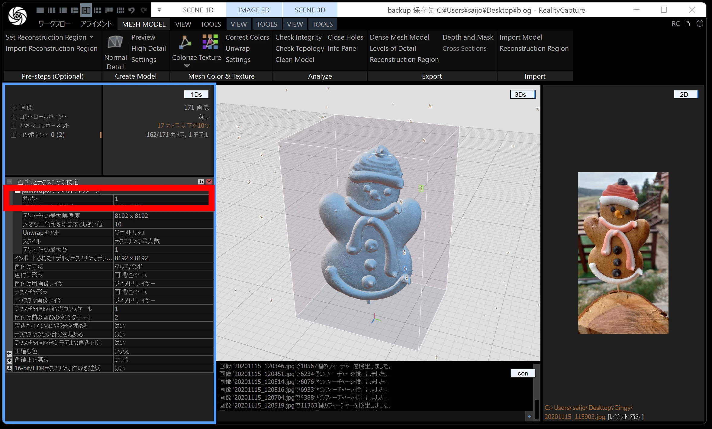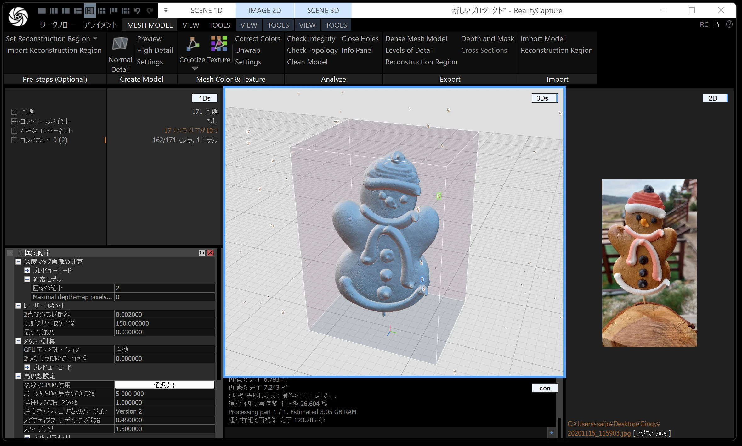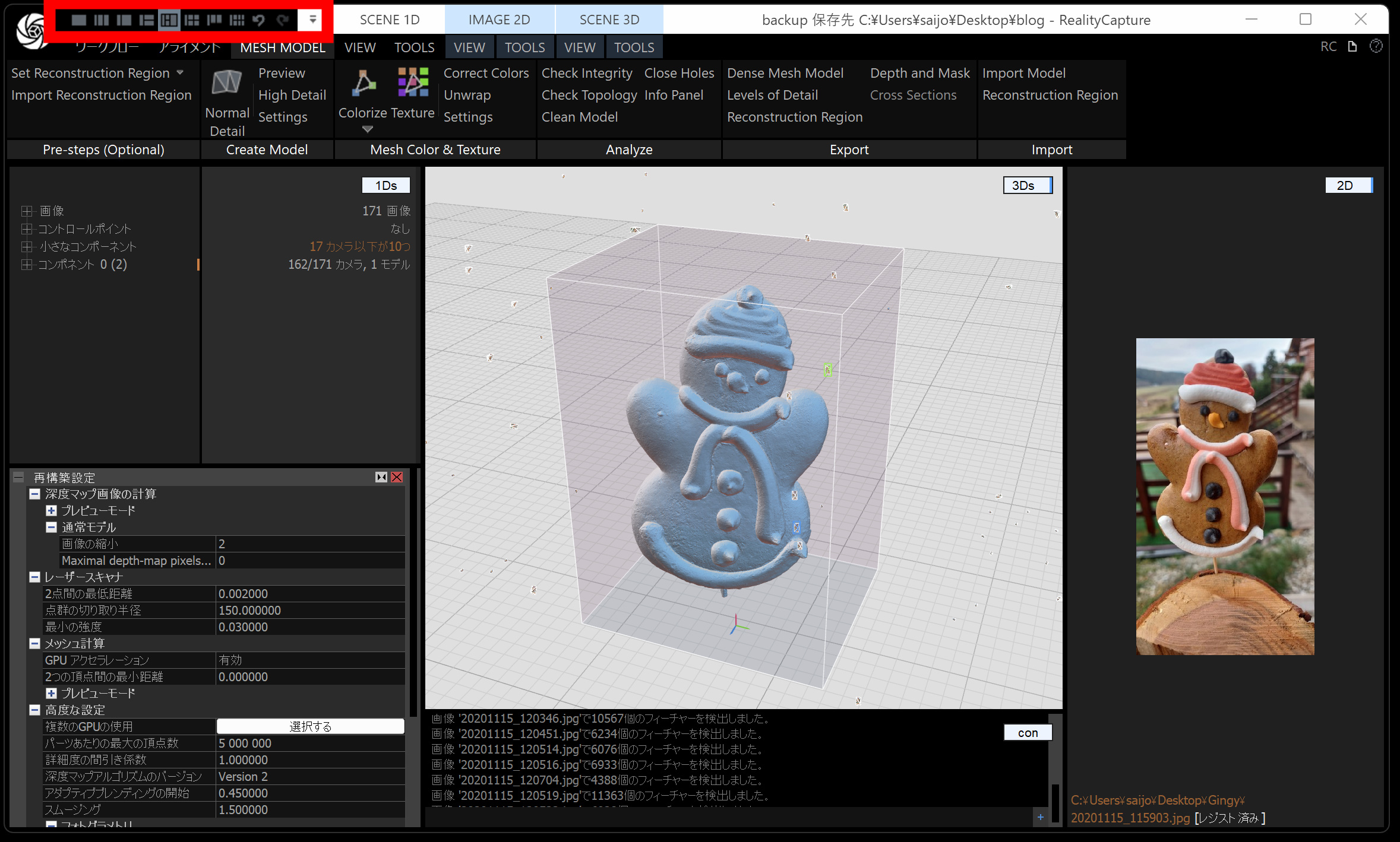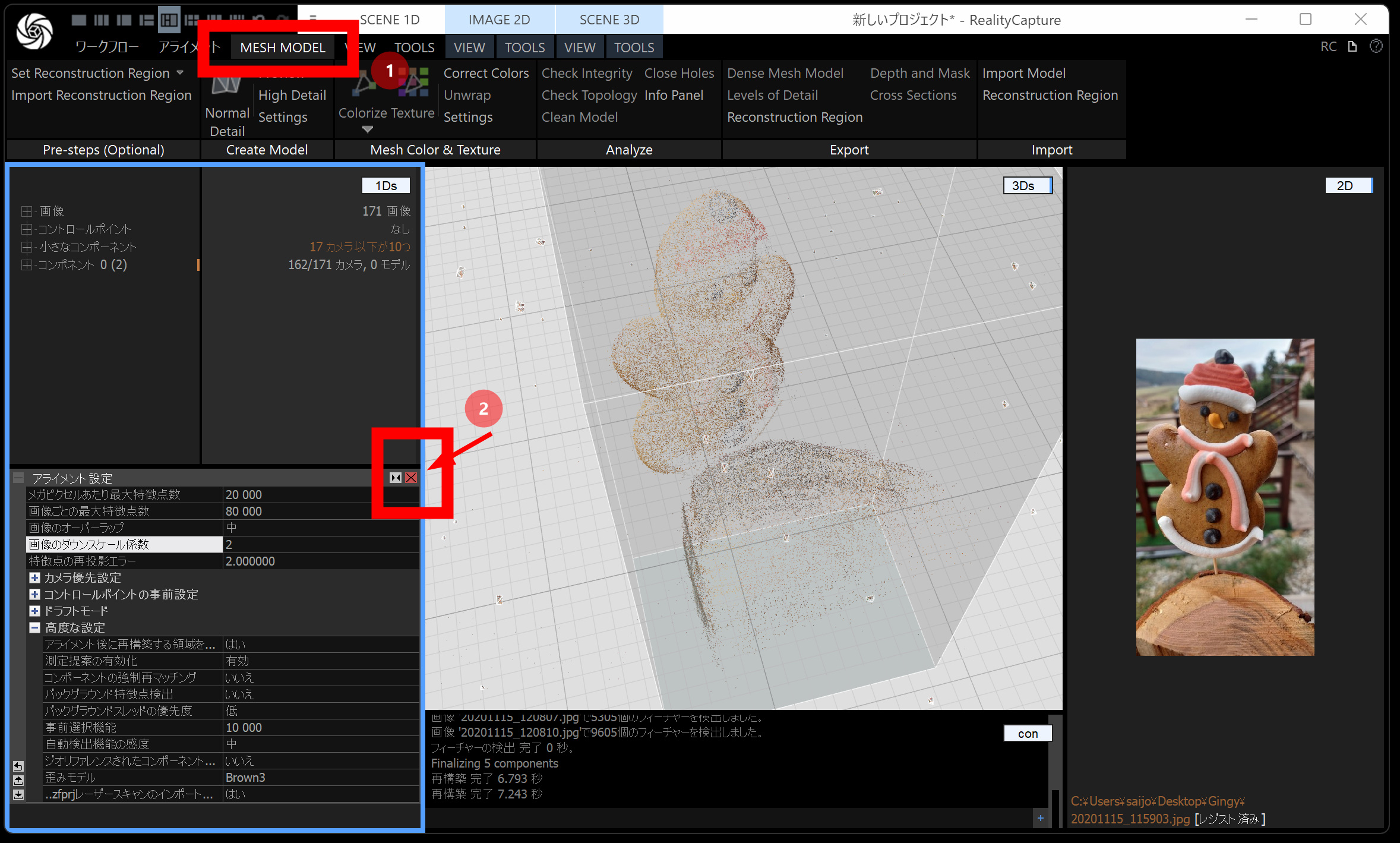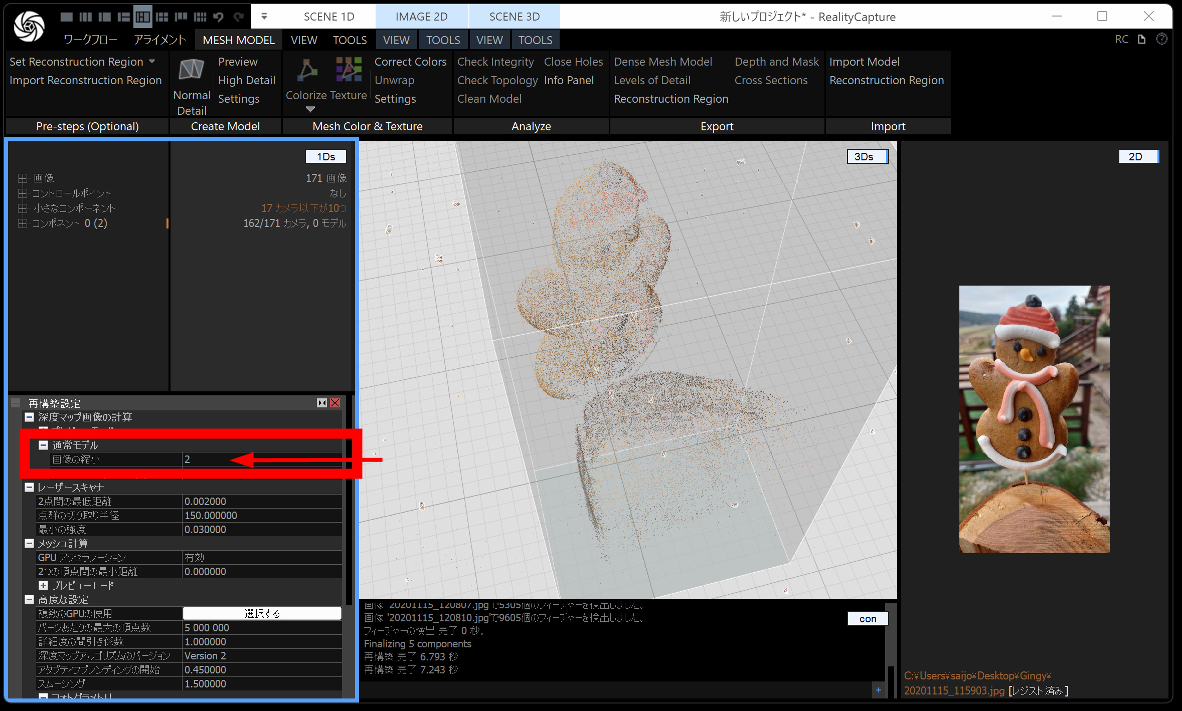 メッシュモデルは、点群から メッシュ(三角形ポリゴン) を作る工程です。時間がかかるので、通常モデル・画像の縮小を 2 くらいにしておくと負荷が下がります。