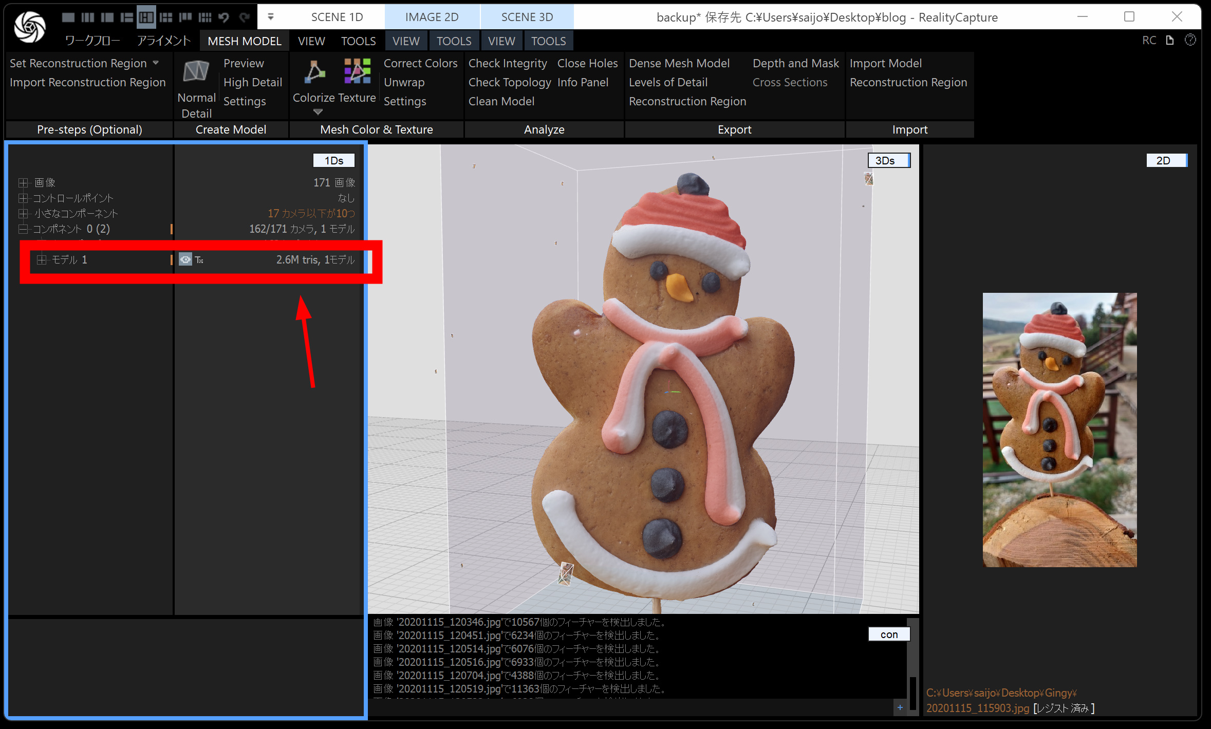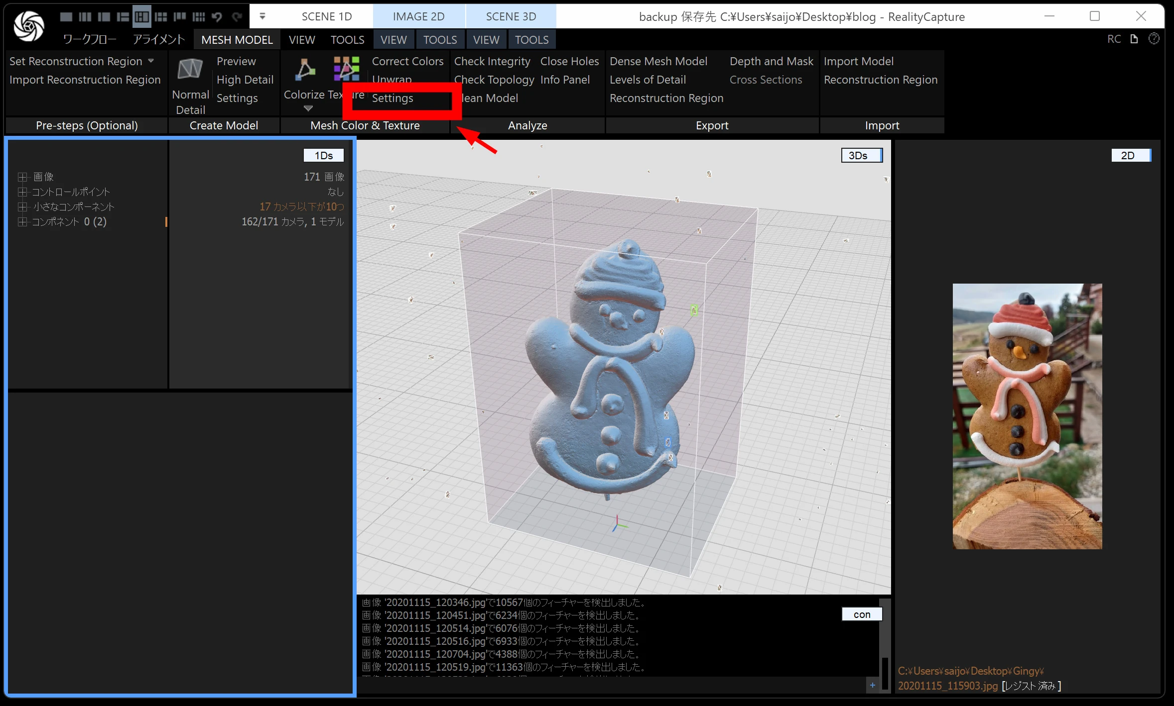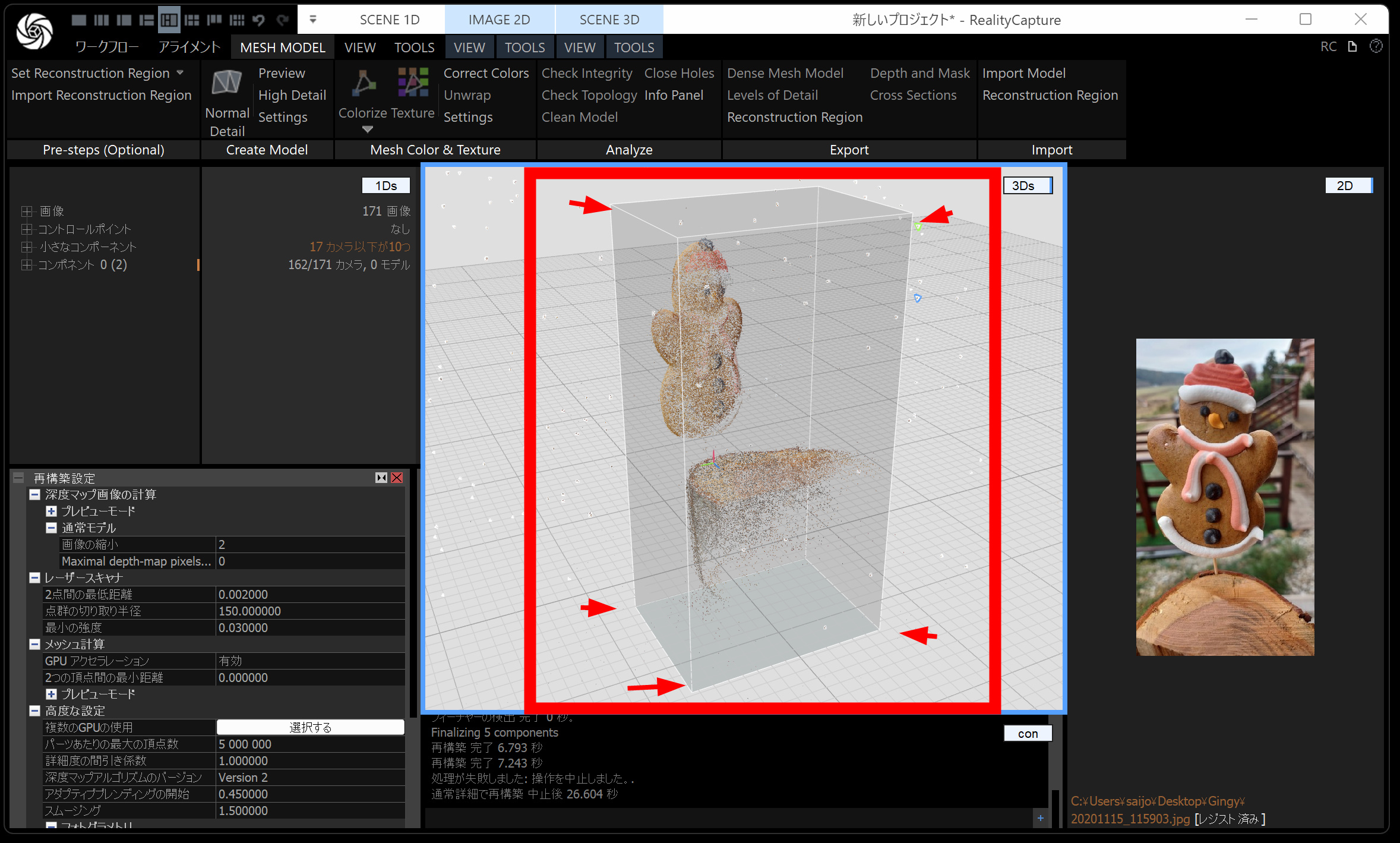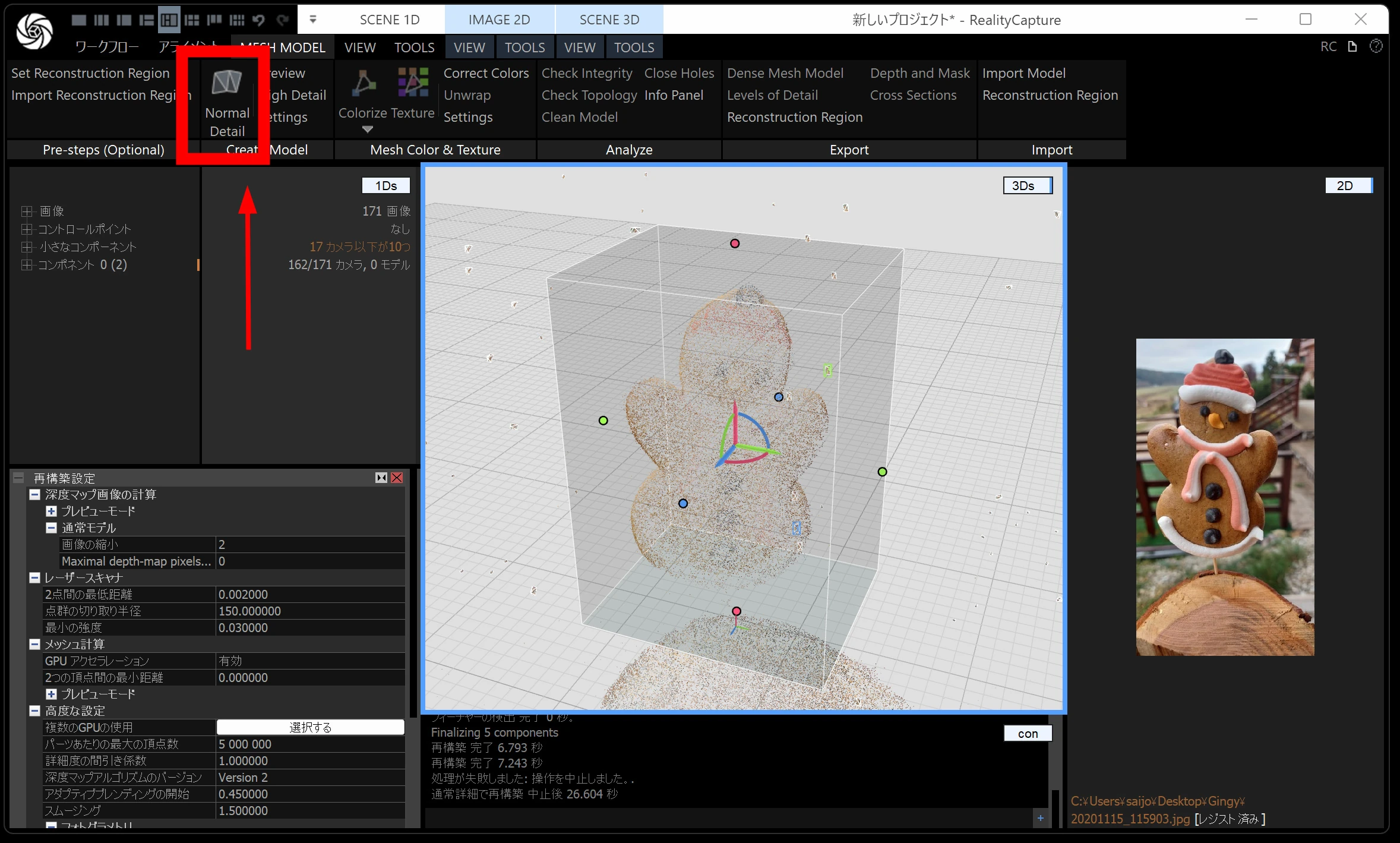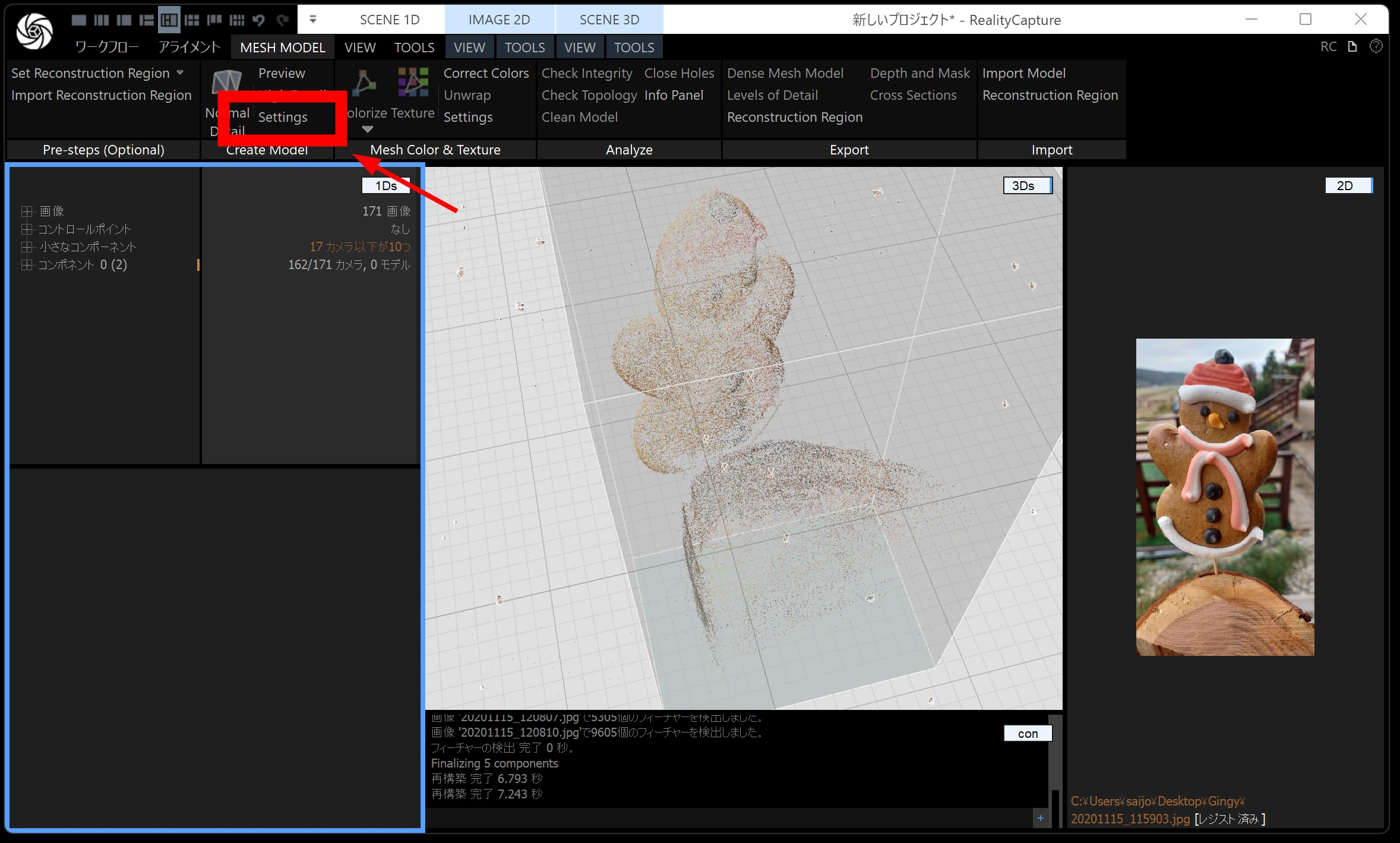メッシュモデルは、点群から メッシュ(三角形ポリゴン) を作る工程です。時間がかかるので、通常モデル・画像の縮小を 2 くらいにしておくと負荷が下がります。