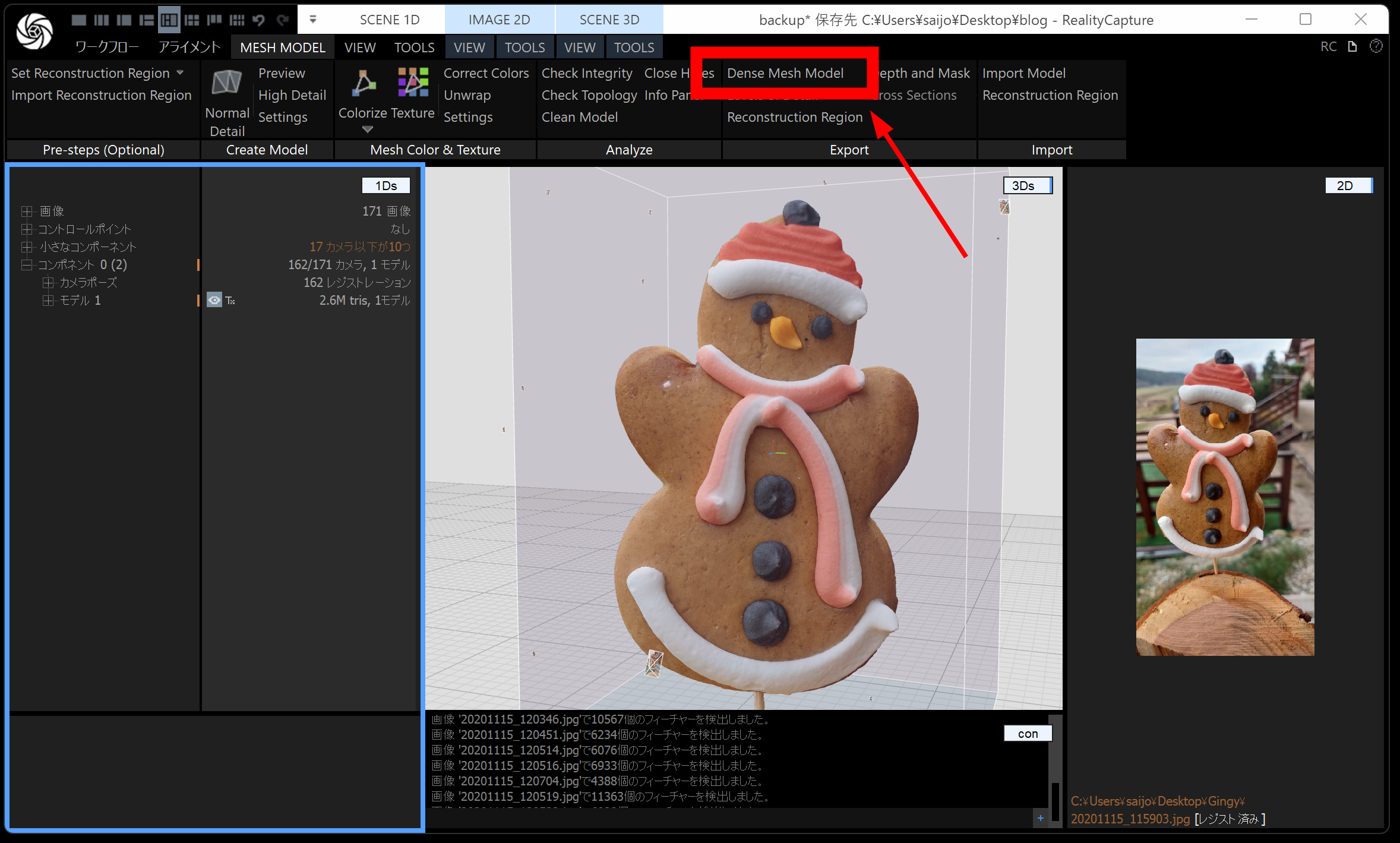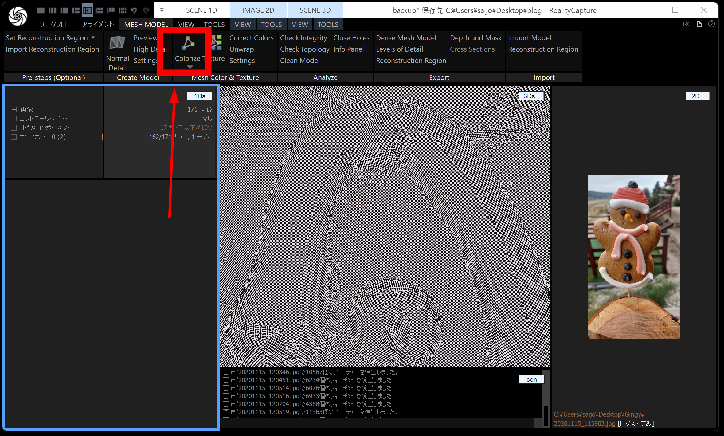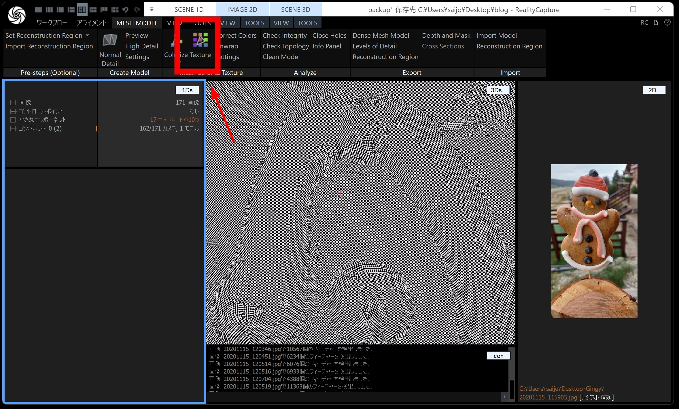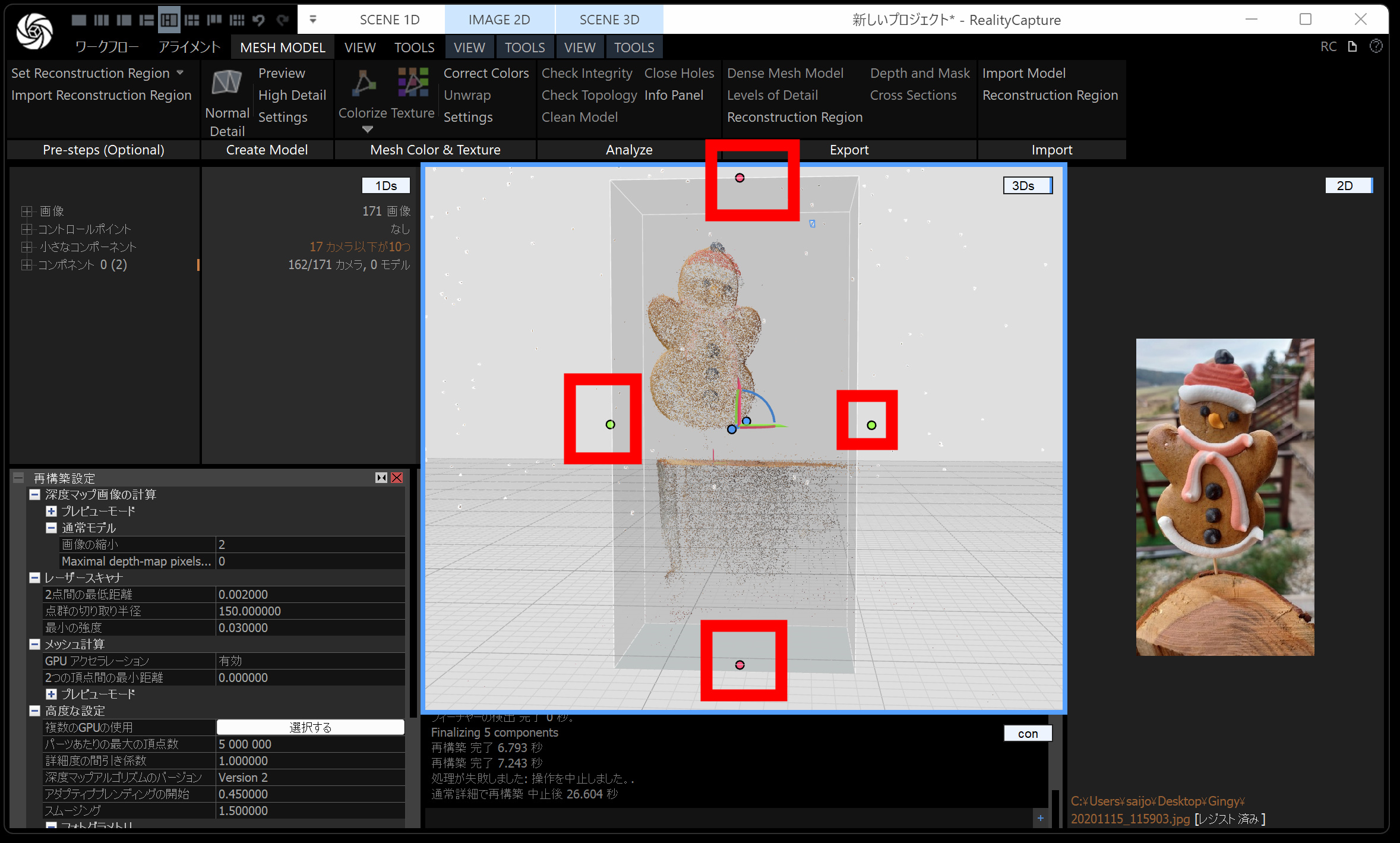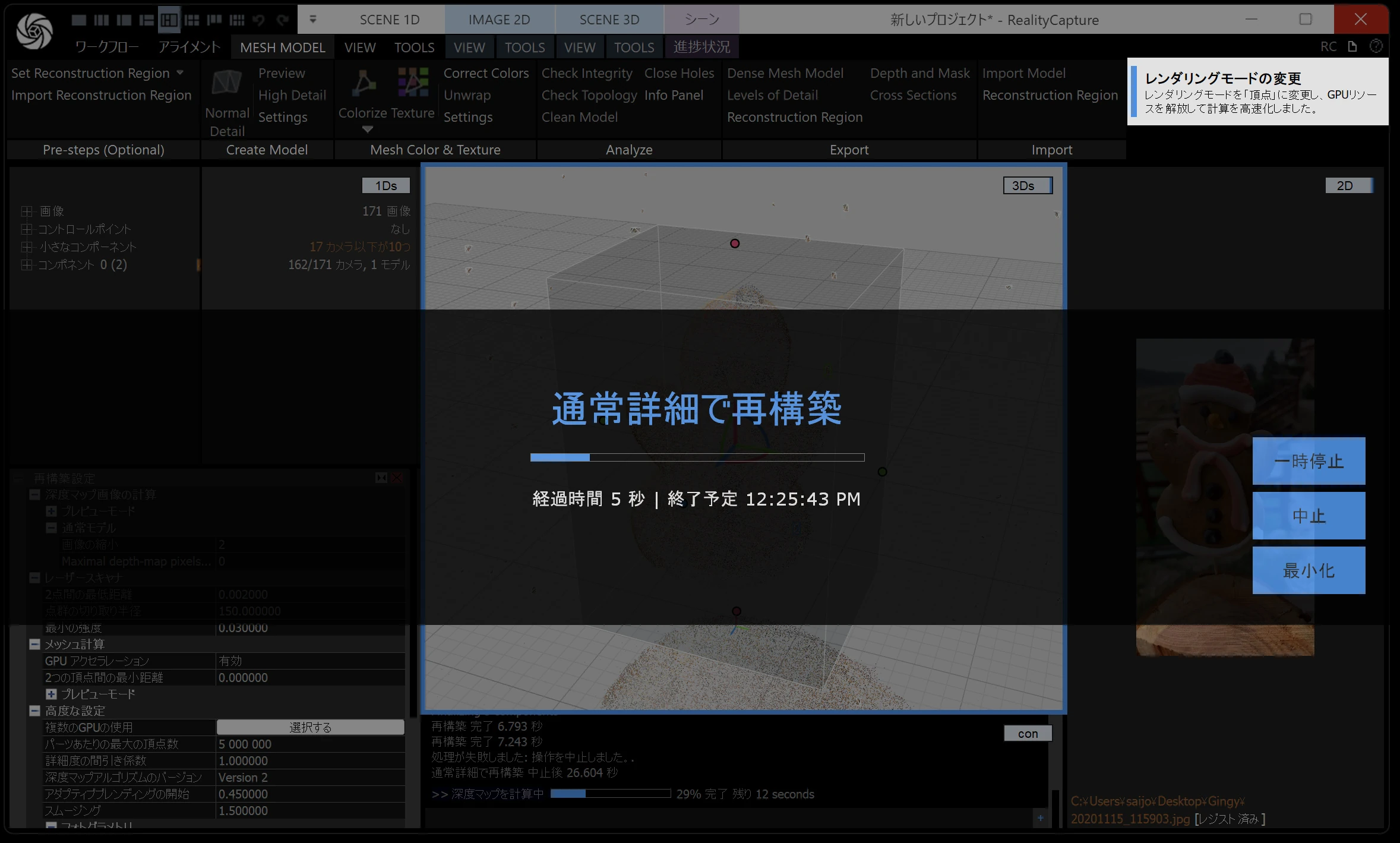 メッシュモデルは、点群から メッシュ(三角形ポリゴン) を作る工程です。時間がかかるので、通常モデル・画像の縮小を 2 くらいにしておくと負荷が下がります。