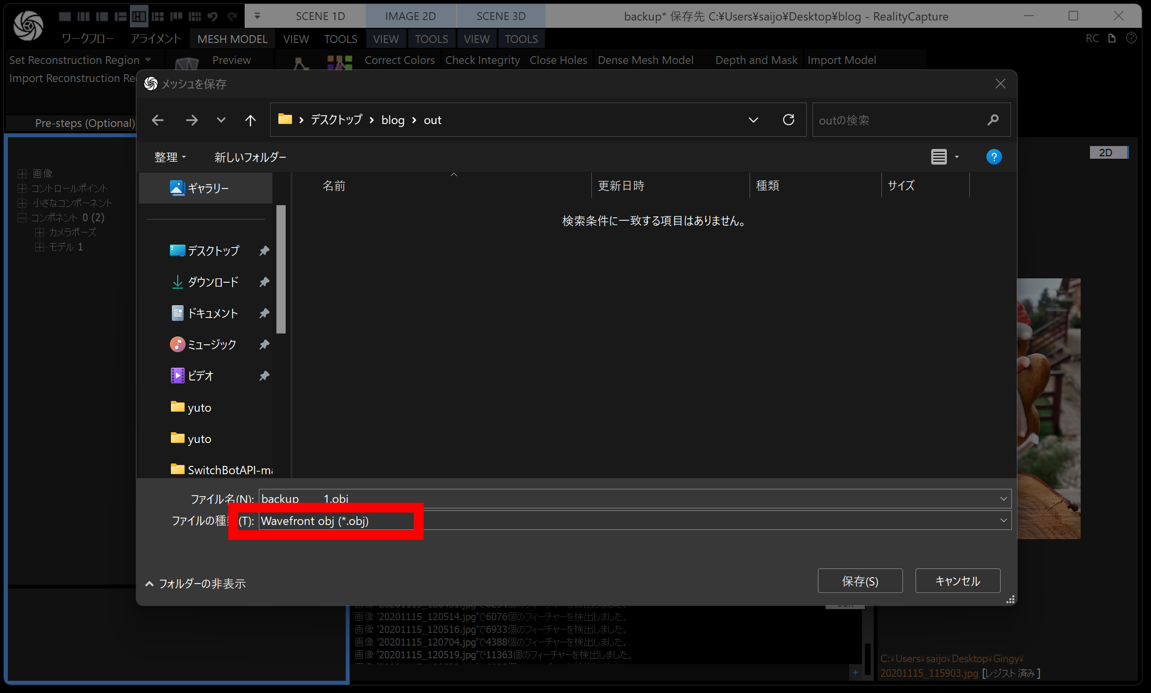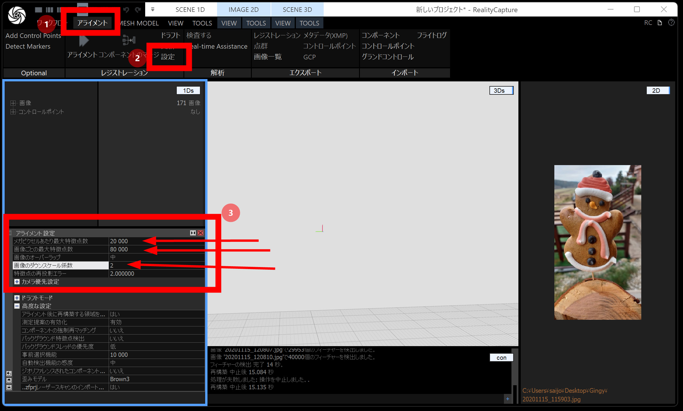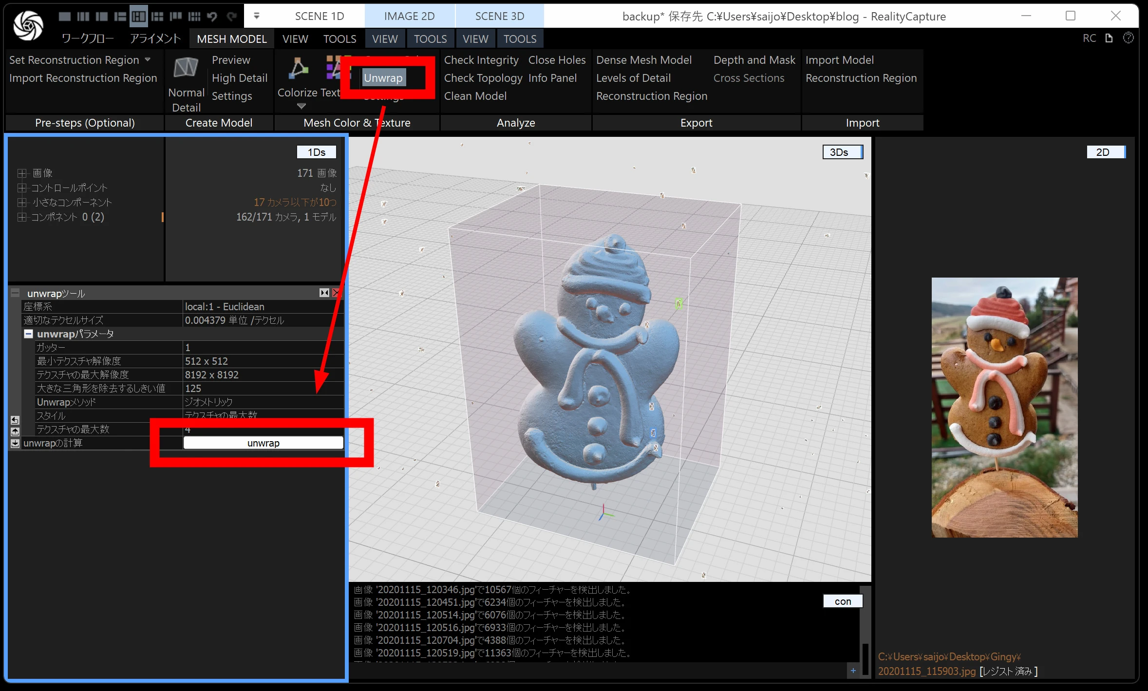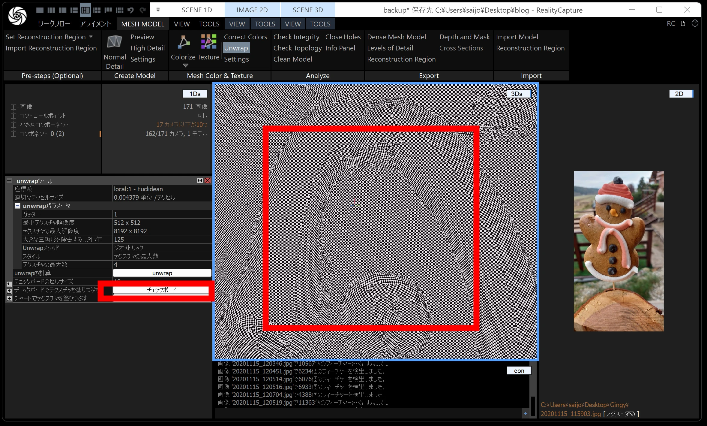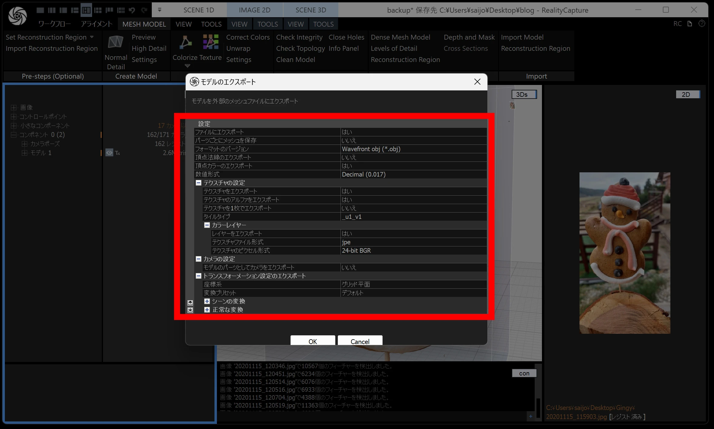 メッシュモデルは、点群から メッシュ(三角形ポリゴン) を作る工程です。時間がかかるので、通常モデル・画像の縮小を 2 くらいにしておくと負荷が下がります。