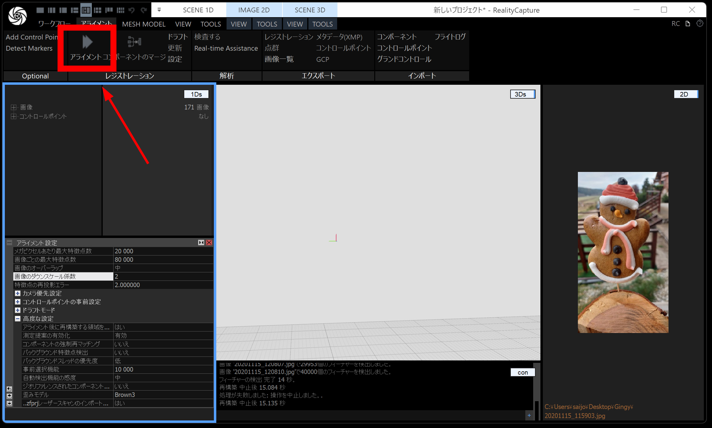 アライメント を実行します。アライメントとは、画像を三角測量などで解析して 点群 を作る処理です。