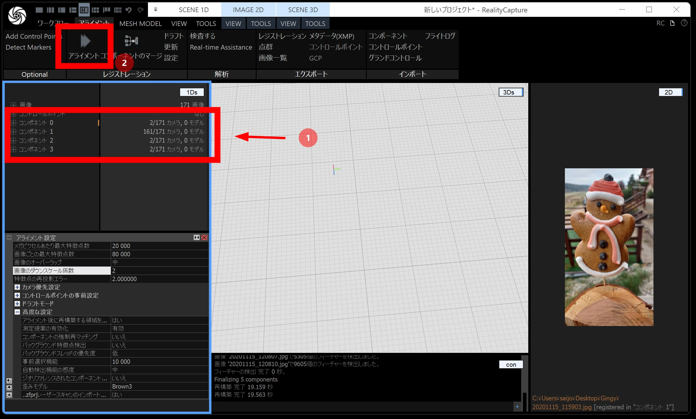 終わると画像が コンポーネント に分かれます。1 回目ではまとまる枚数が少ないことがあるので、2〜3 回 アライメントを繰り返します。