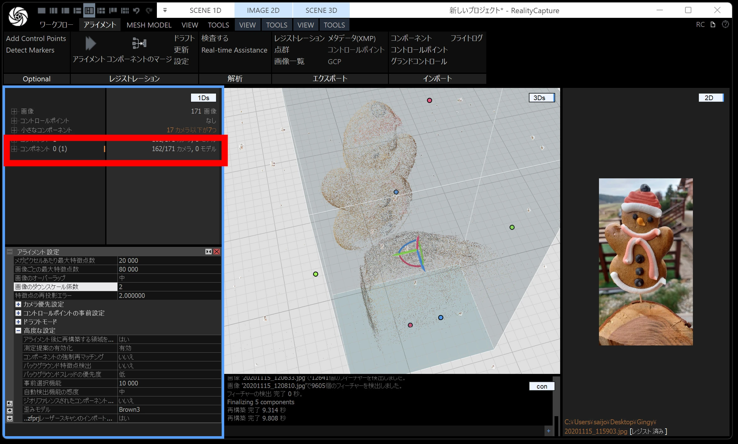 2 回繰り返すと、1 つのコンポーネントに含まれる枚数が増えた例です。これでよしとしましょう。まとまる枚数が多いほど、点群の完成度が上がります。できるだけ多く統合されるようにします。