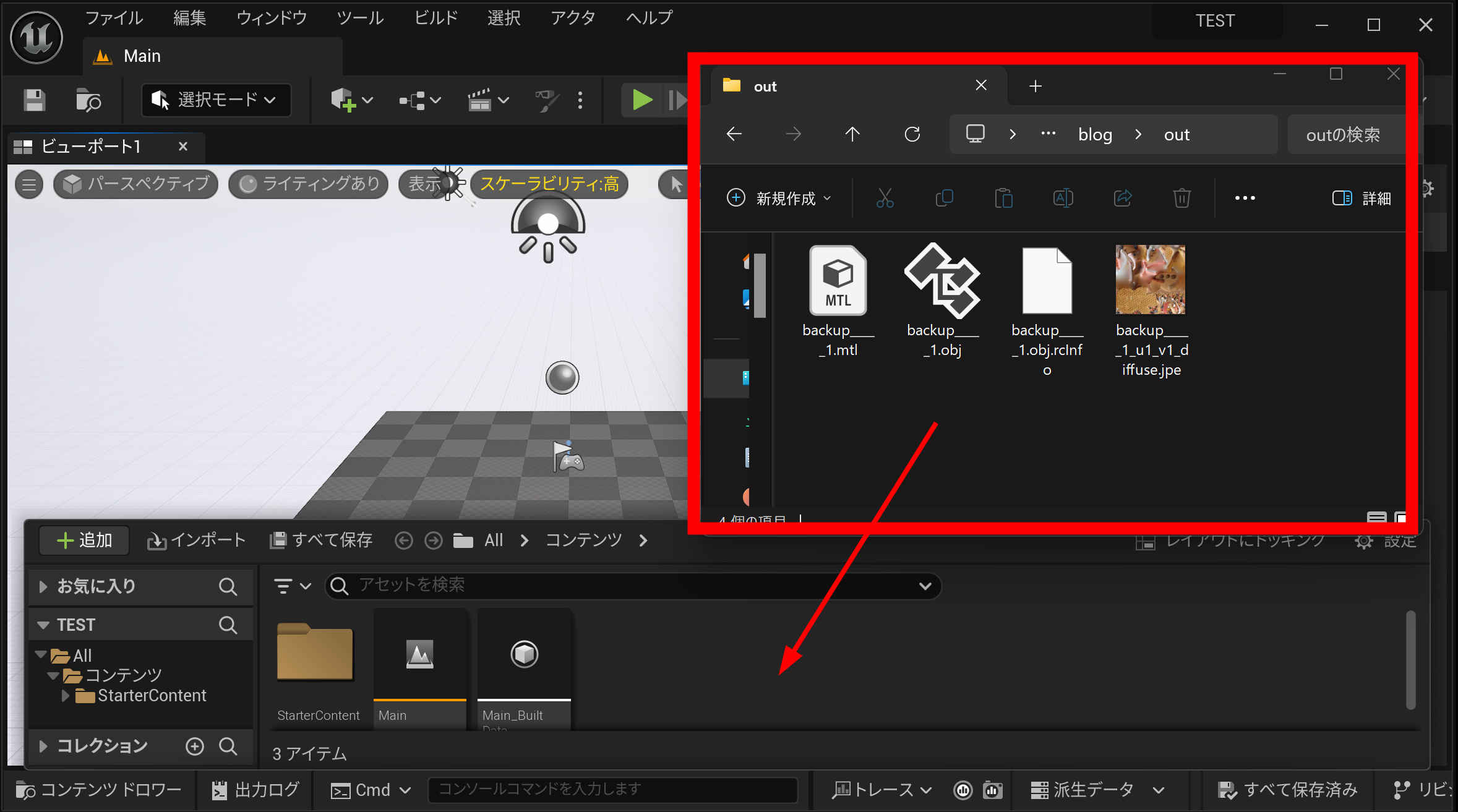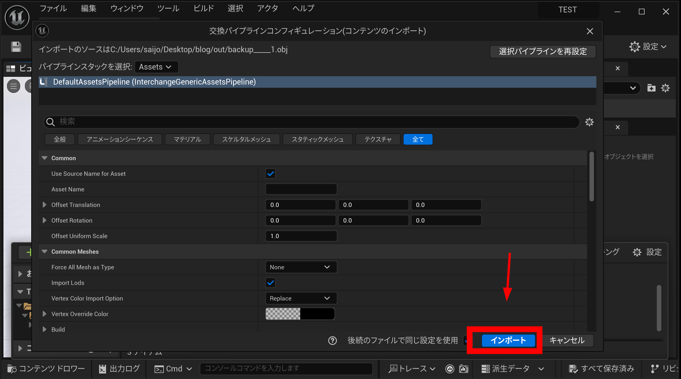 書き出した OBJ を コンテンツブラウザ にドラッグして取り込みます。
