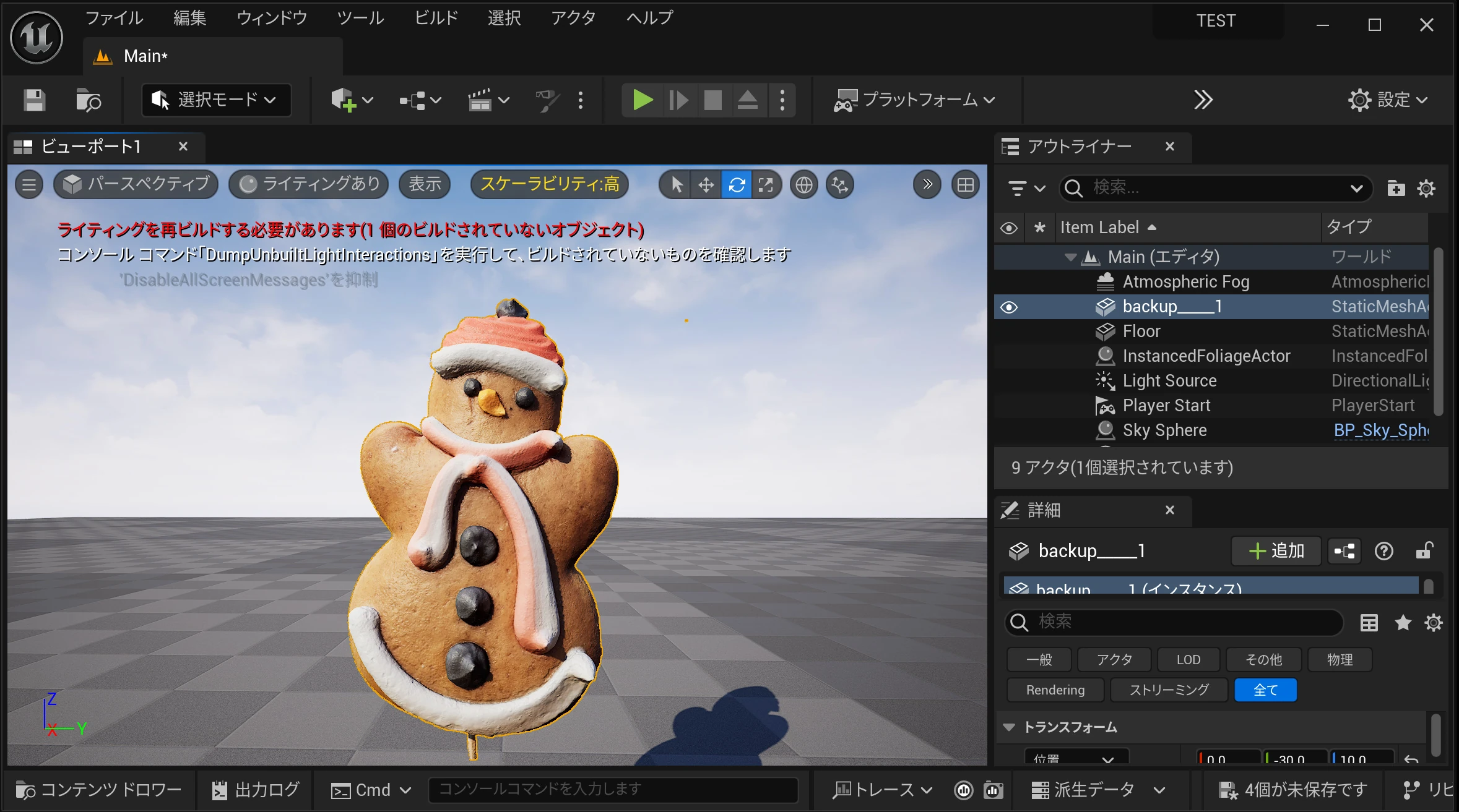 レベル内に 3D モデルを置けました。本番では Lit / Unlit、メッシュ品質、マテリアル・テクスチャ などの理解が必要になってきます。今回は「3D 化して取り込める楽しさ」を体感するための説明でした。UE5 に慣れていないと、取り込みだけでも少し苦労するかもしれません。