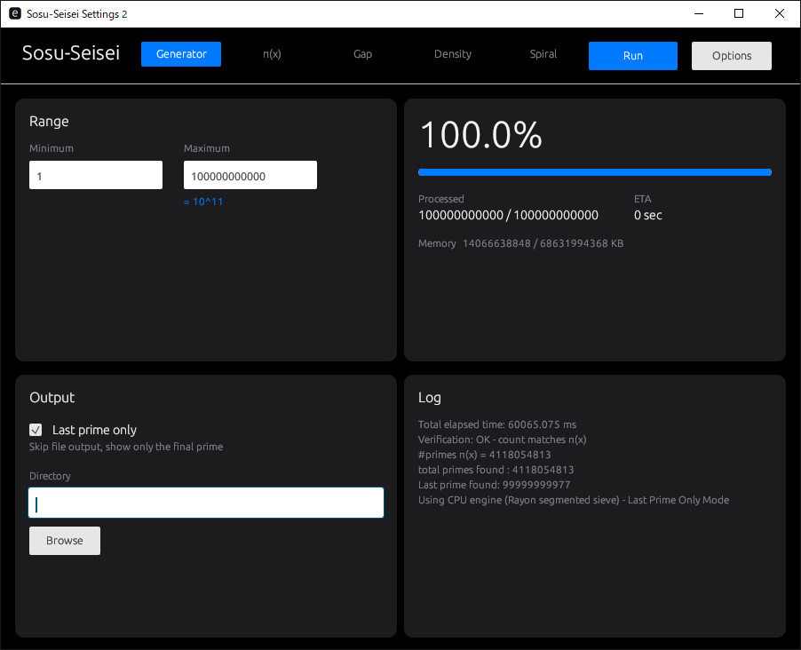 使い方は簡単です。数字の範囲を指定してRunするだけです。オプションなど細かい機能もあります。指定したフォルダーに書き出せます。Last prime onlyは書き出さないモードなので、書き出したいときは☑を外しましょう。