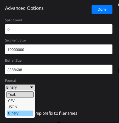 素数のフォーマットはText、CSV、JSON、Binaryなどを選べます。Binaryにすると無駄がなくて速いです。
