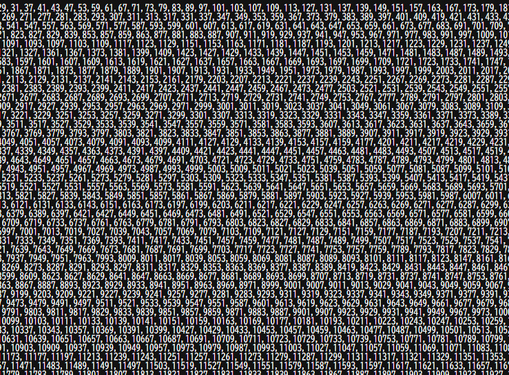 素数はランダム的なはずなのに、なぜか線や筋のように見えたり、逆にある方向だけ空いていたりします。この筋が見える理由は、そうなるのは明確な理由がありますが、どうしてそうなるのかを考えてみるのも面白いです。
