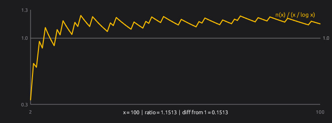 比率 π(x)/(x/log x) は 1.1513 で、予想より約15%多い状態です。