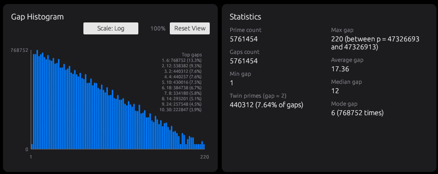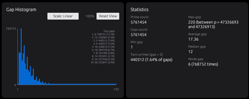 Gapタブでは、連続する素数同士の差、つまり素数ギャップを集めて、どのギャップがどれくらい出るのかをヒストグラムで表示します。表示はLinearとLogを切り替えられます。Linearでは小さいギャップの多さが直感的に分かり、Logでは回数の少ない大きなギャップまで形として見えます。