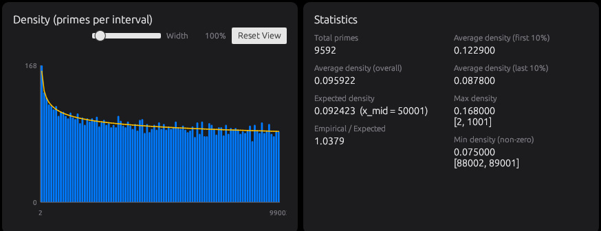 Densityタブでは、区間ごとに素数が何個出たかを数え、素数の密度をグラフにします。たとえば幅1000なら、1〜1000、1001〜2000のように区切って、それぞれの区間に素数が何個あるかを並べて見られます 素数は大きくなるほど出にくくなるので、密度は全体として下がっていきます。