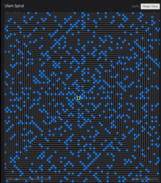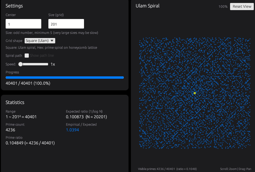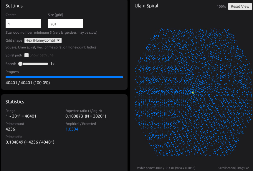 表示方法はSquare(Ulam)とHex(Honeycomb)を切り替えられ、同じ範囲でも格子の違いで模様の出方が変わるのも特徴です。必要に応じて渦巻きの経路線を重ねて表示し、数字がどの順番で配置されているかも確認できます。Ulamの渦はただ見ているだけでも楽しめます。