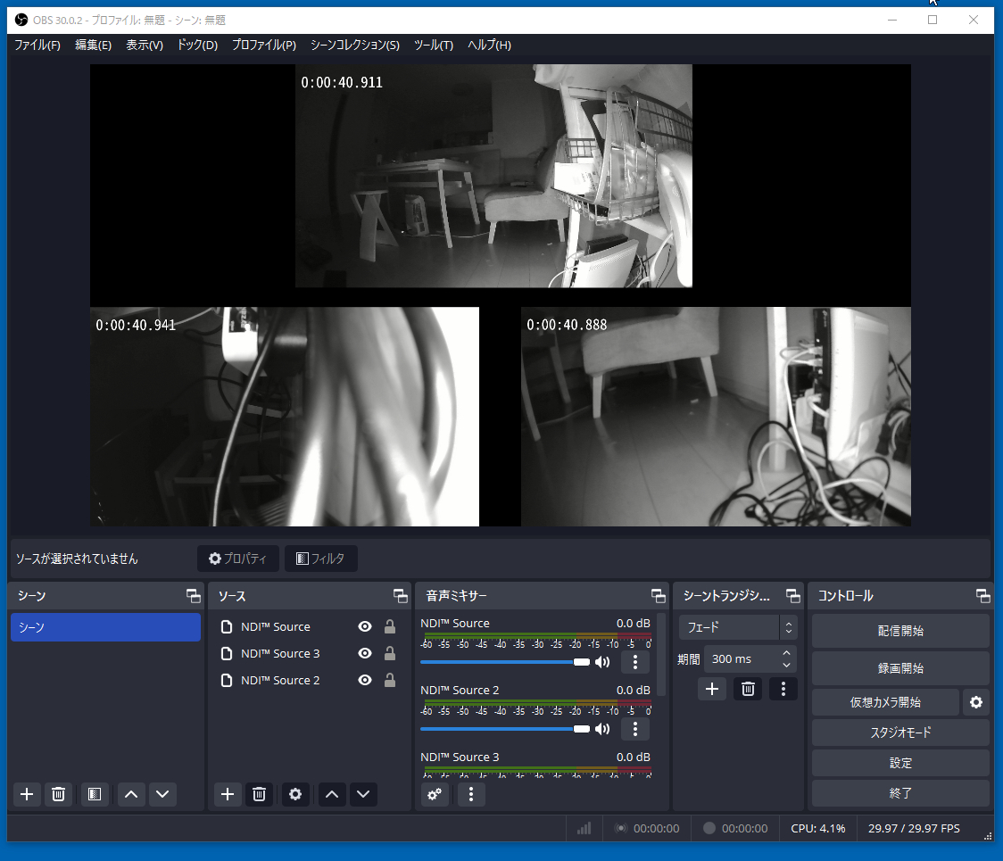camera.shを実行すると3つのUSBカメラの映像がNDIで流れます。