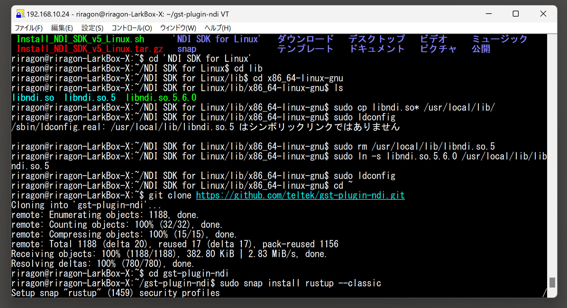 RusのインストールマネージャーrustupをSnap経由でインストールします。Cargo、Rustのパッケージマネージャをインストールします。GStreamerのNDIプラグインをビルドします。