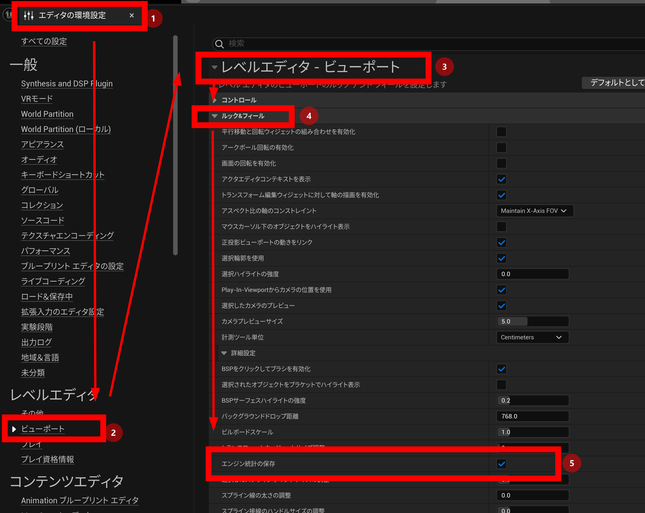 エディタを再起動すると表示が消えてしまいます。消えないようにする方法はエディタの環境設定から、ビューポート、ルック&フィール、エンジン統計の保存をクリックします。これでエディタを再起動しても再表示されます。