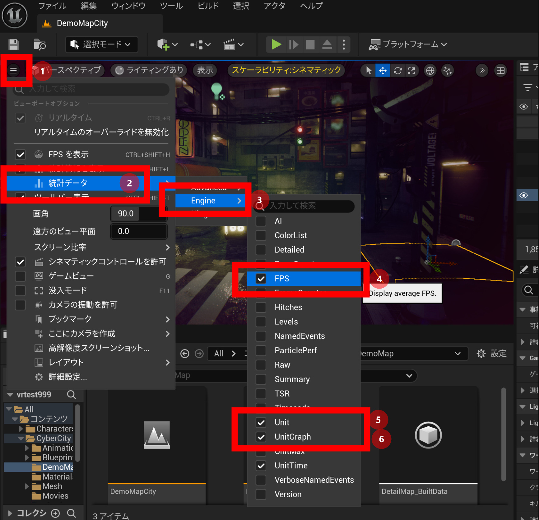 動作のボトルネック調査の第一歩は「stat unit」など統計データです。コンソールに「stat unit」を入力する方法もありますが、①画面の左上のメニューをクリックします。②統計データ、③Engine、④FPSにチェック、⑤UnitとUnitGraphにチェックを入れます。簡単な方をお使いください。