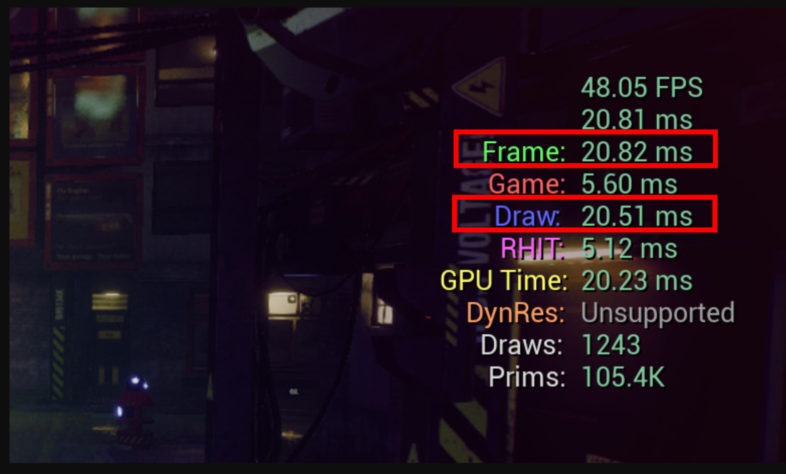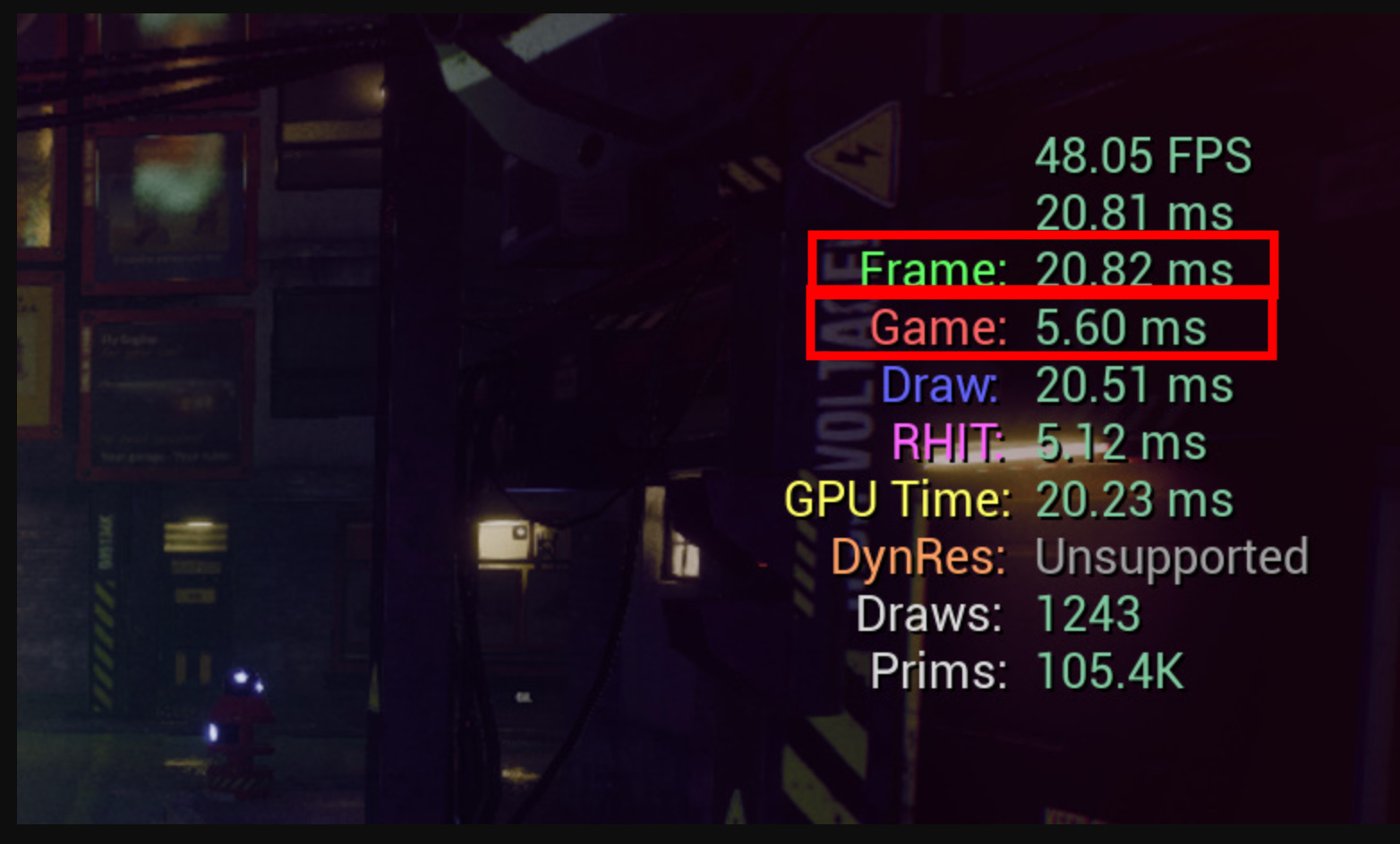 実際のFrame時間は、Game・Draw・GPUのいずれか遅い方によって決まります (Meaning of Frame, Game, Draw when using Stat UnitGraph - Debugging, Optimization, & Profiling - Epic Developer Community Forums)。