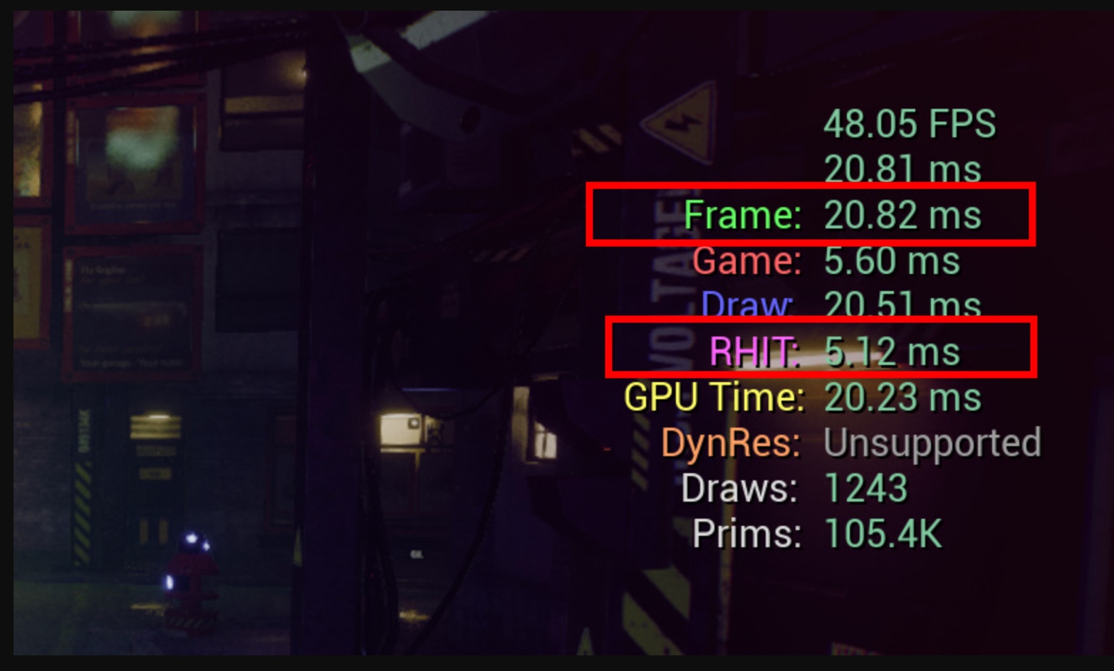 RHI(Render Hardware Interface)スレッドは、レンダリングを制御するための低レベルAPIと通信します。この時間がフレーム時間に近い場合、レンダリングAPIの呼び出しに問題がある可能性が指摘されます。以下は近くないので問題がなさそうです。