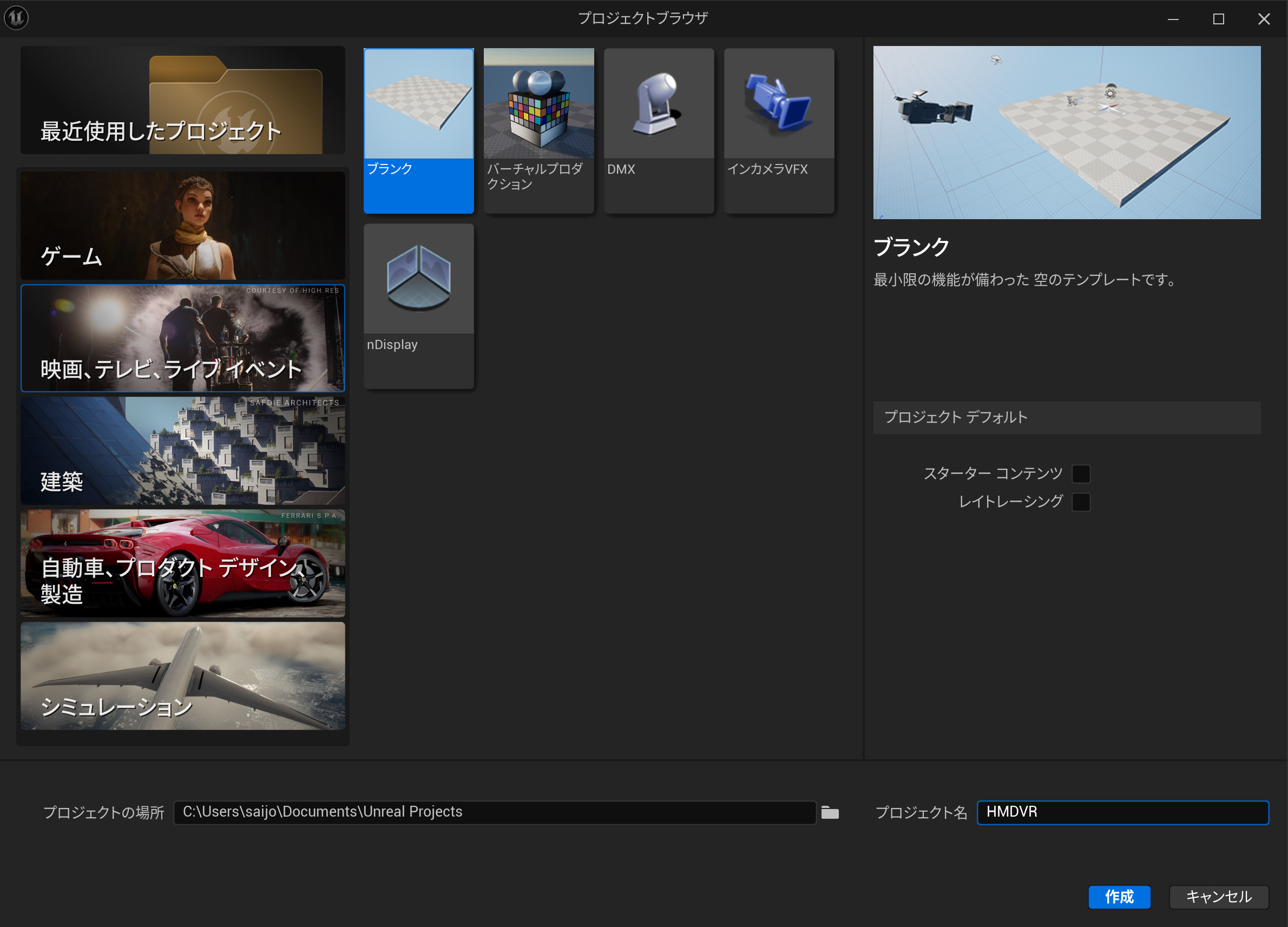 まあ適当にUE5のプロジェクトを作ります。映画→ブランクで作りました。